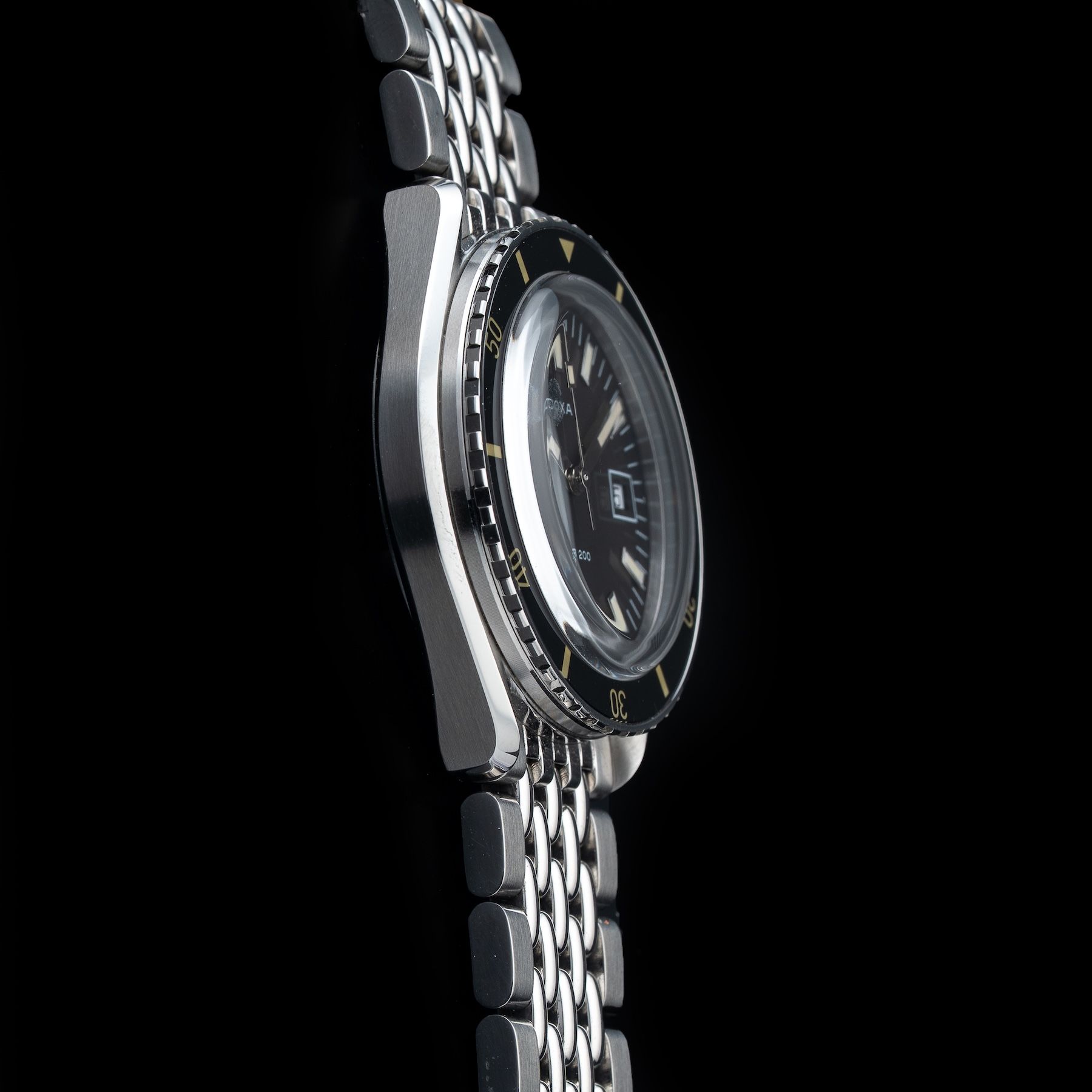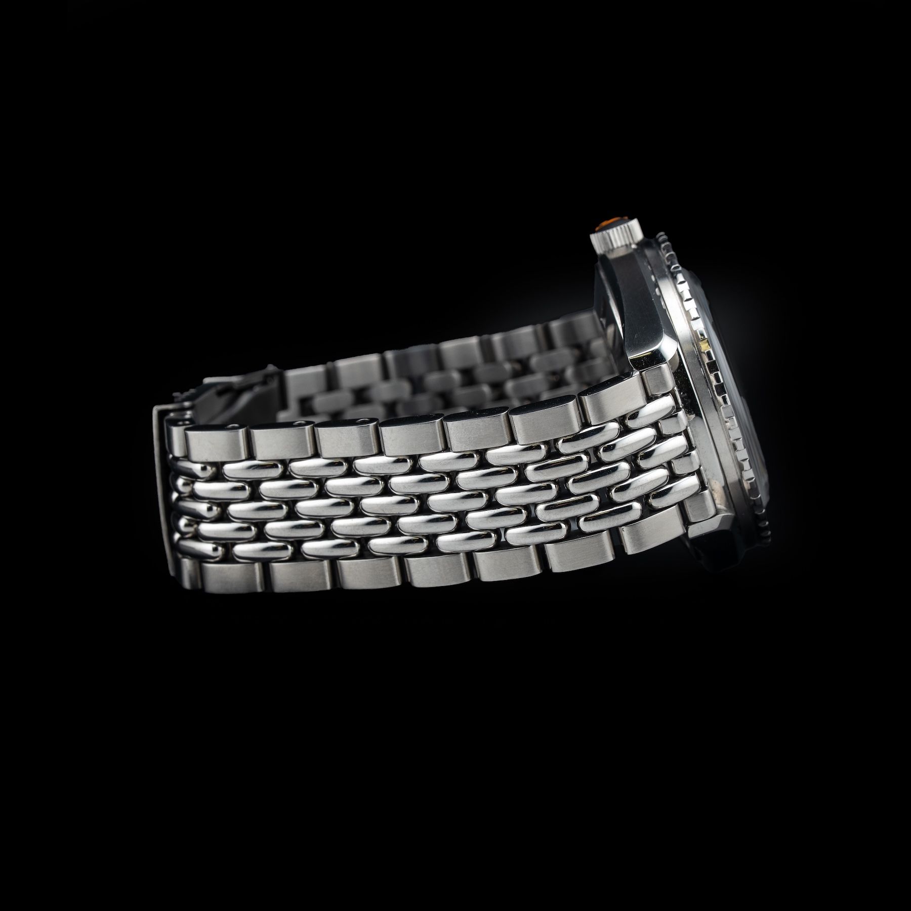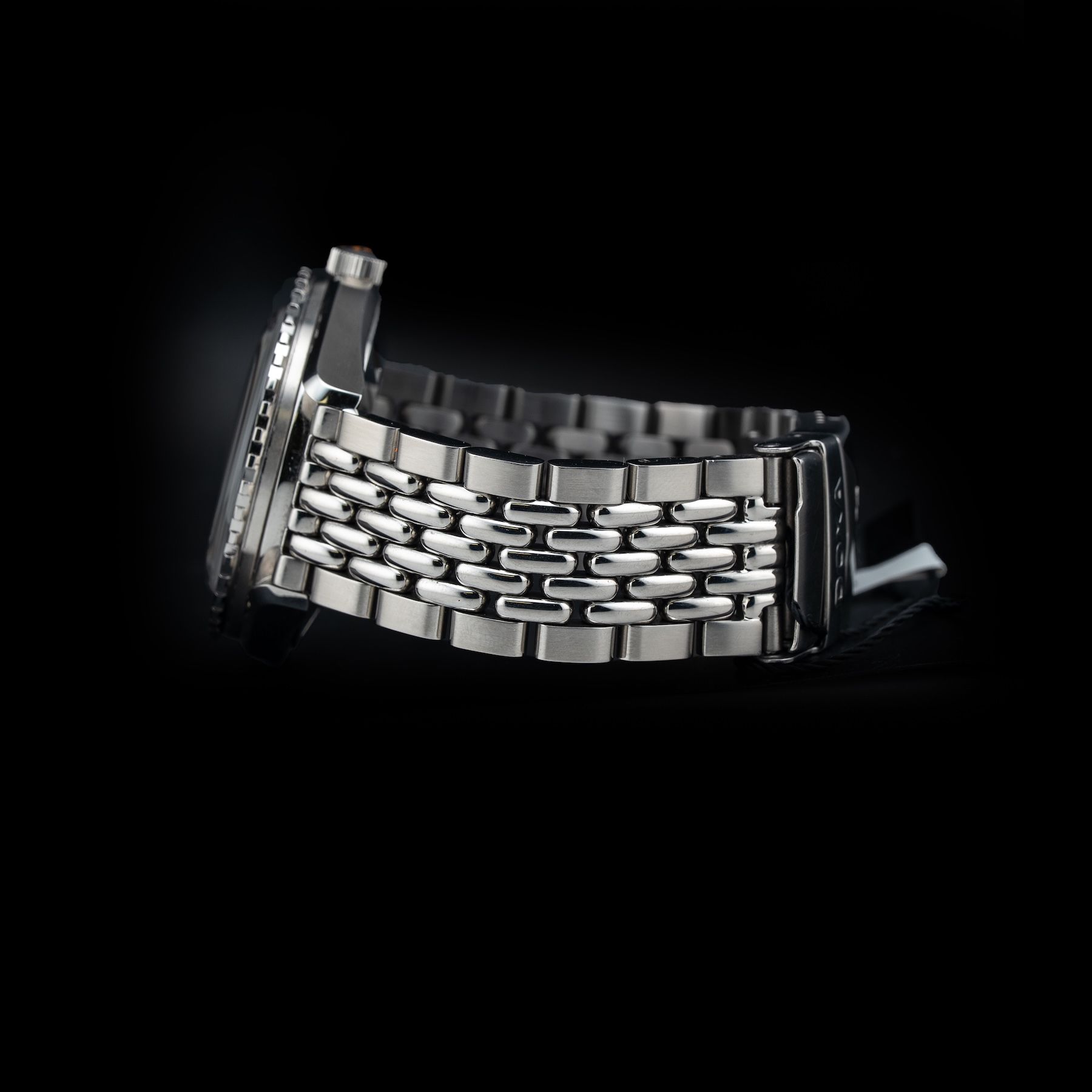 This watch features a 42mm stainless steel case on stainless steel bracelet. This watch also sports a black dial. Powered by a Swiss mechanical automatic movement. Water resistance up to 200 meters.