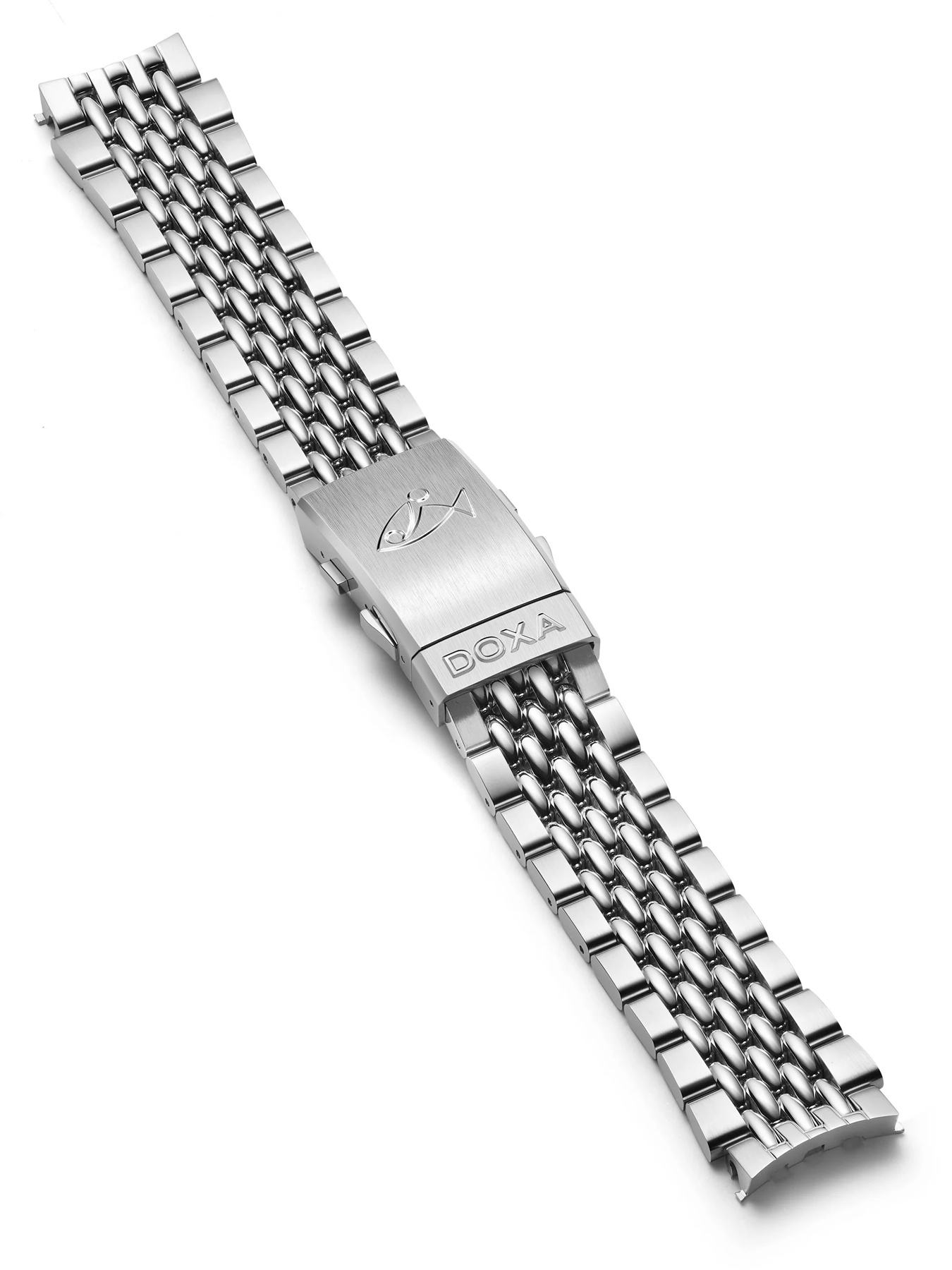 The famous DOXA “grains of rice” bracelet, also crafted from 316L steel and featuring a folding clasp with diving extension and the DOXA fish symbol, rounds off this purpose-designed classic.