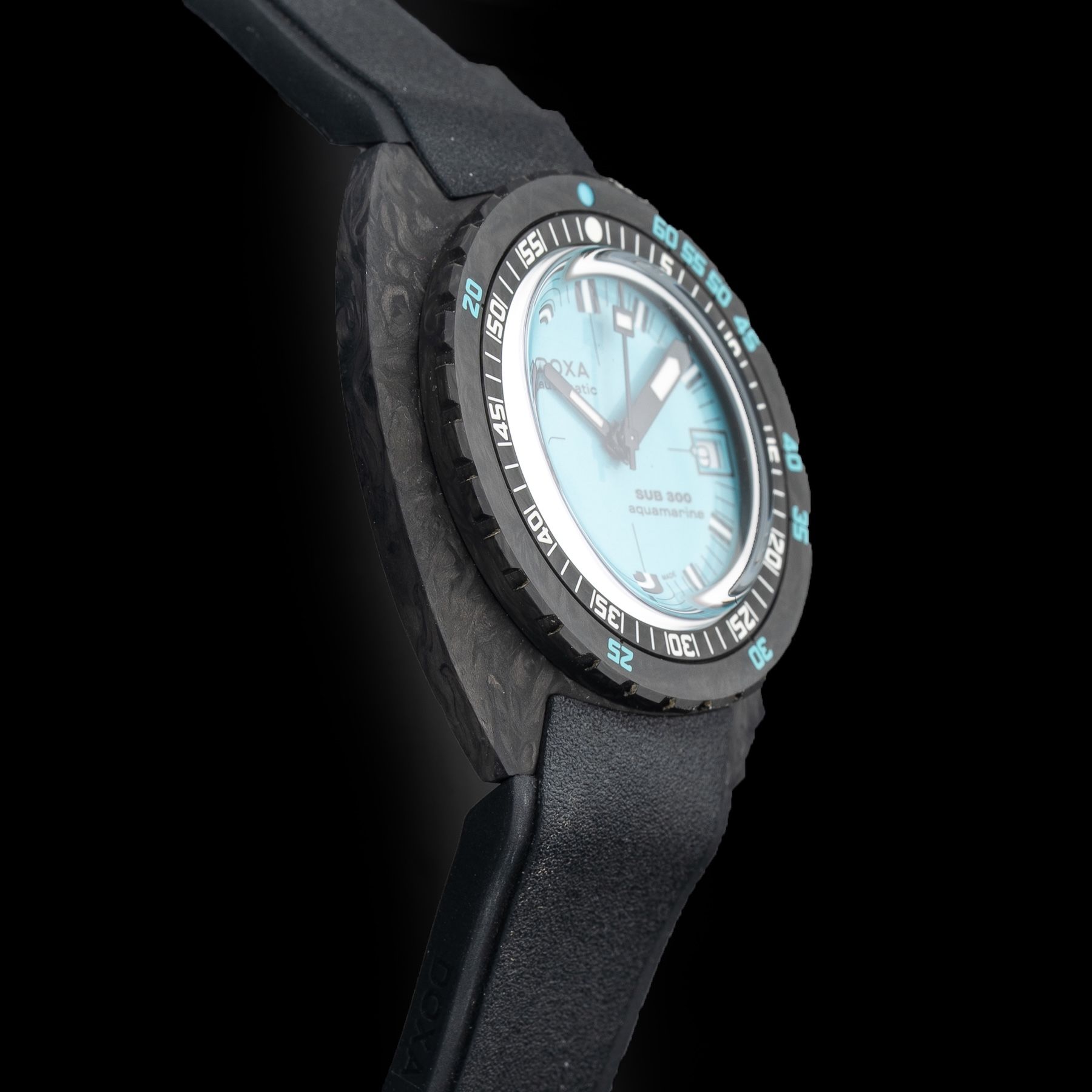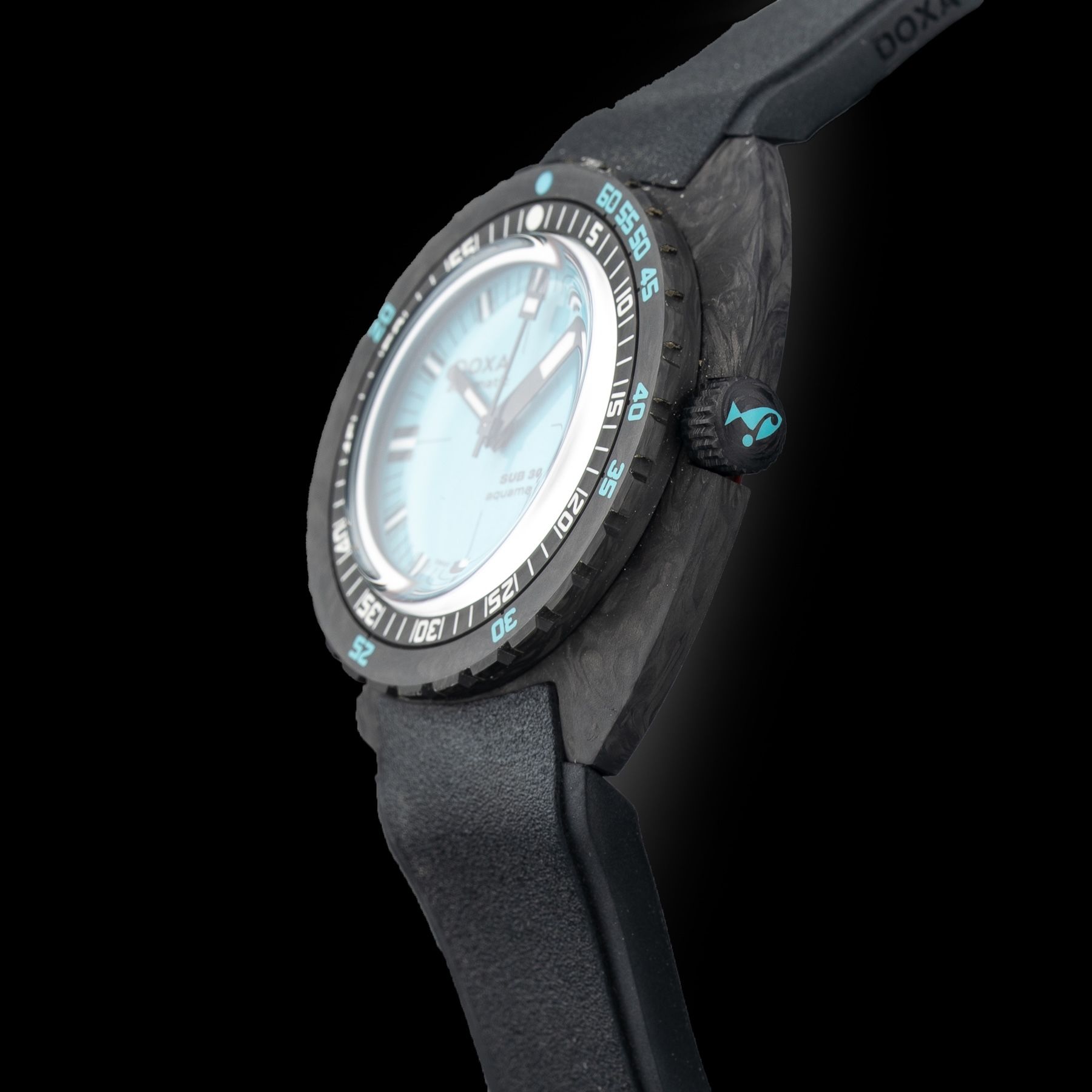 - This timepiece features a 42mm carbon case paired with a high quality rubber strap. It showcases a distinctive turquoise dial and is powered by a precise automatic winding movement. The watch is designed with a water resistance of up to 300m.