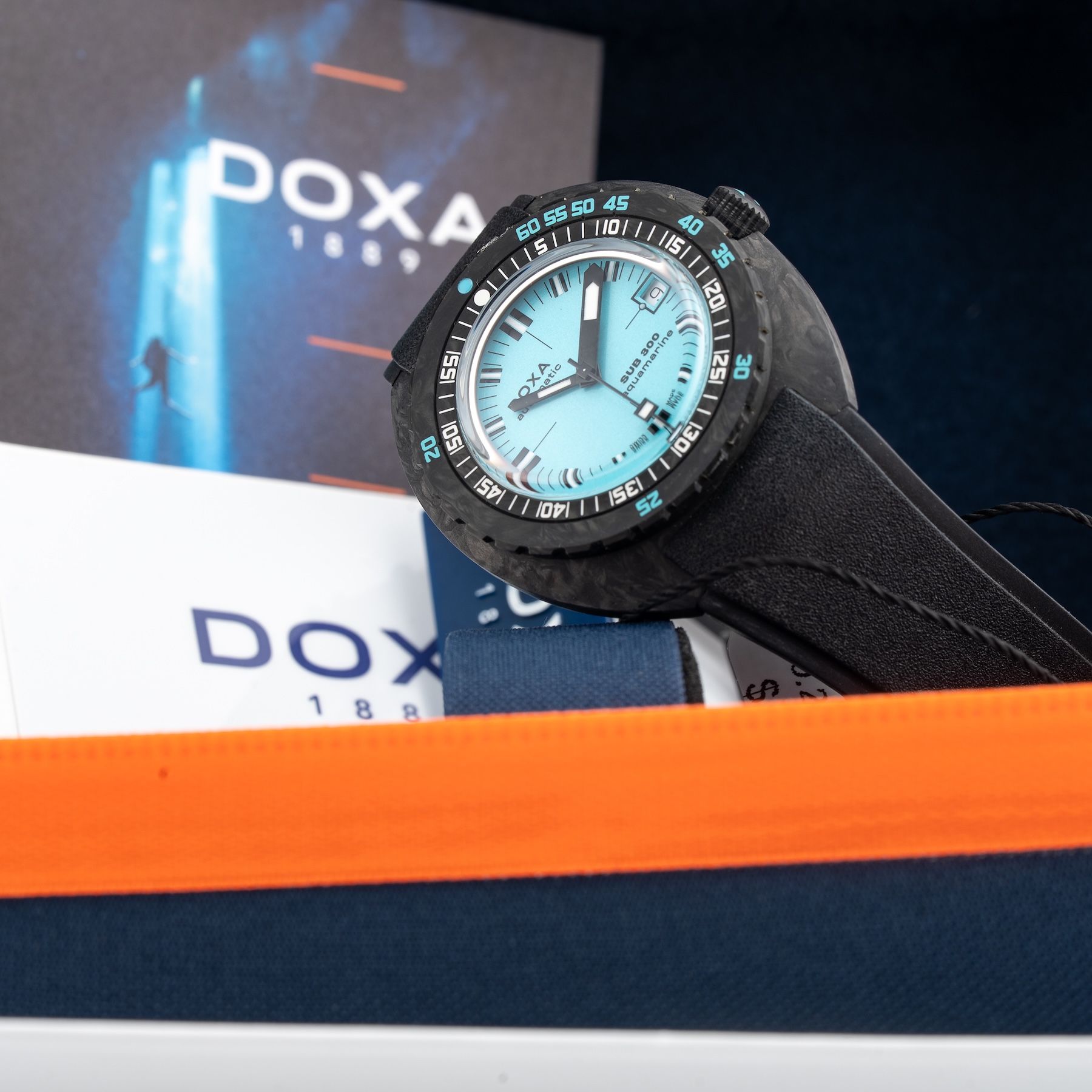 This DOXA Sub 300 Carbon Aquamarine 822.70.241.20 on Strap is in GREAT condition, it has box, papers and warranty card. This watch has been fully authenticated and certified by Exquisite Timepieces. Please note, the photos shown are of the actual watch you will receive.