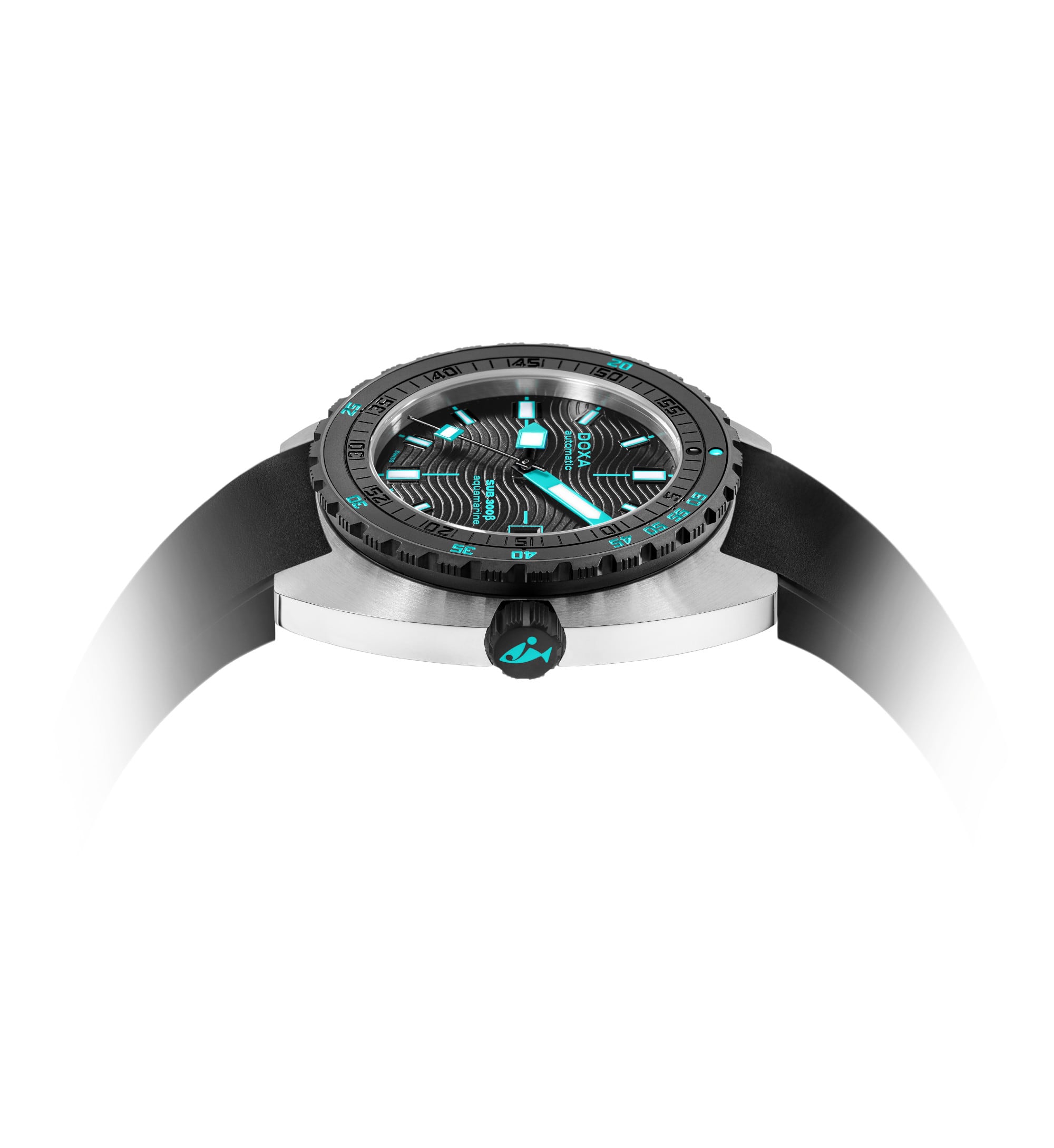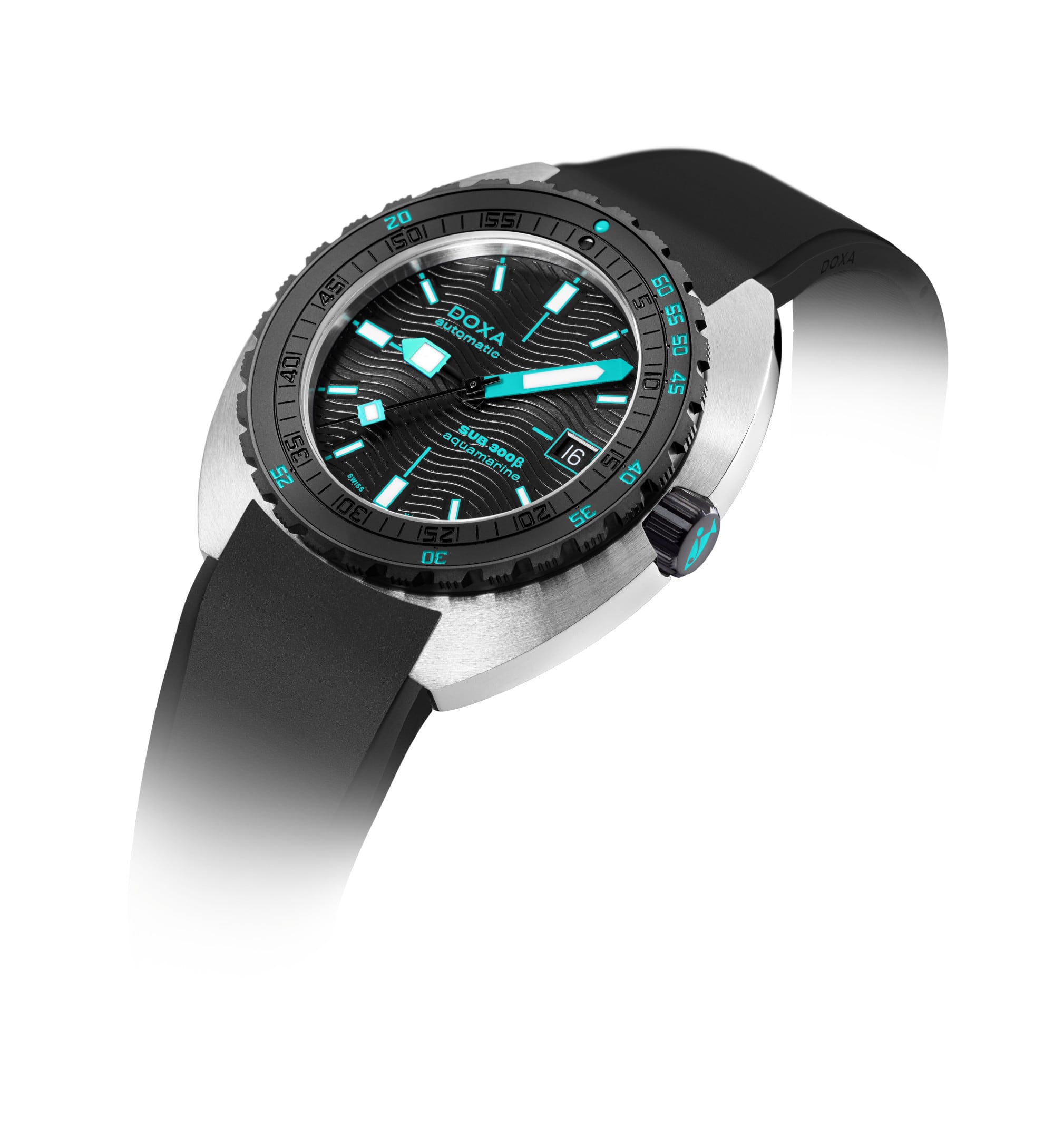 The SUB 300β sports watch combines functionality with style, maintaining foundational tool watch features in a redesigned 42.5 mm diameter case, now slimmer at 11.95 mm. The black ceramic bezel and screw-down crown enhance its sport-chic character, complemented by a sophisticated sunburst dial finish. Available with an FKM rubber strap or stainless-steel "Beads of Rice" bracelet, both featuring a ratcheting folding clasp, the watch is water-resistant up to 300 meters. With a scratch-resistant sapphire crystal, Swiss automatic movement, and a power reserve of around 38 hours, the SUB 300β is engineered for safety and exploration. True to DOXA's unconventional ethos, it blends the spirit of the times with an elegant, modern sport-chic look suitable for urban settings.