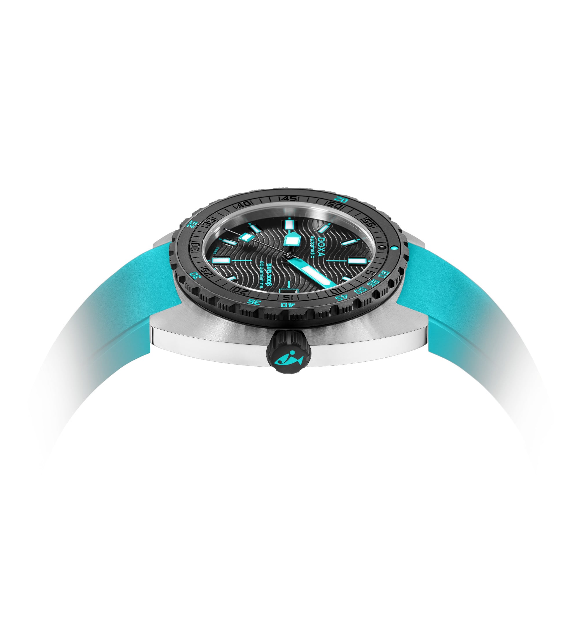The SUB 300β sports watch combines functionality with style, maintaining foundational tool watch features in a redesigned 42.5 mm diameter case, now slimmer at 11.95 mm. The black ceramic bezel and screw-down crown enhance its sport-chic character, complemented by a sophisticated sunburst dial finish. Available with an FKM rubber strap or stainless-steel "Beads of Rice" bracelet, both featuring a ratcheting folding clasp, the watch is water-resistant up to 300 meters. With a scratch-resistant sapphire crystal, Swiss automatic movement, and a power reserve of around 38 hours, the SUB 300β is engineered for safety and exploration. True to DOXA's unconventional ethos, it blends the spirit of the times with an elegant, modern sport-chic look suitable for urban settings.