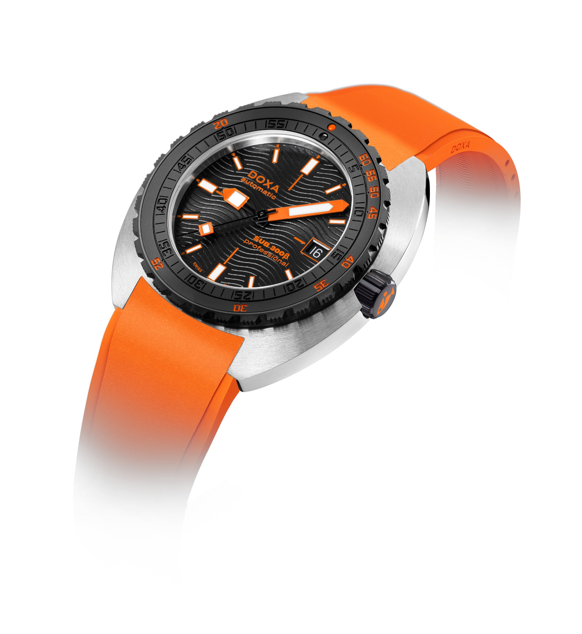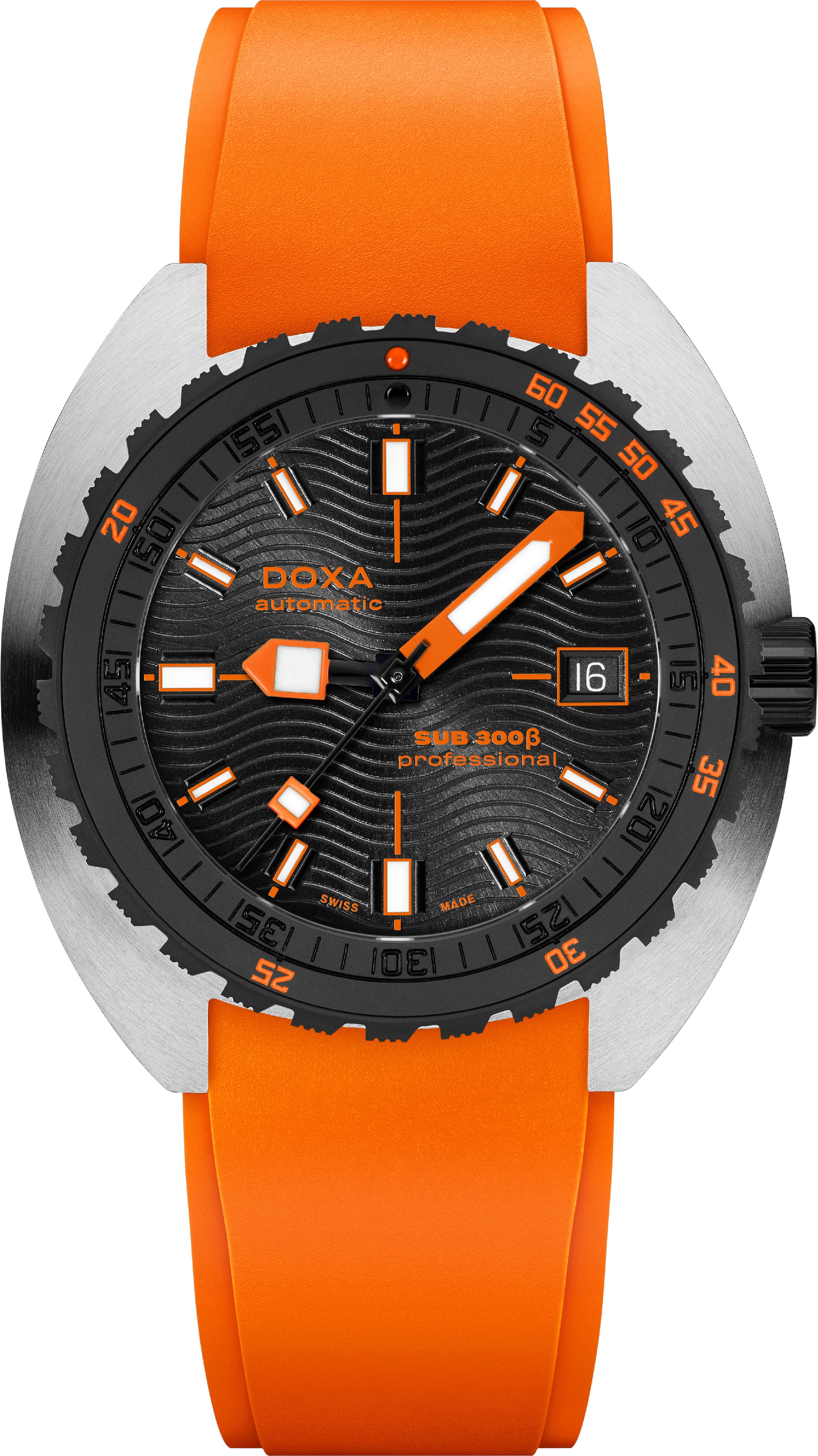The SUB 300β sports watch combines functionality with style, maintaining foundational tool watch features in a redesigned 42.5 mm diameter case, now slimmer at 11.95 mm. The black ceramic bezel and screw-down crown enhance its sport-chic character, complemented by a sophisticated sunburst dial finish. Available with an FKM rubber strap or stainless-steel "Beads of Rice" bracelet, both featuring a ratcheting folding clasp, the watch is water-resistant up to 300 meters. With a scratch-resistant sapphire crystal, Swiss automatic movement, and a power reserve of around 38 hours, the SUB 300β is engineered for safety and exploration. True to DOXA's unconventional ethos, it blends the spirit of the times with an elegant, modern sport-chic look suitable for urban settings.