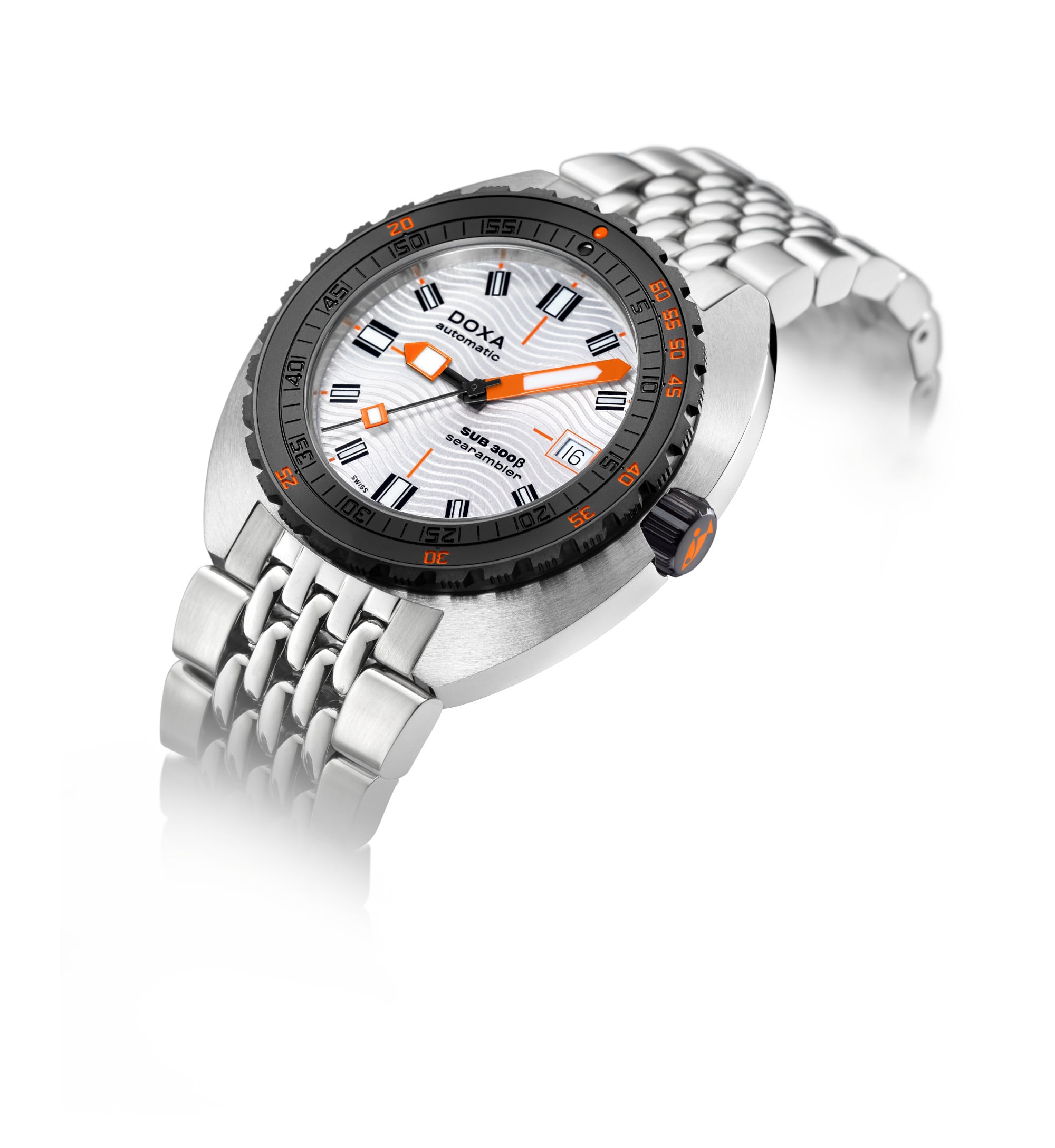 The SUB 300β sports watch combines functionality with style, maintaining foundational tool watch features in a redesigned 42.5 mm diameter case, now slimmer at 11.95 mm. The black ceramic bezel and screw-down crown enhance its sport-chic character, complemented by a sophisticated sunburst dial finish. Available with an FKM rubber strap or stainless-steel "Beads of Rice" bracelet, both featuring a ratcheting folding clasp, the watch is water-resistant up to 300 meters. With a scratch-resistant sapphire crystal, Swiss automatic movement, and a power reserve of around 38 hours, the SUB 300β is engineered for safety and exploration. True to DOXA's unconventional ethos, it blends the spirit of the times with an elegant, modern sport-chic look suitable for urban settings.
