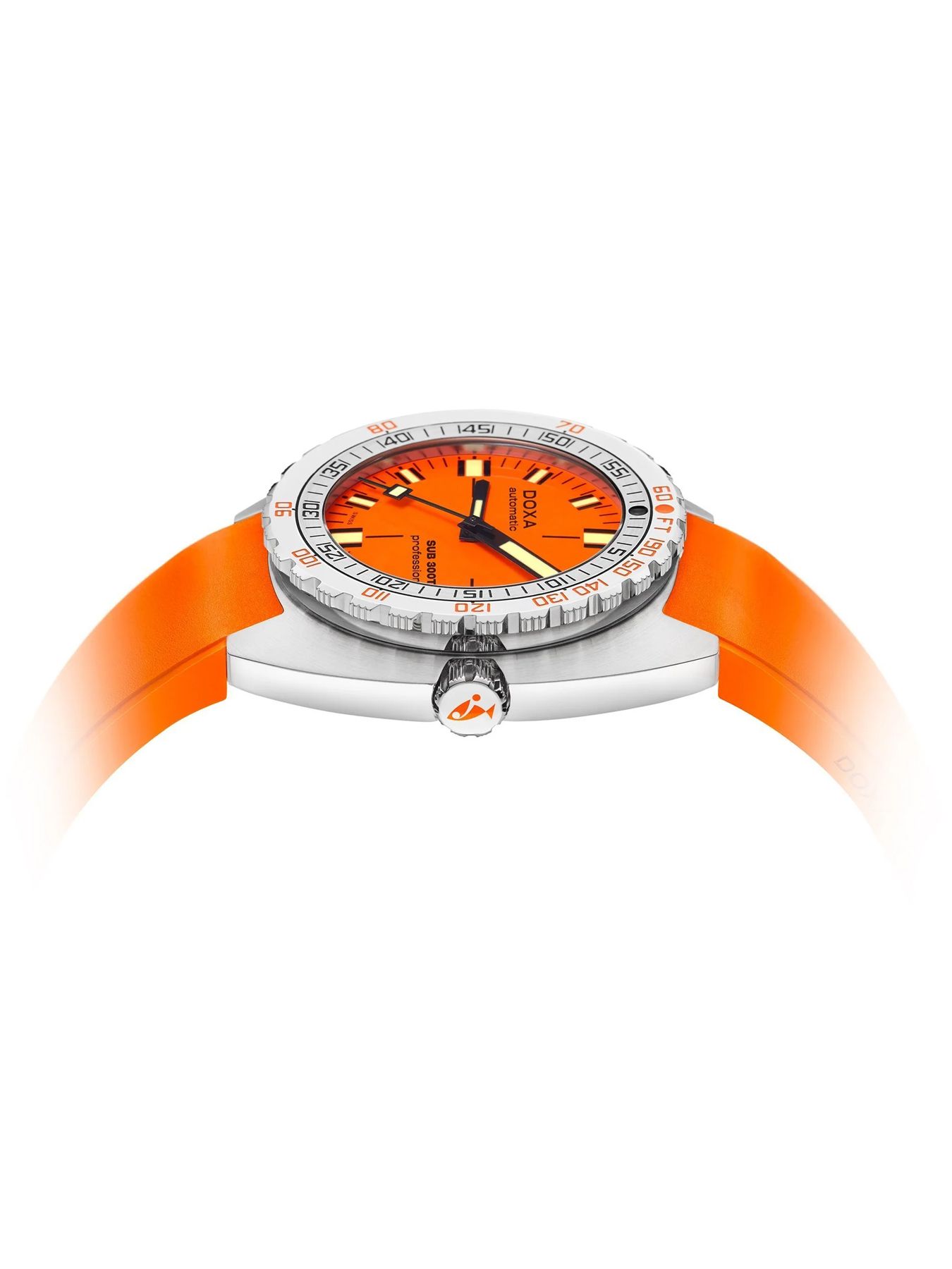 This 3-hand diver's watch, available in 6 dial colors, combines the aesthetic genes of the SUB 300T Conquistador with the technical refinements that define the high-performance diver's watch of today. Constructed from 316L stainless steel of the highest quality, the SUB 300T has a diameter of 42.5mm and a scratch-resistant sapphire crystal with an anti-reflective coating. Rated to withstand pressures up to 120 bar, this diver is effectively waterproof to a depth of 1,200 meters and features the patented unidirectional rotating bezel with an integrated no-decompression dive time calculator. All elements providing dive-relevant information are highlighted with a Super‑LumiNova® luminescent insert to ensure optimal legibility underwater. The bracelet is 316L stainless steel and features a folding clasp with the DOXA fish symbol.