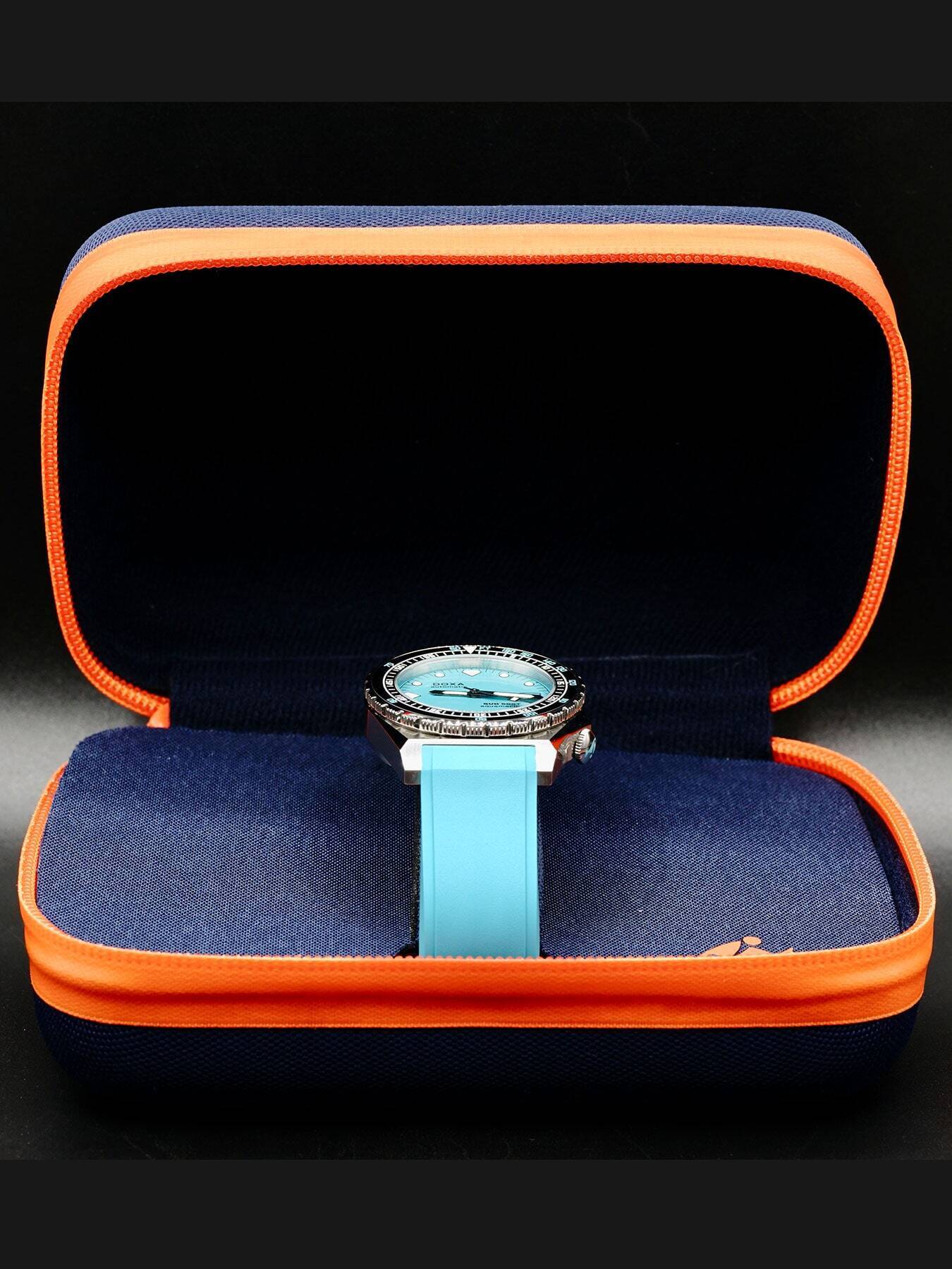 This Doxa Sub 600T Aquamarine features a 40mm stainless steel case with a solid case back on a turquoise rubber strap with a stainless steel buckle clasp. This watch also showcases a turquoise dial with luminous hands and dial markers covered by scratch resistant sapphire crystal.