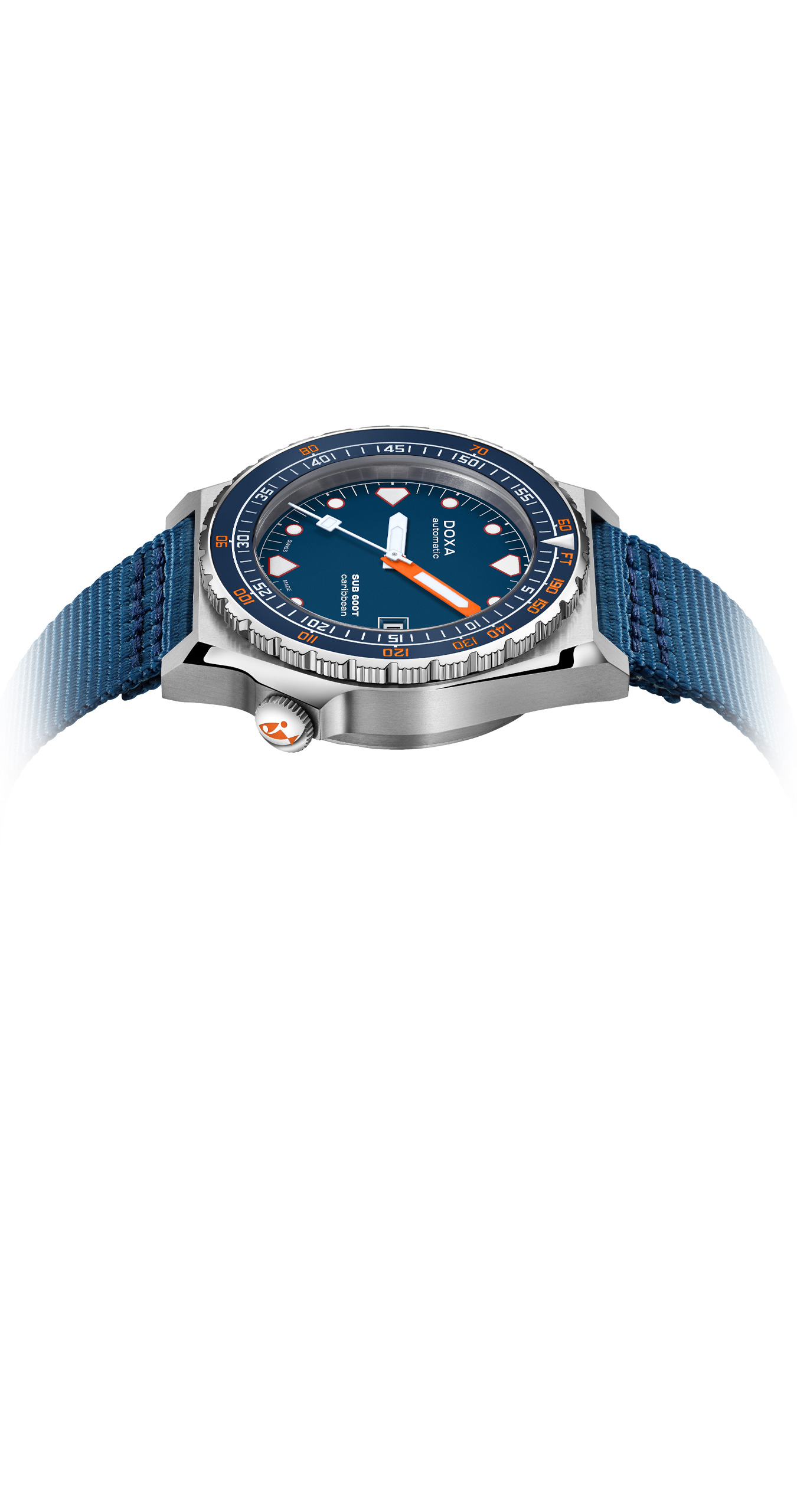 At 40mm, the case diameter of the DOXA SUB 600T remains unchanged – judging by the perceived expanse of the dial, one would never guess that this is in fact the smallest diameter in the family. Made of 316L stainless steel and topped with a sapphire crystal, the case, and thus the movement it protects, is pressure-resistant to 60 bar (600 meters). This leaves plenty of margin, even for the most ambitious diver as to the depths to explore. The crown is still at 4 o'clock and the patented rotating bezel unidirectional as it should be – to calculate a safe ascent without decompression stops. The bezel, with dual indication of the dive time (minutes) and depth (feet), can be ordered either with a sandblasted steel insert or with a black ceramic insert.