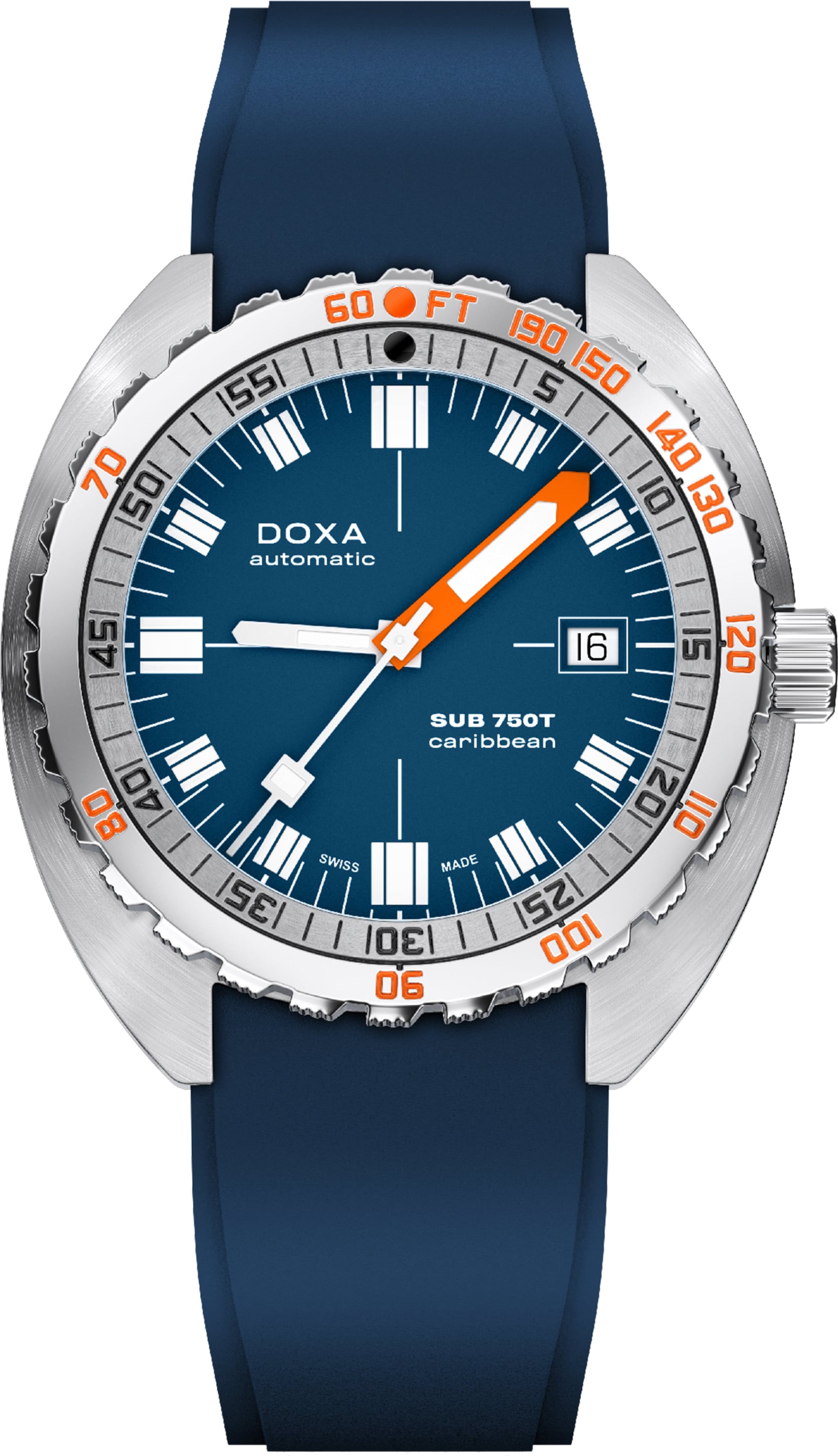 The SUB 750T comes in Professional Orange, Sharkhunter Black, Whitepearl White, Searambler Silver Grey, Caribbean Navy Blue, Divingstar Yellow, Aquamarine Turquoise, and Sea Emerald Dark Green – all eight of the DOXA SUB’s signature colorways. Each variant is fitted with either the iconic integrated “beads of rice” stainless steel bracelet or a lighter rubber strap, color-matched to the dial. As with every DOXA diver, all functional elements related to diving – indexes, hands, and bezel markers – are coated with Super-LumiNova® to ensure optimal legibility, whatever the conditions. A date window at 3 o’clock adds functionality.