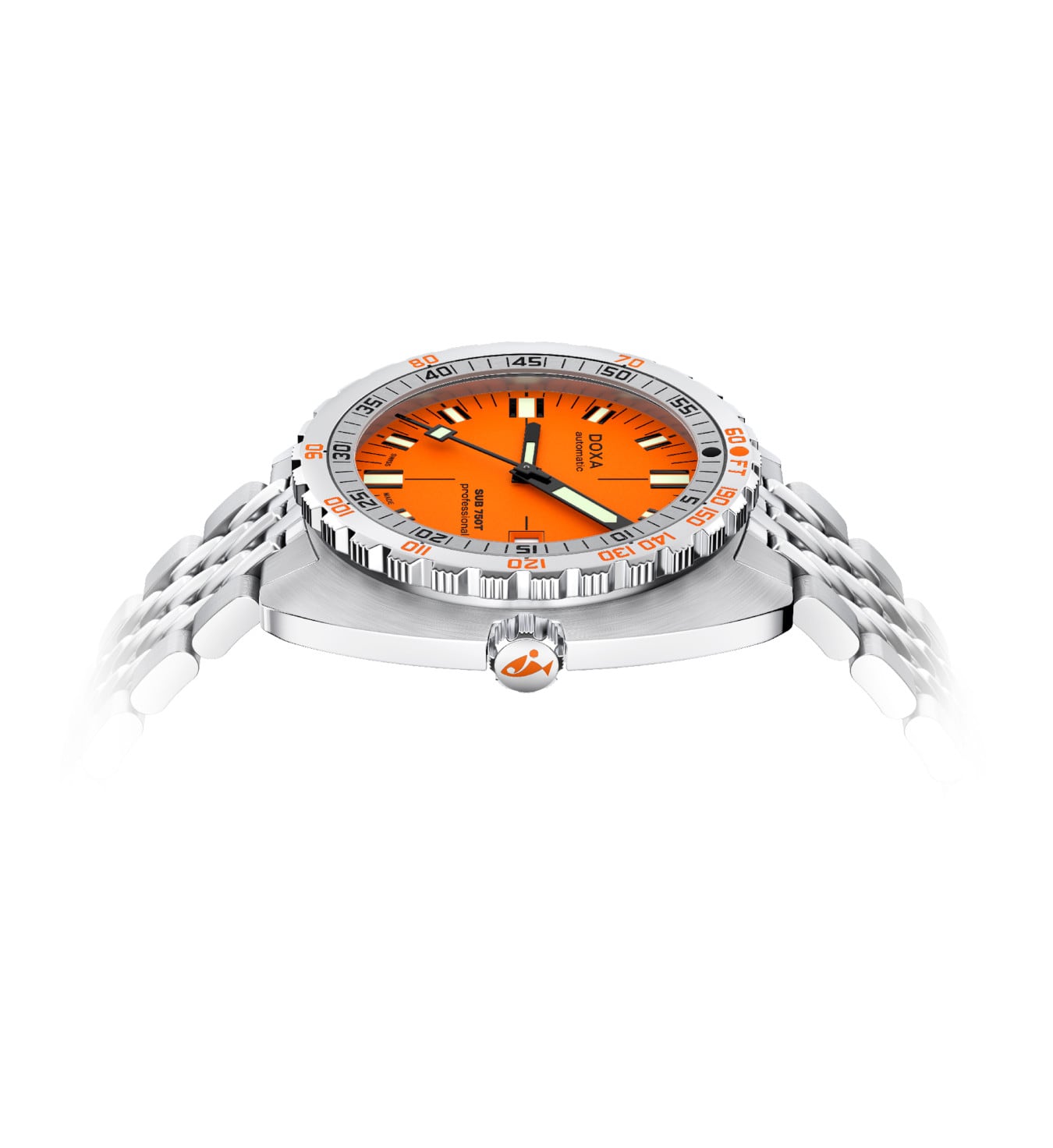 The SUB 750T’s stainless-steel case presents an assertive silhouette with sharp chamfers, angular lines, and a screw-down crown at 3 o’clock. It is equipped with DOXA’s patented oversized unidirectional rotating bezel for calculating and tracking no-decompression dive times. With water resistance rated to 750 meters (2,460 feet), the SUB 750T is built as a true, versatile tool watch, designed to perform in demanding environments – deep beneath the surface and high above it.