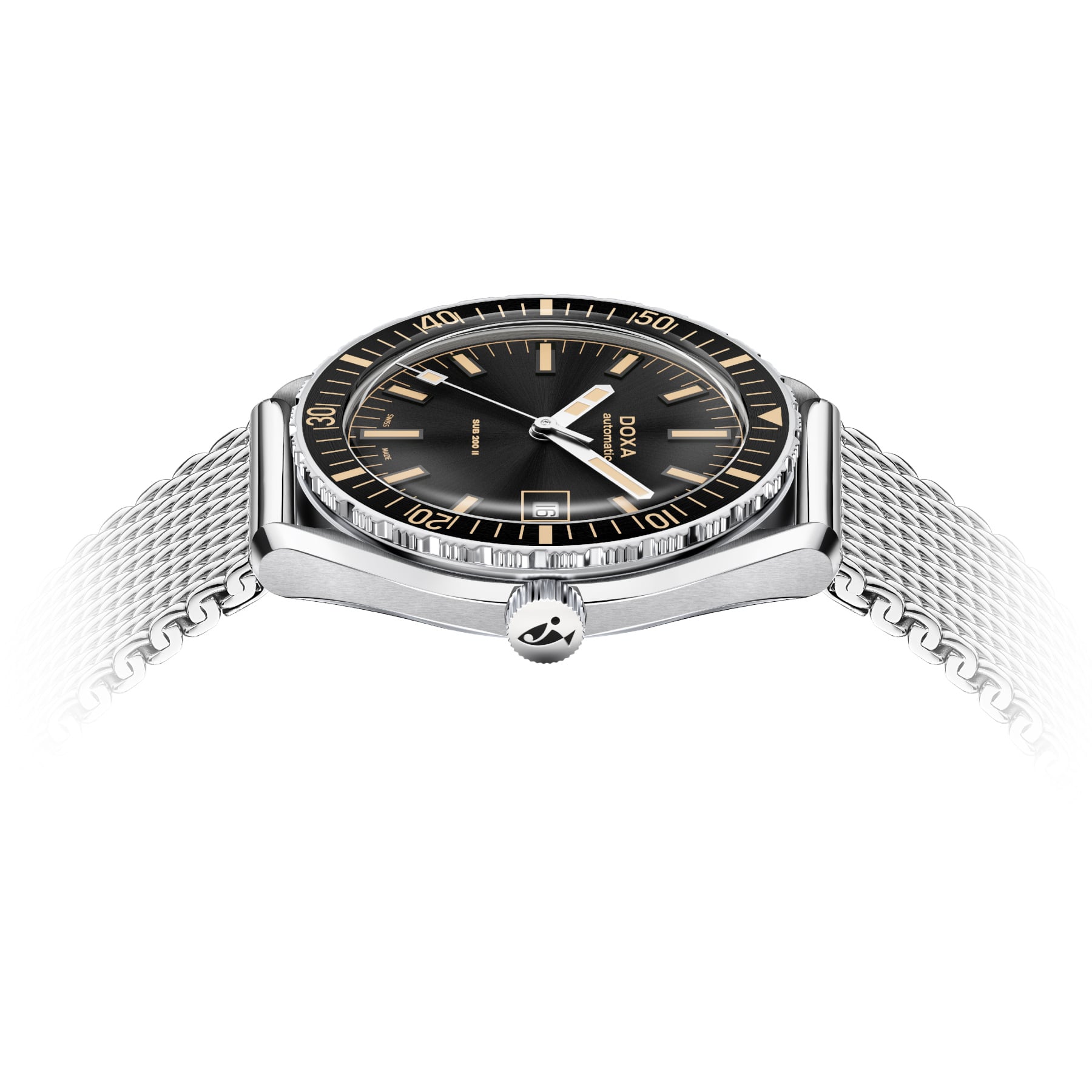 More than a stylistic detail, this treatment adds texture while maintaining DOXA’s hallmark legibility. The contrast between the gleaming center and the darker periphery reinforces the dial’s presence without disturbing its equilibrium, giving the SUB 200 II a more nuanced, contemporary personality – while keeping it firmly anchored in its professional dive watch heritage.