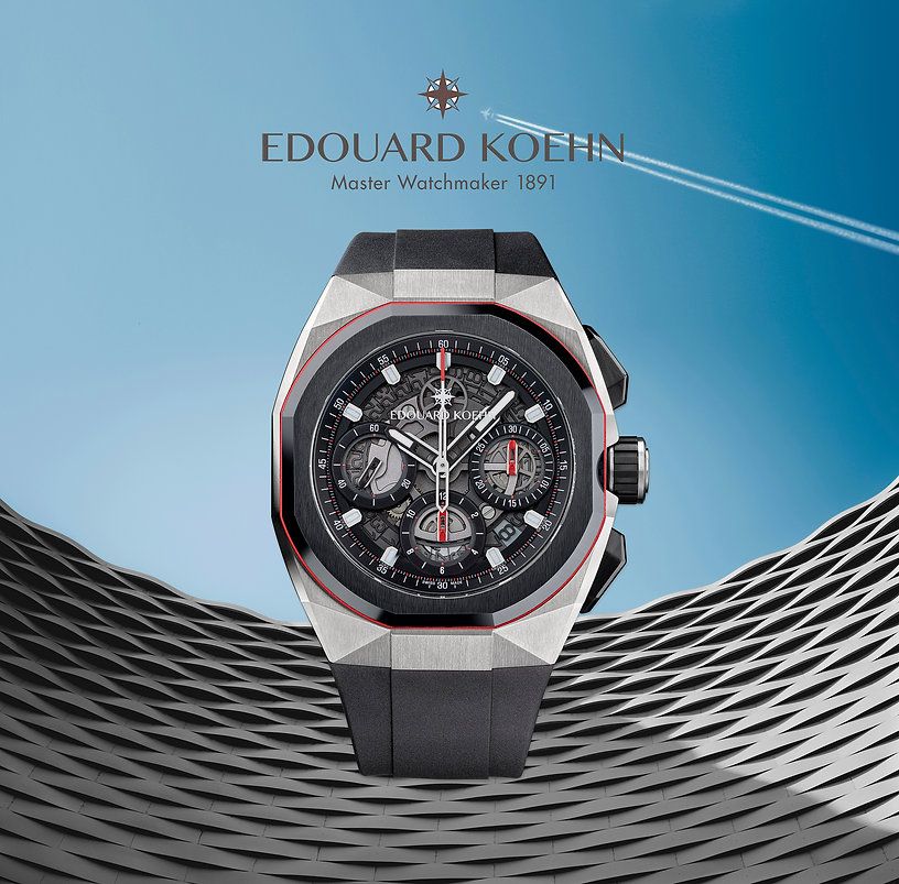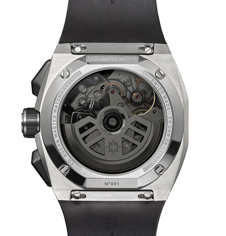 Edouard Koehn Tri-Compax self-winding mechanical Chronograph movement EKMVTCHR01, 245 components parts, entirely manufactured in La Chaux-de-Fonds, Switzerland. 27 rubies, 28’800 Vibrations per Hour (4 Hz) with oscillating weight mounted on ceramic ball-bearings. 48 hours power reserve.