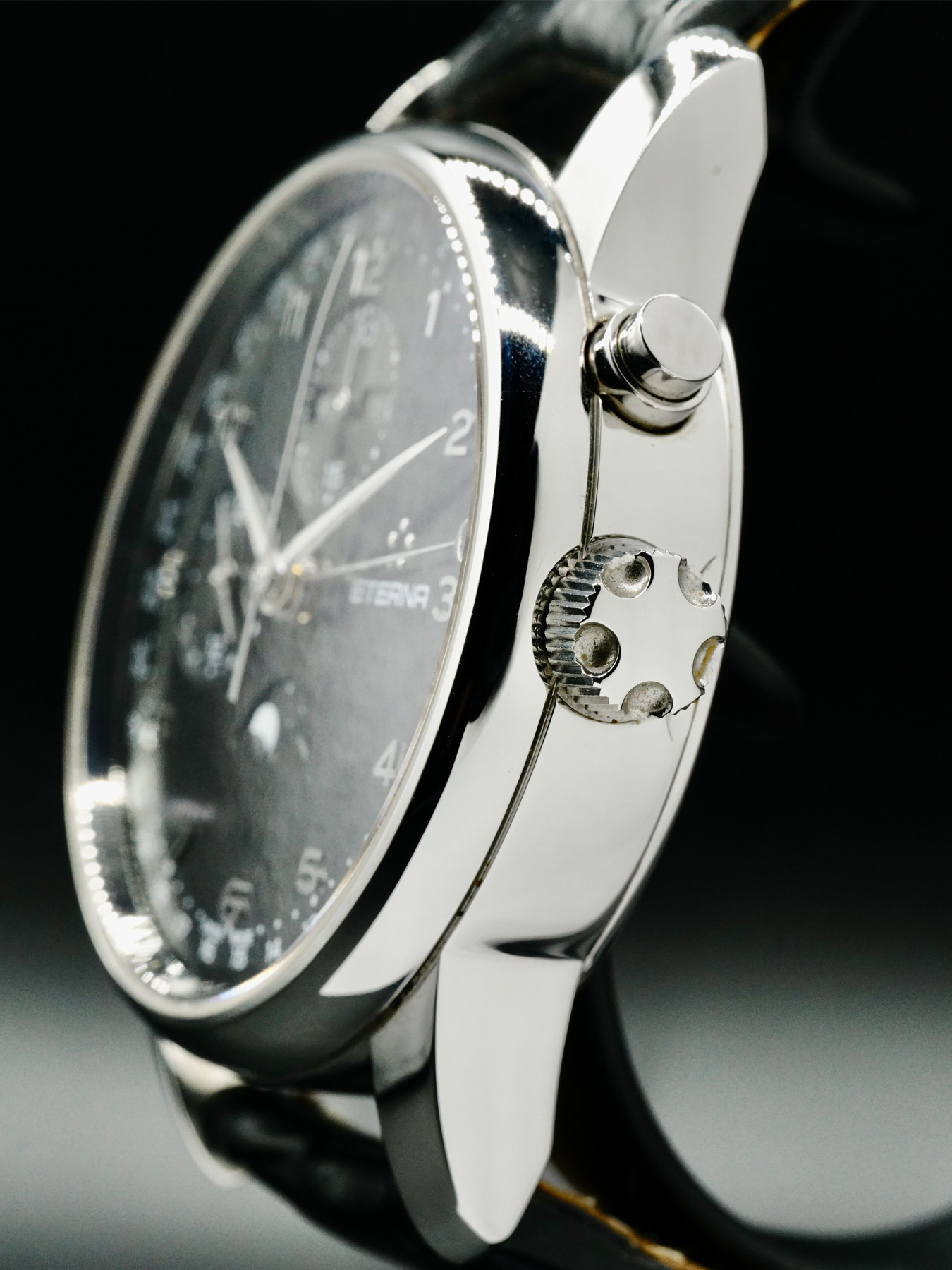 This Eterna Soleure features a 42mm stainless steel case with a solid case back on a black leather strap. This watch also showcases a black dial with silver hands and Arabic numeral dial markers covered by scratch resistant sapphire crystal.