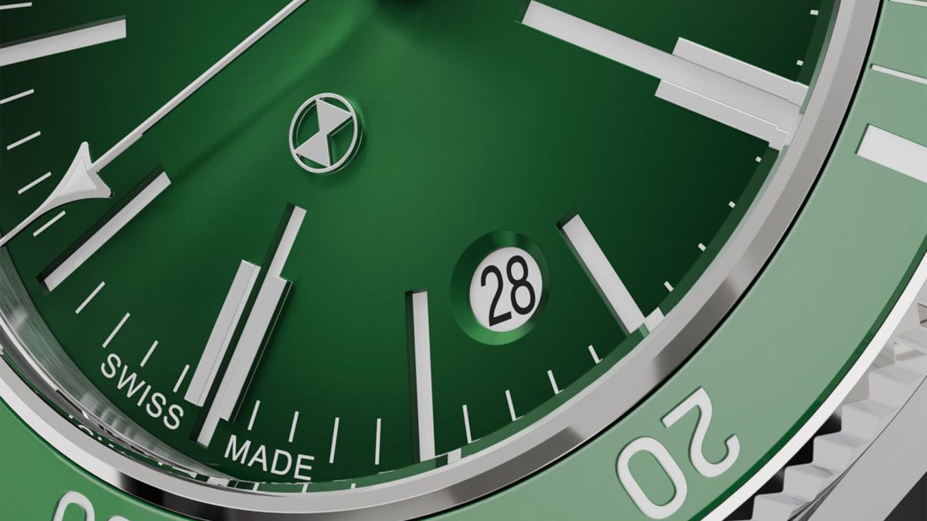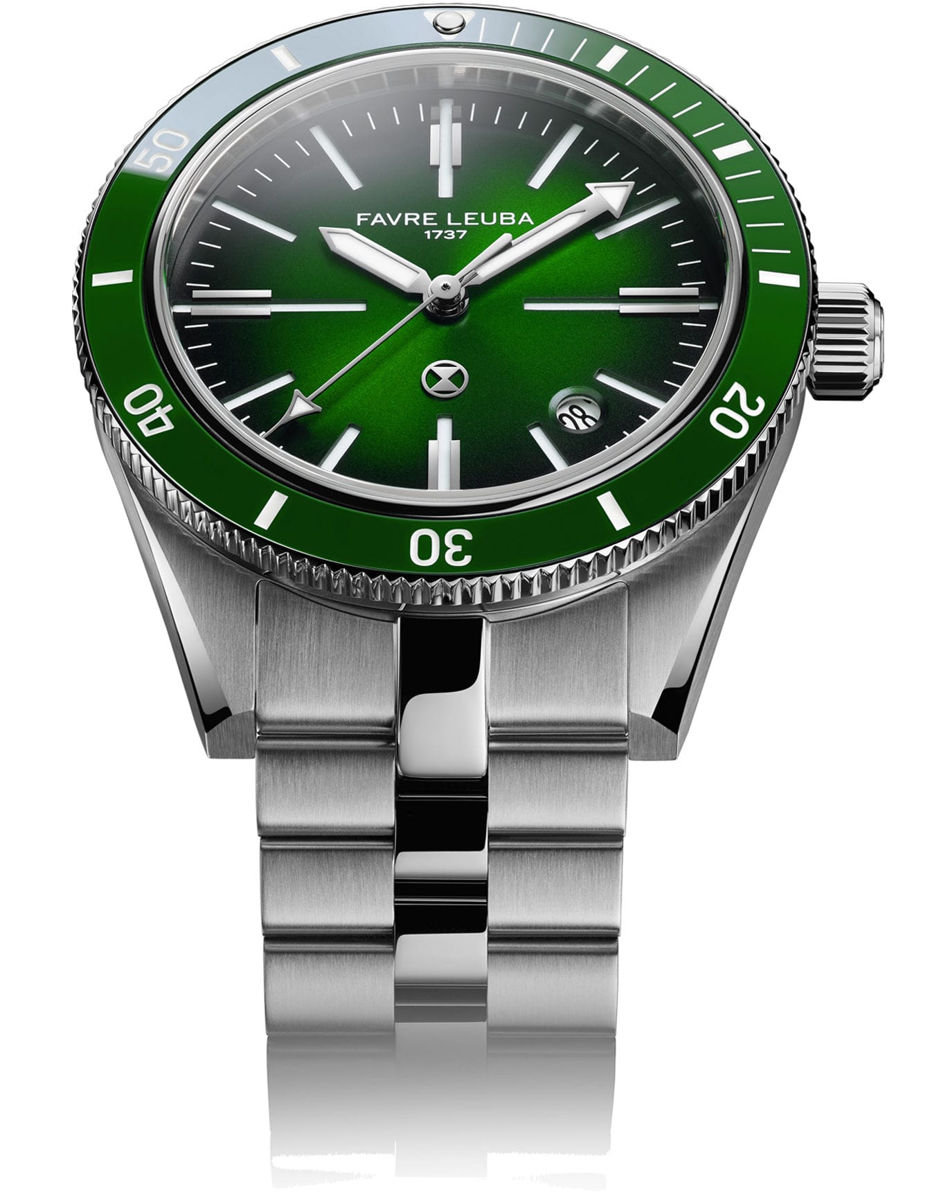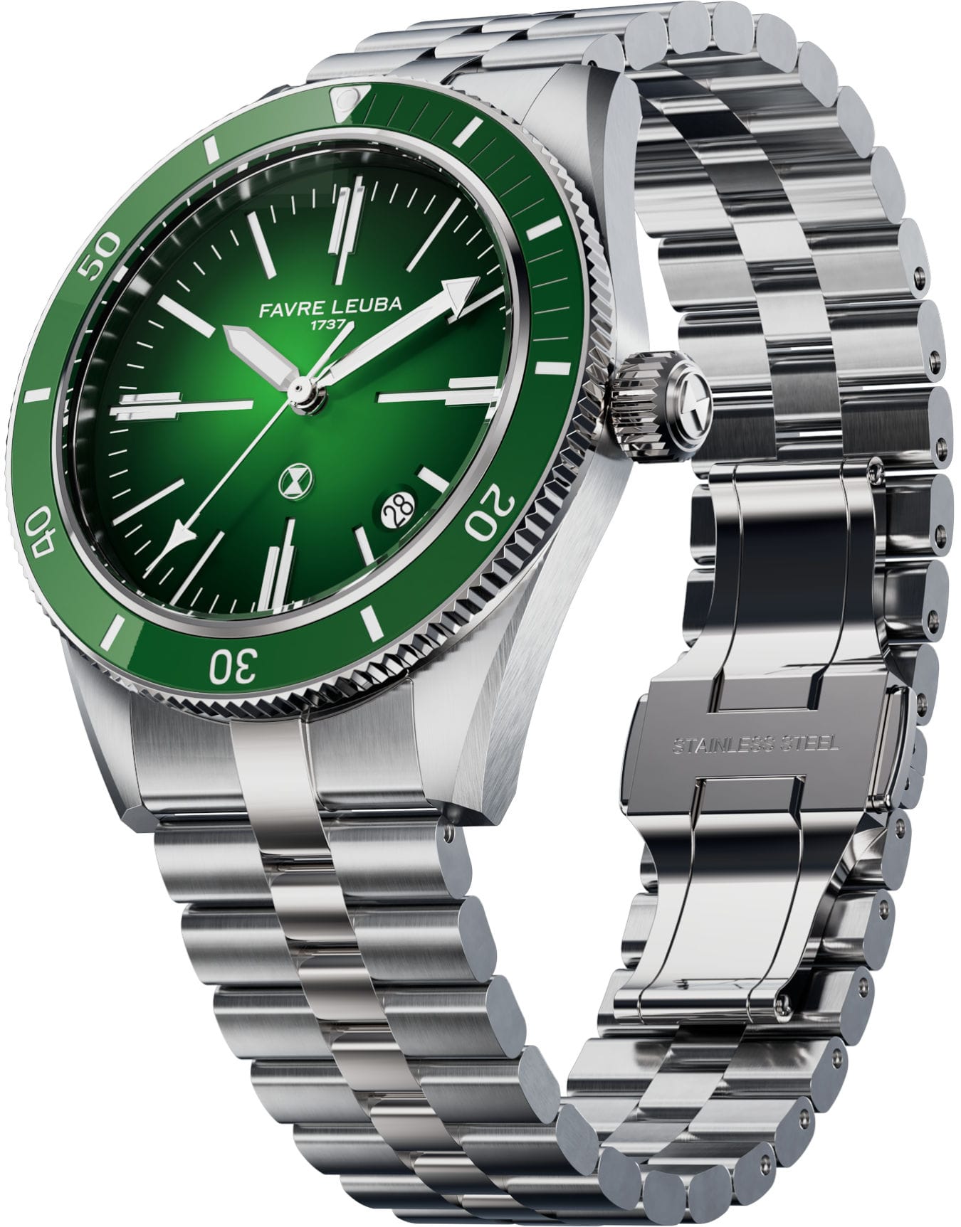 - This timepiece features a 40mm steel case paired with a high quality steel bracelet. It showcases a distinctive Green dial and is powered by a precise automatic winding movement. The watch is designed with a water resistance of up to 300m.