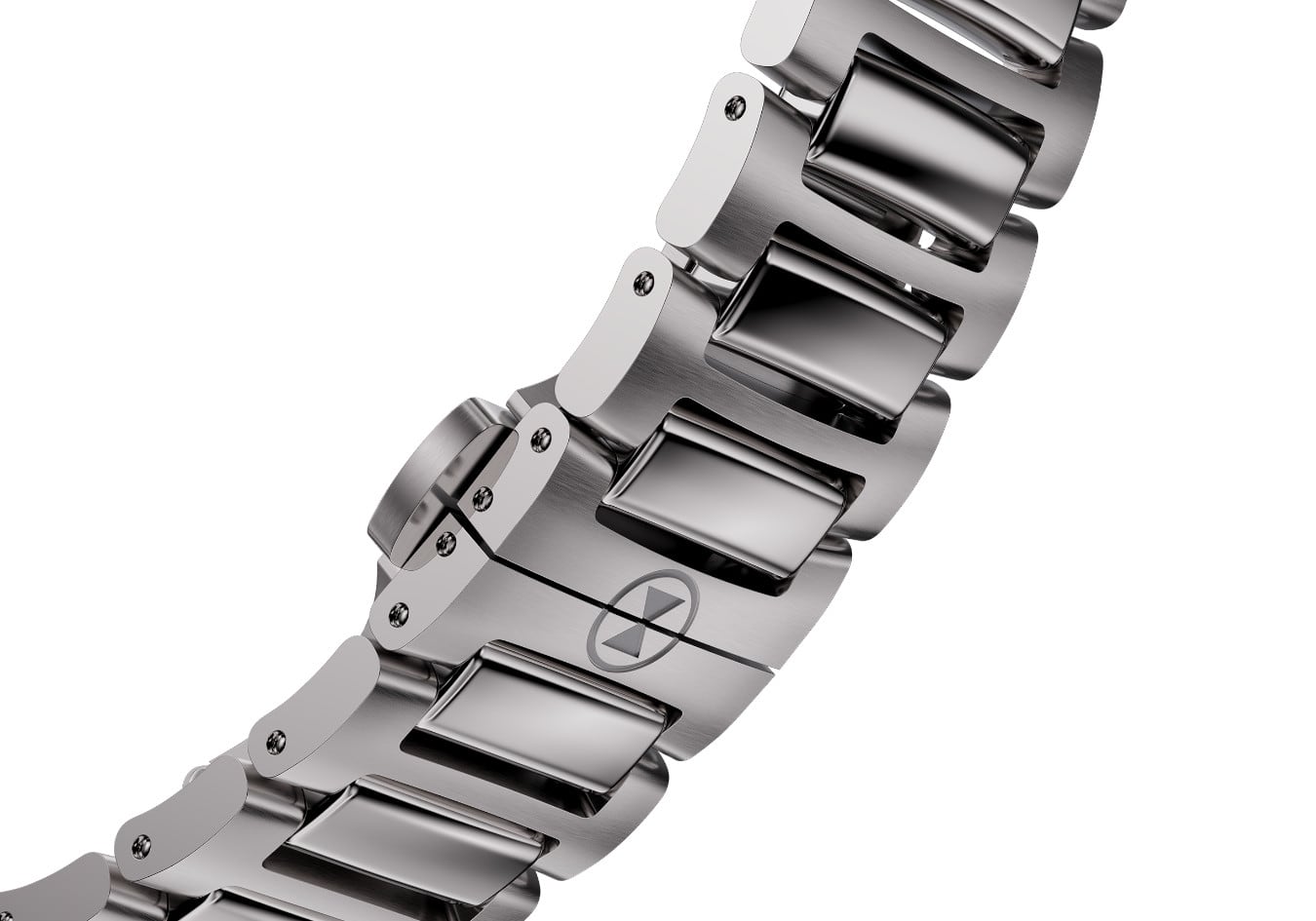 The two-link integrated steel bracelet features a combination of finishes, alternating between vertical brushing and polished center links. It unites seamlessly with the case which gives it a graceful presence on the wrist. The bracelet is equipped with an easy change mechanism and secures with a butterfly clasp.