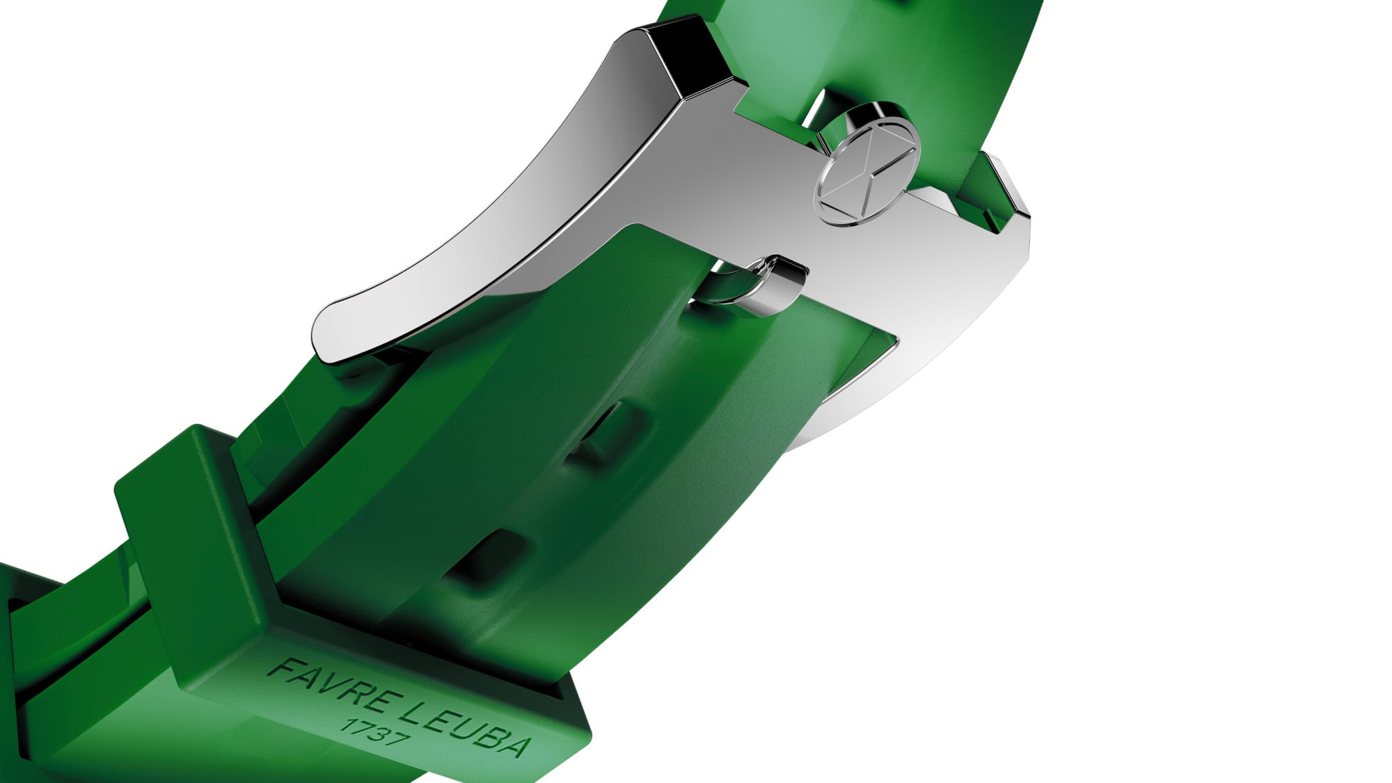 The smooth FKM rubber strap adds an elegant, sporty aesthetic to the watch. It is seamlessly integrated into the case for a graceful presence on the wrist. Designed to accompany you on all adventures, the strap is equipped with an easy change mechanism and secured with a logo-detailed pin buckle.