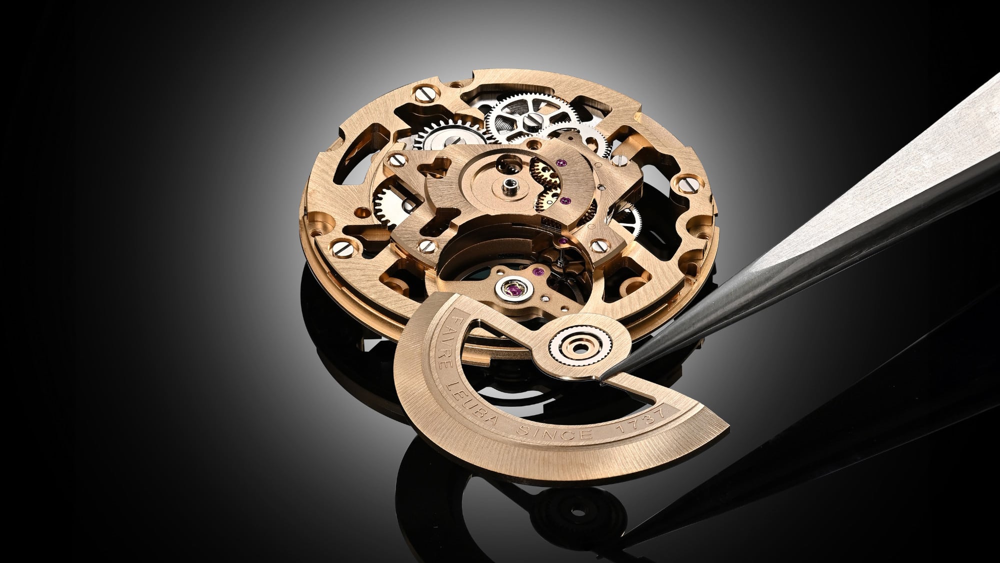 The 4N rotor is skeletonized and custom-designed with Soleillage finishes. Skeletonization of the rotor is an extremely precise task with more implications than just aesthetics. It is engraved with a Favre Leuba monogram as a medallion.