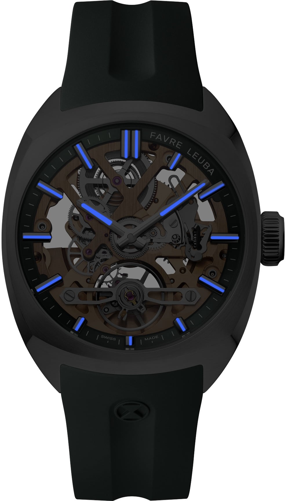The Chief Skeleton revives the iconic cushion-shaped case in stainless steel, blending refined design with enhanced wearability. At 40mm wide, 11.76mm thick, it offers comfort across wrist sizes. Its multifaceted form balances curves and edges, with brushed surfaces and polished bevels. A curved sapphire crystal and a knurled crown embossed with the Favre Leuba logo complete the look, capturing both elegance and strength.