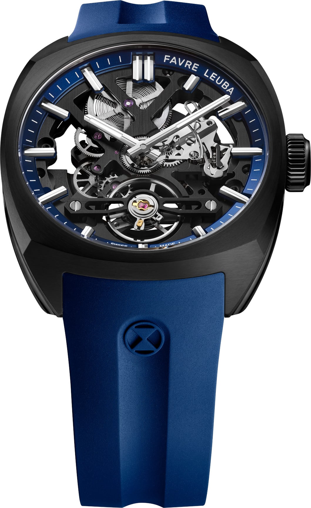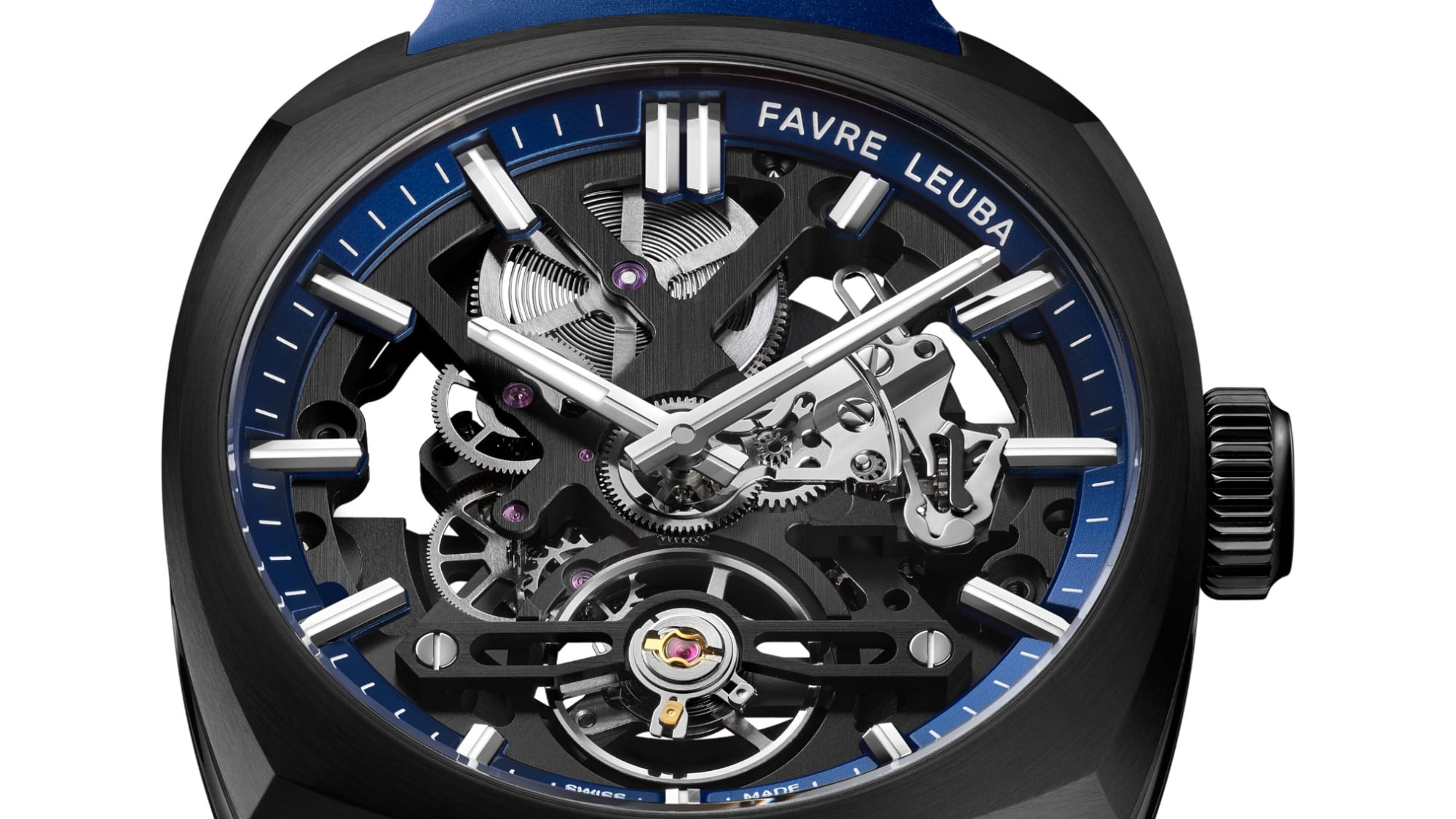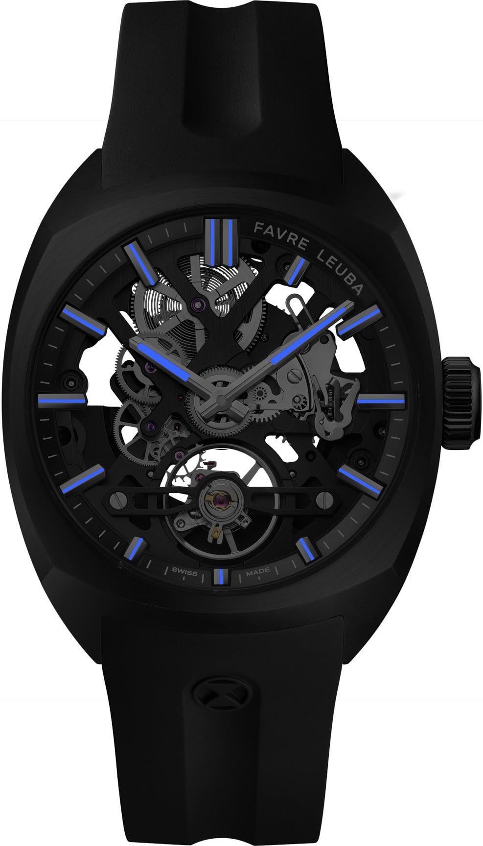 The Chief Skeleton revives the iconic cushion-shaped case in stainless steel, blending refined design with enhanced wearability. At 40mm wide, 11.76mm thick, it offers comfort across wrist sizes. Its multifaceted form balances curves and edges, with brushed surfaces and polished bevels. A curved sapphire crystal and a knurled crown embossed with the Favre Leuba logo complete the look, capturing both elegance and strength.