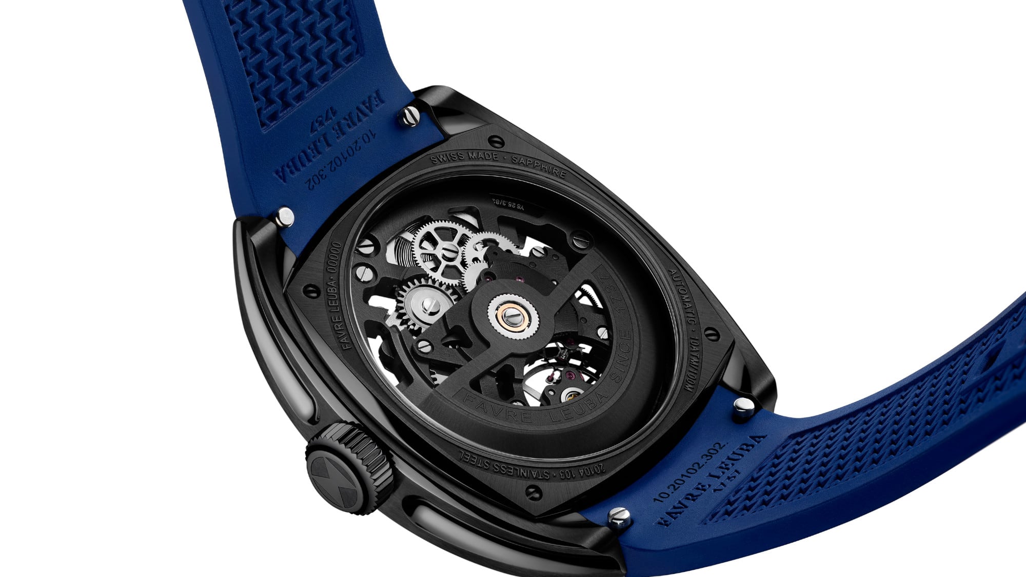 Favre Leuba’s first skeleton movement showcases a multi-layered openwork design with clean lines and maximized open space. The custom-designed balance wheel bridge and spanning bridges feature horizontal brushing, while all components are finished in black chrome for a bold look.