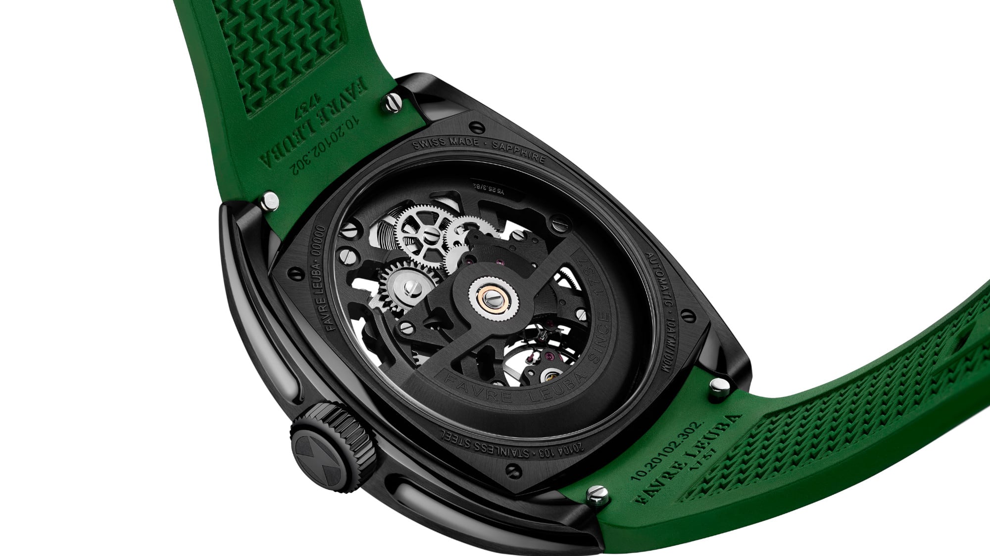 Favre Leuba’s first skeleton movement showcases a multi-layered openwork design with clean lines and maximized open space. The custom-designed balance wheel bridge and spanning bridges feature horizontal brushing, while all components are finished in black chrome for a bold look.
