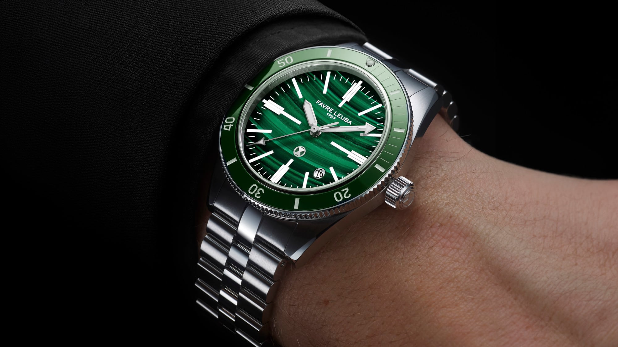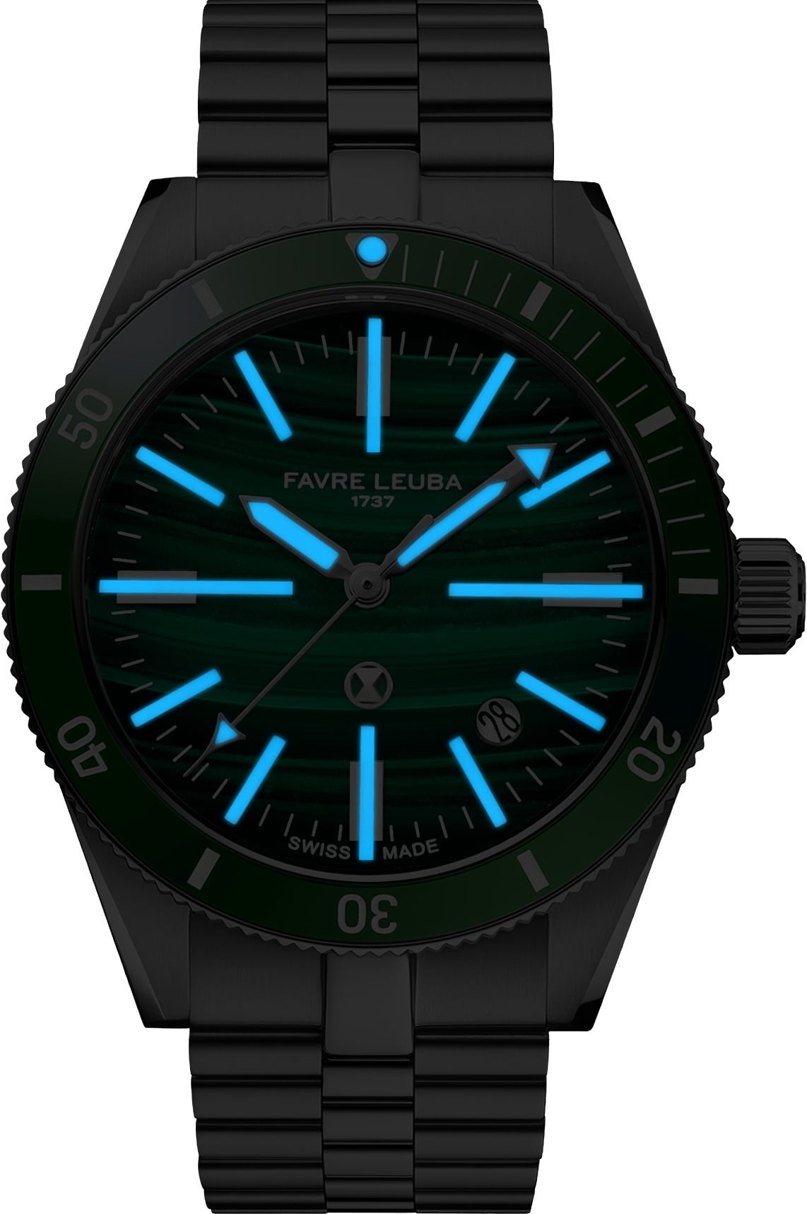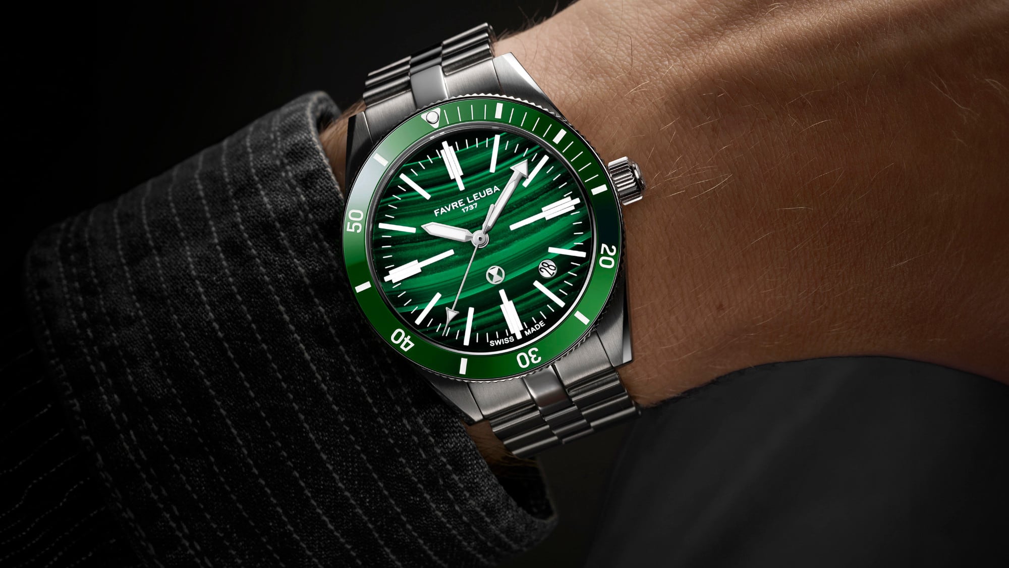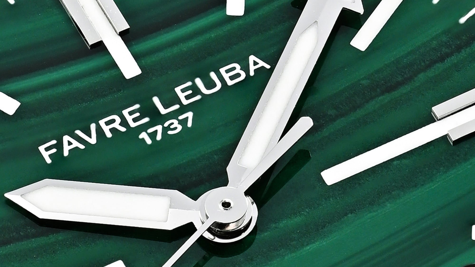 The malachite dial reflects Favre Leuba’s focus on distinctive materials and precise finishing. Formed from genuine malachite, it shows natural green tones and layered mineral patterns that give each dial its own visual identity. Every piece is selected for stability and clarity of pattern before being shaped into thin plates, reinforced where needed, and polished at controlled temperatures to maintain its structure.