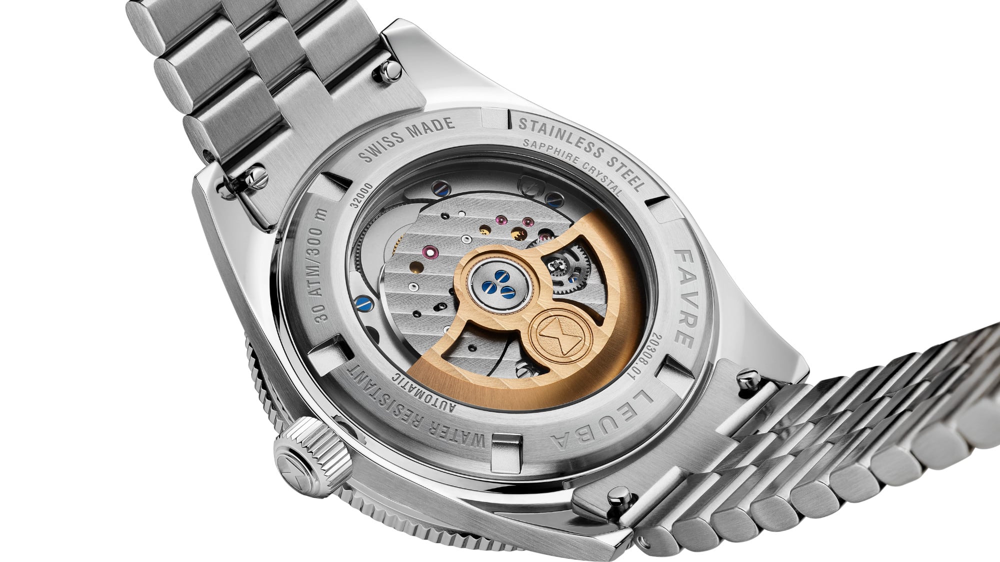 The 4N rotor is skeletonized and custom-designed with the Soleillage finish. It bears the Favre Leuba monogram engraved as a medallion. Skeletonization of the rotor is an extremely precise task with more implications than just aesthetics. The weight and other characteristics of the rotor boast surgical precision to ensure winding efficiency.
