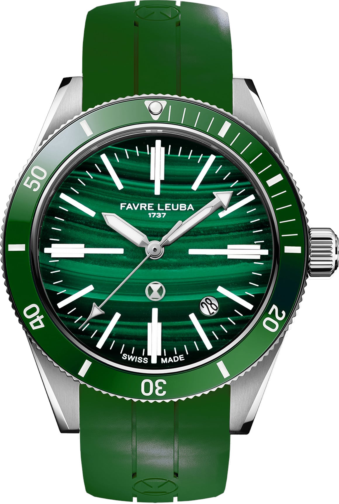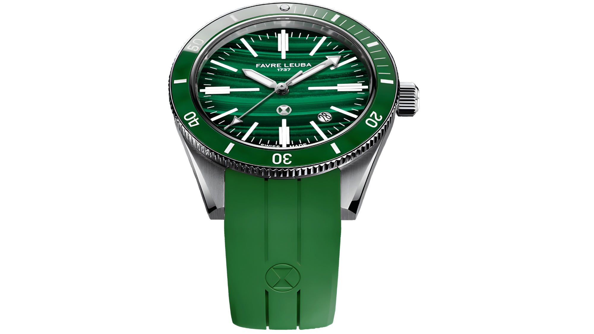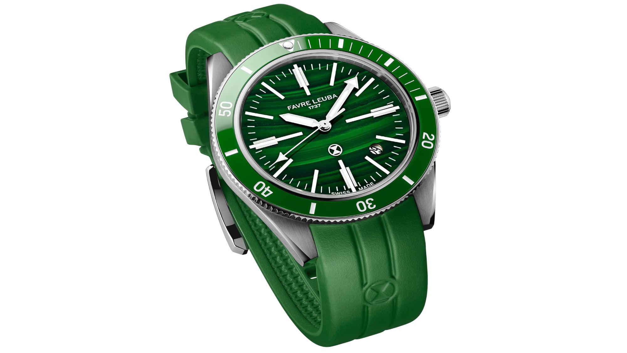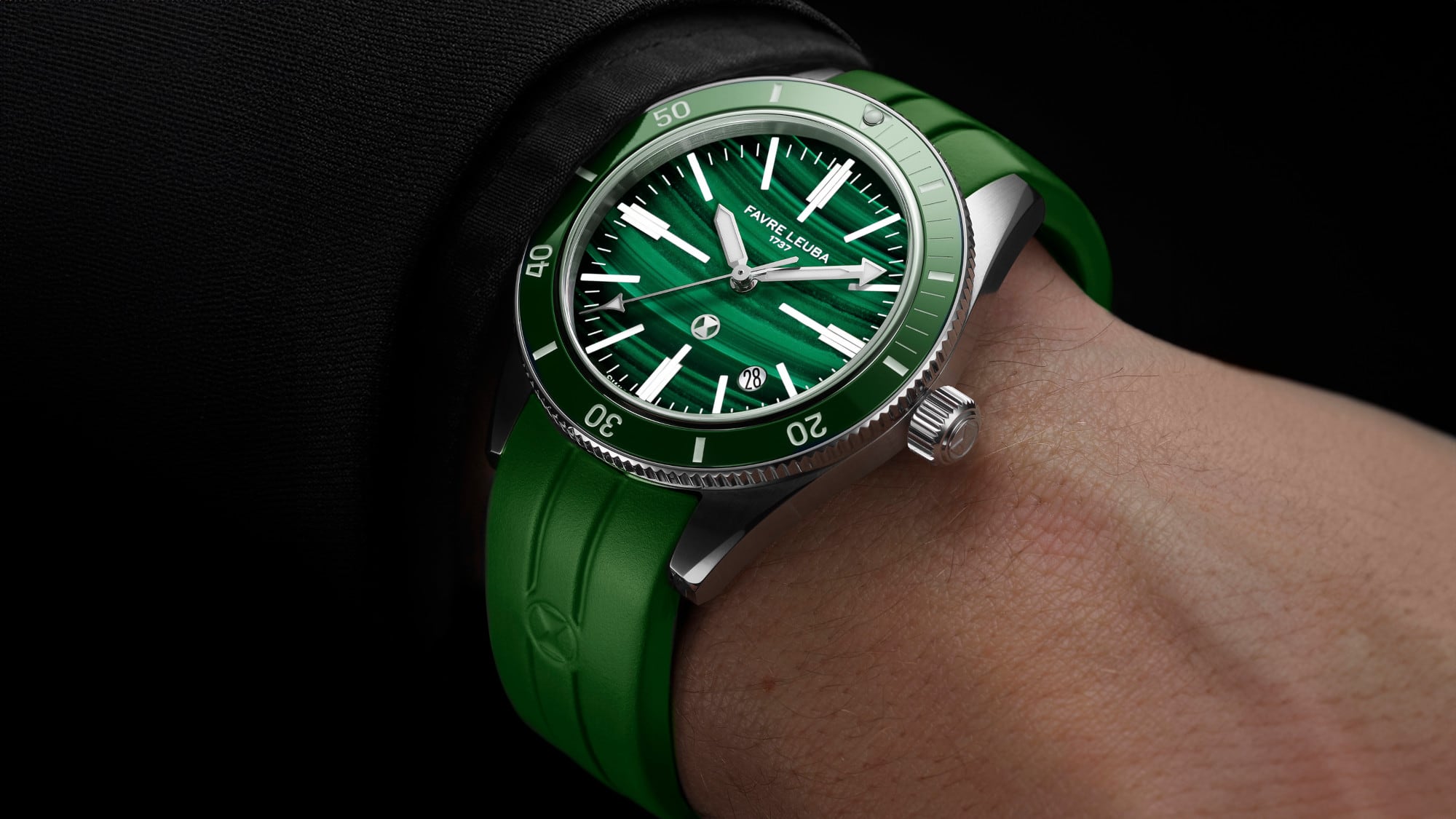 The malachite dial reflects Favre Leuba’s focus on distinctive materials and precise finishing. Formed from genuine malachite, it shows natural green tones and layered mineral patterns that give each dial its own visual identity. Every piece is selected for stability and clarity of pattern before being shaped into thin plates, reinforced where needed, and polished at controlled temperatures to maintain its structure.
