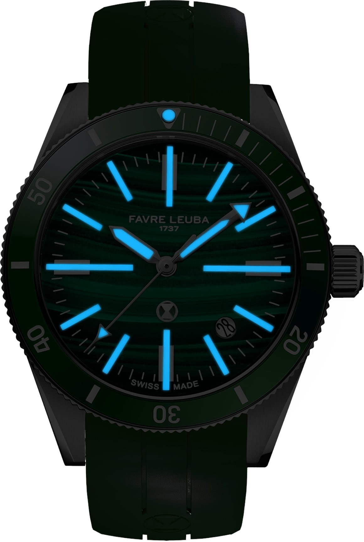 The Deep Raider Renaissance Malachite dial is coated in Super-Luminova, allowing light to flow through the cut-out indexes and creating bright, clearly defined hour markers suited to a modern diver. This luminous treatment ensures consistent visibility in low-light conditions, with luminous hands reinforcing clarity underwater. Despite its functional emphasis, the dial maintains a refined character, featuring a round date aperture positioned between four and five o’clock.