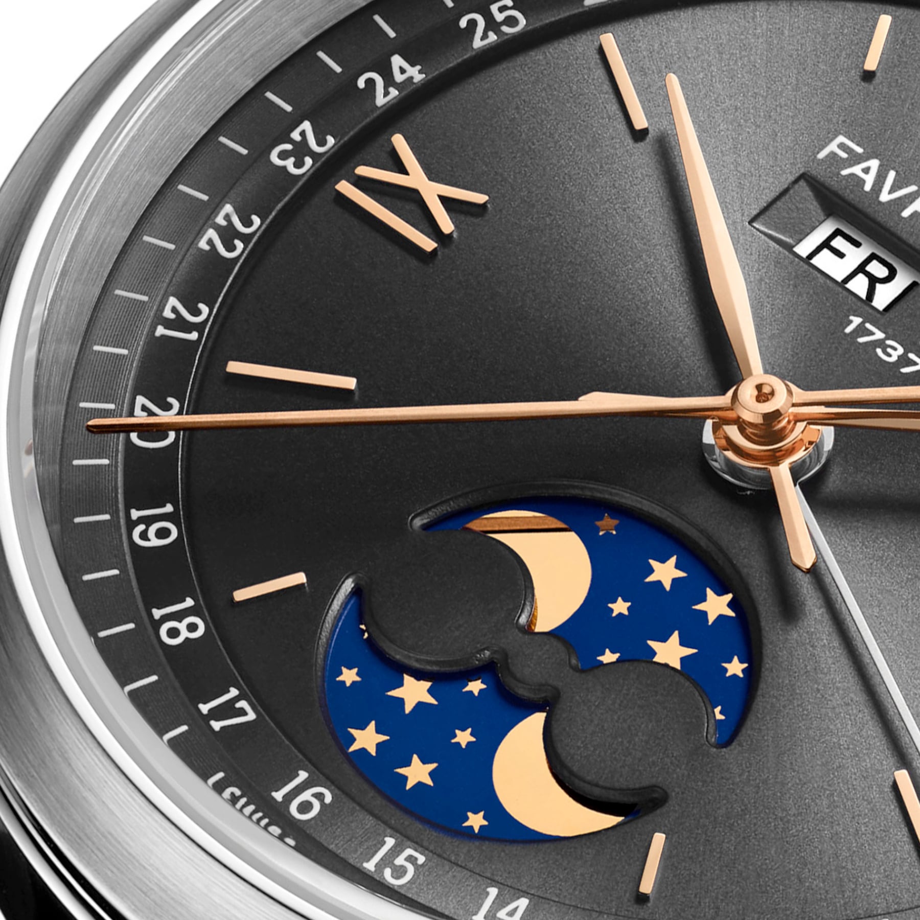 Powering the 1737 is the FLD06 self-winding caliber, delivering steady energy to support the triple calendar and moon phase indications, ensuring that each display advances with reliable precision. Regulated to a maximum deviation of ±5 seconds per day, the movement is engineered for consistent real-world performance.