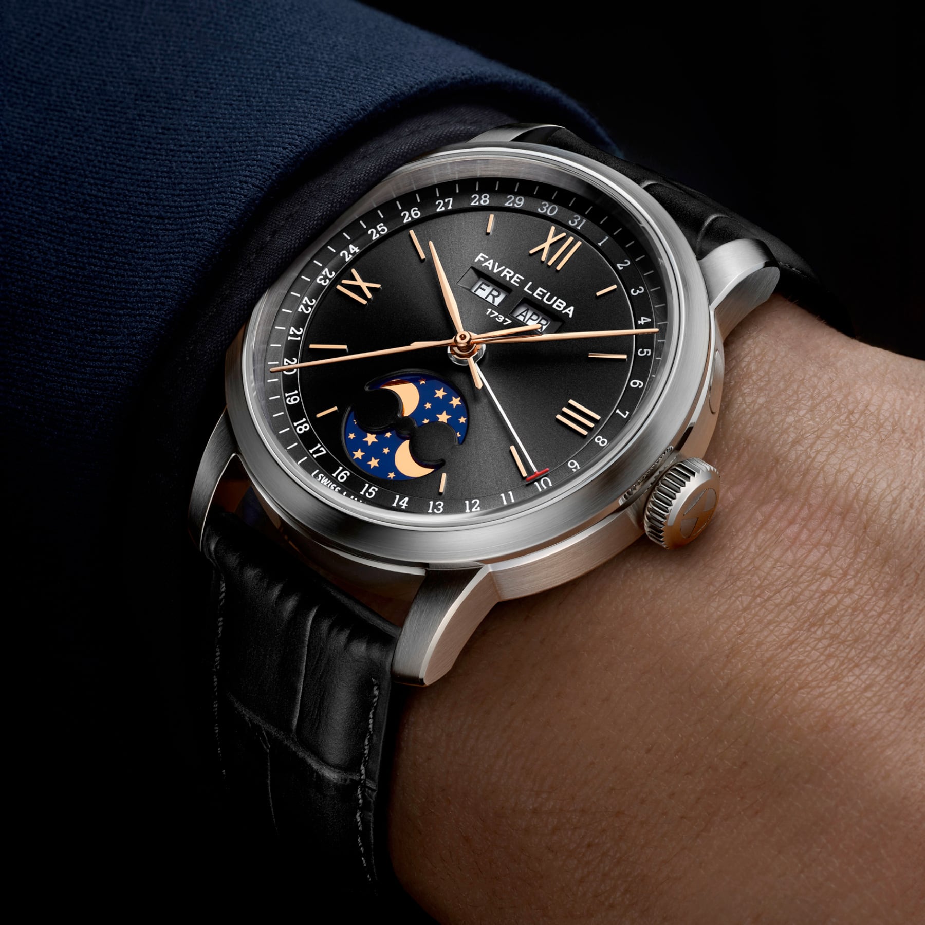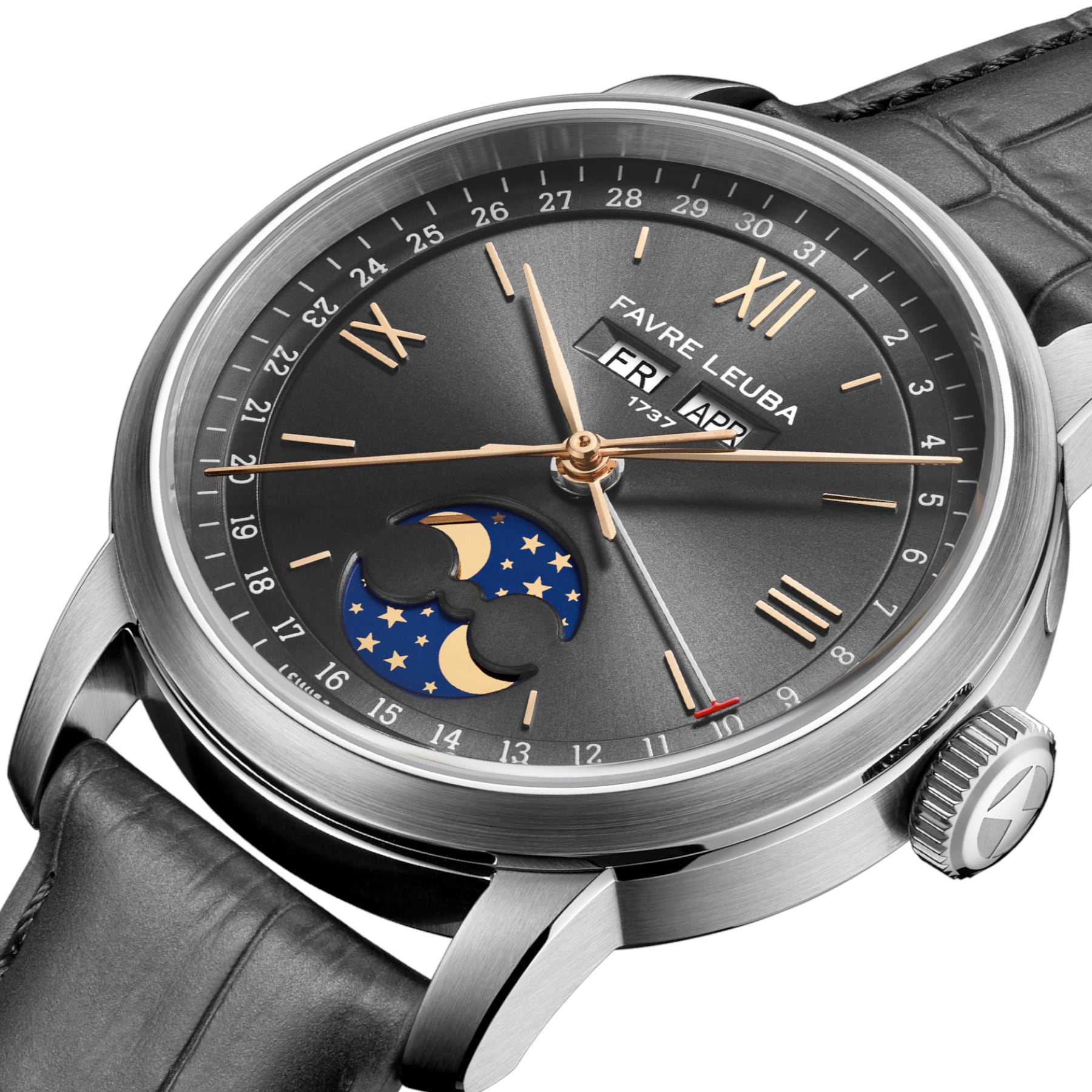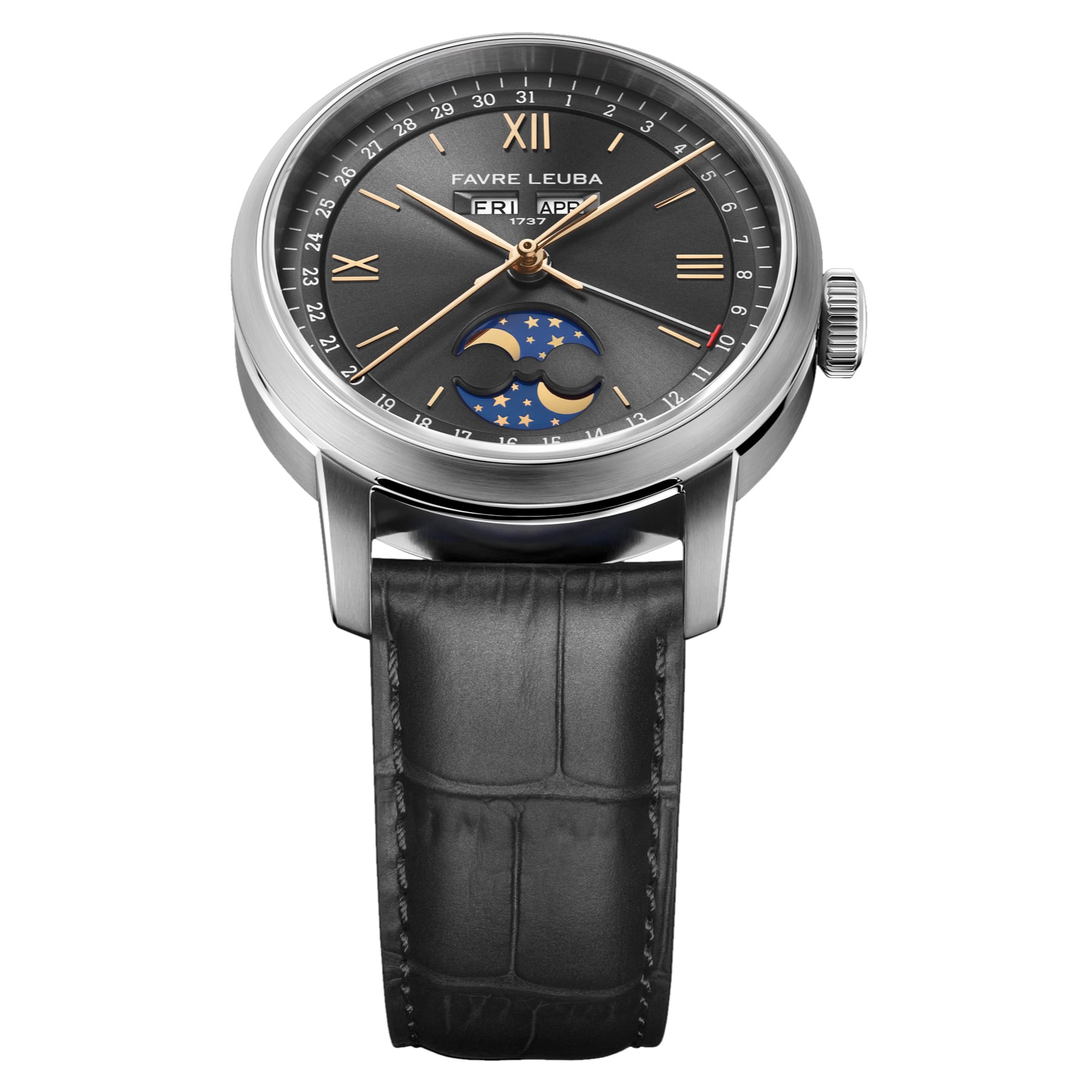 The 1737 revisits one of Favre Leuba’s most revered complications, drawing direct inspiration from the brand’s triple calendar and moon phase watches produced during the 1950s. Its name references the year Abraham Favre began the family’s watchmaking lineage, anchoring the watch within nearly three centuries of uninterrupted heritage. The 1737 presents a classical complication in a form that feels relevant, refined, and purposefully modern.