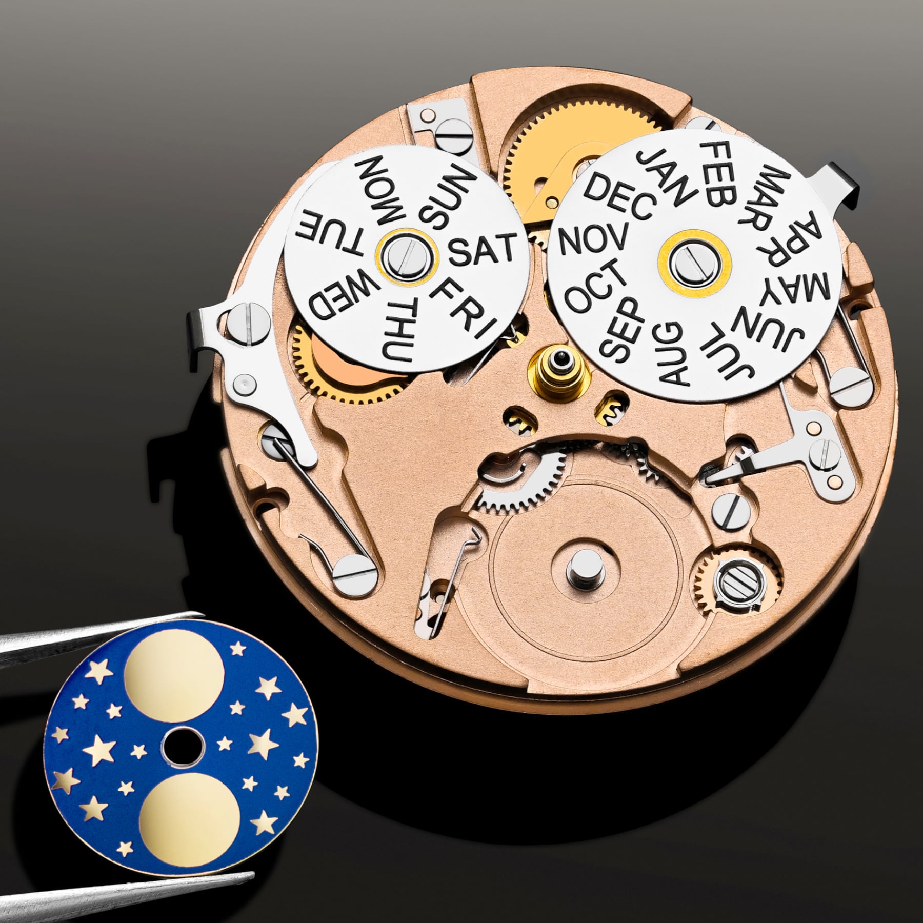 Day-date, moon phase, month, hours, minutes and seconds