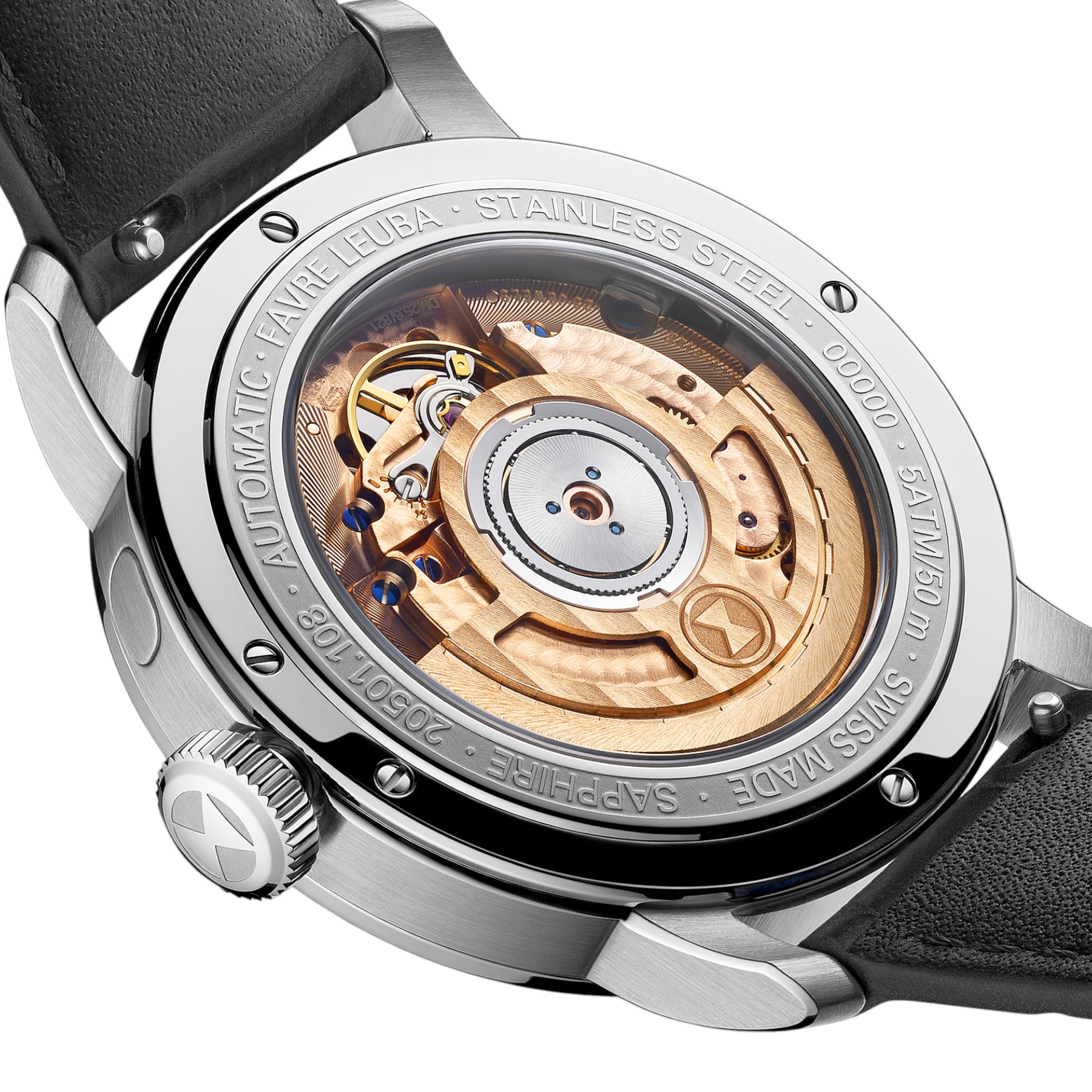 The 4N PVD rotor features a skeletonized construction and a bespoke design adorned with Colimaçon and Soleillage finishes. The Favre Leuba monogram is engraved as a medallion on the custom-skeletonized oscillating weight. The precision required in skeletonizing the rotor extends beyond aesthetics, reflecting both engineering rigor and refined craftsmanship.