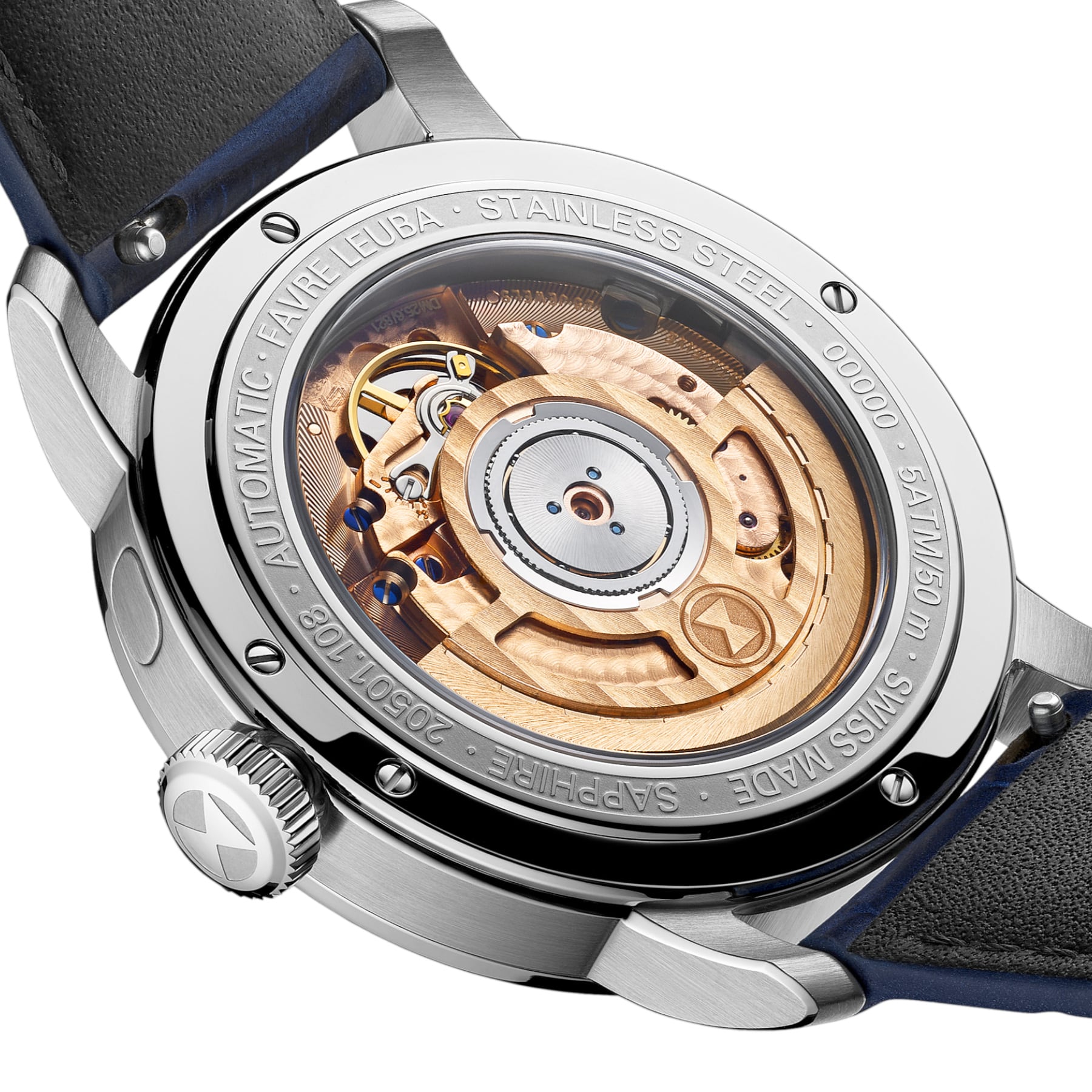 The 4N PVD rotor features a skeletonized construction and a bespoke design adorned with Colimaçon and Soleillage finishes. The Favre Leuba monogram is engraved as a medallion on the custom-skeletonized oscillating weight. The precision required in skeletonizing the rotor extends beyond aesthetics, reflecting both engineering rigor and refined craftsmanship.