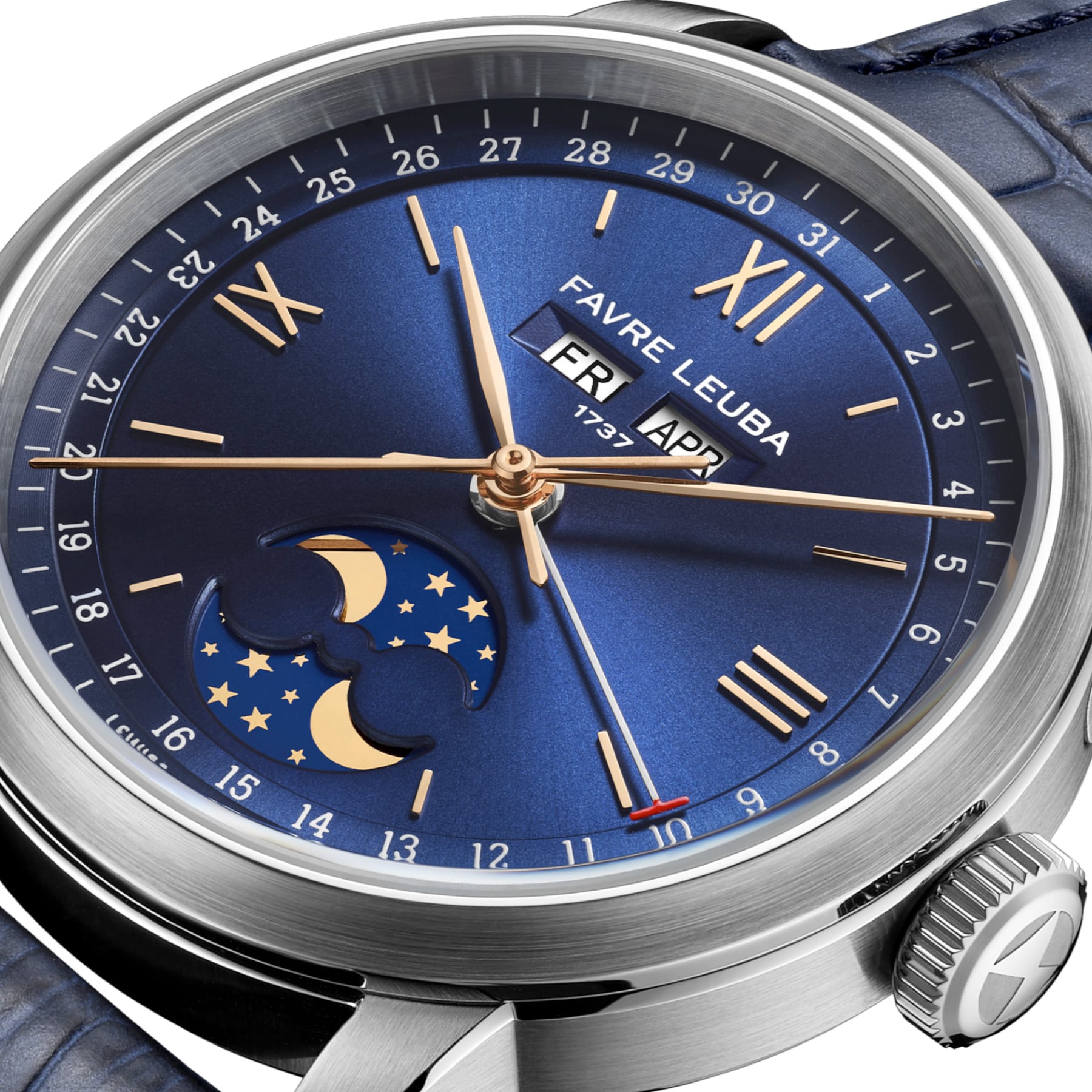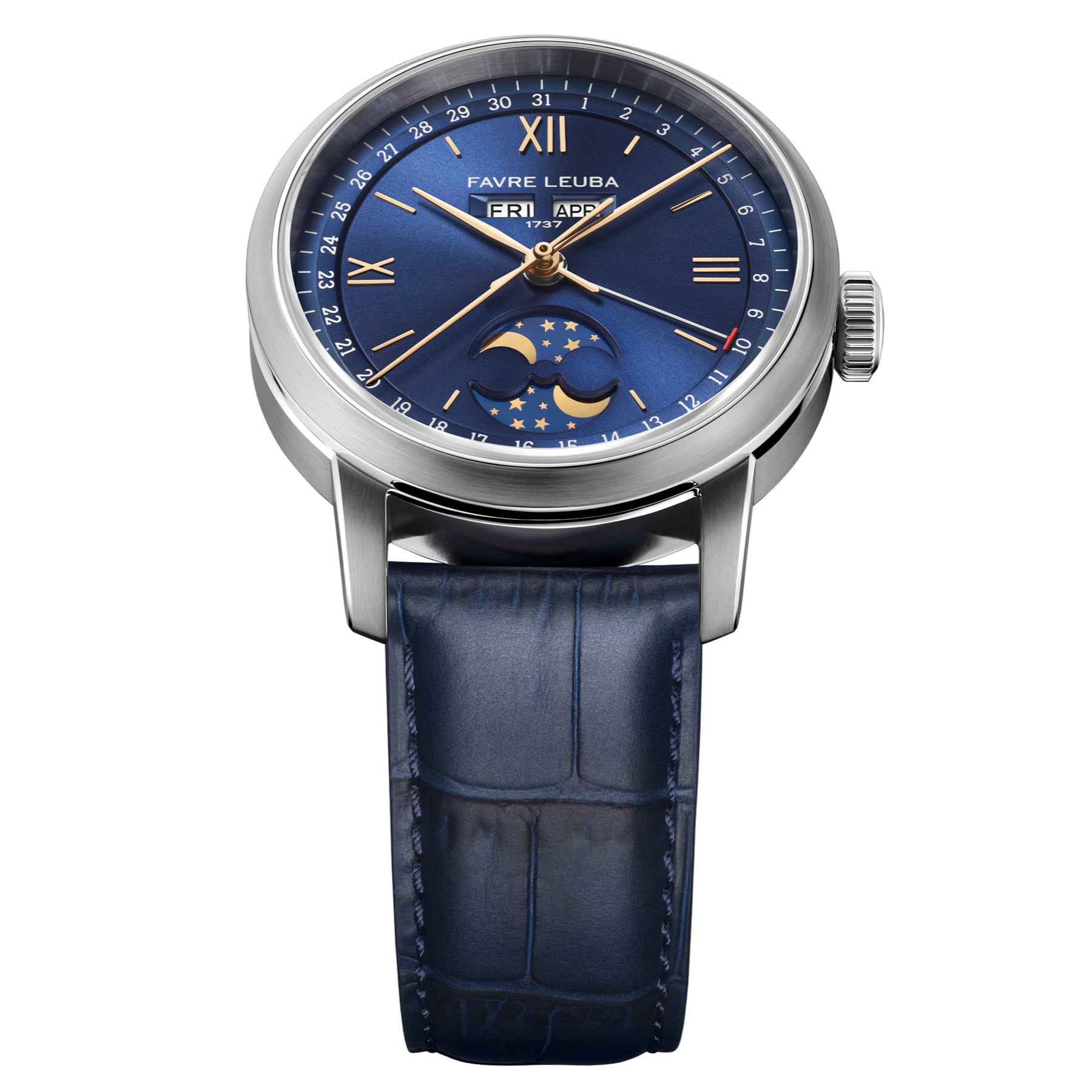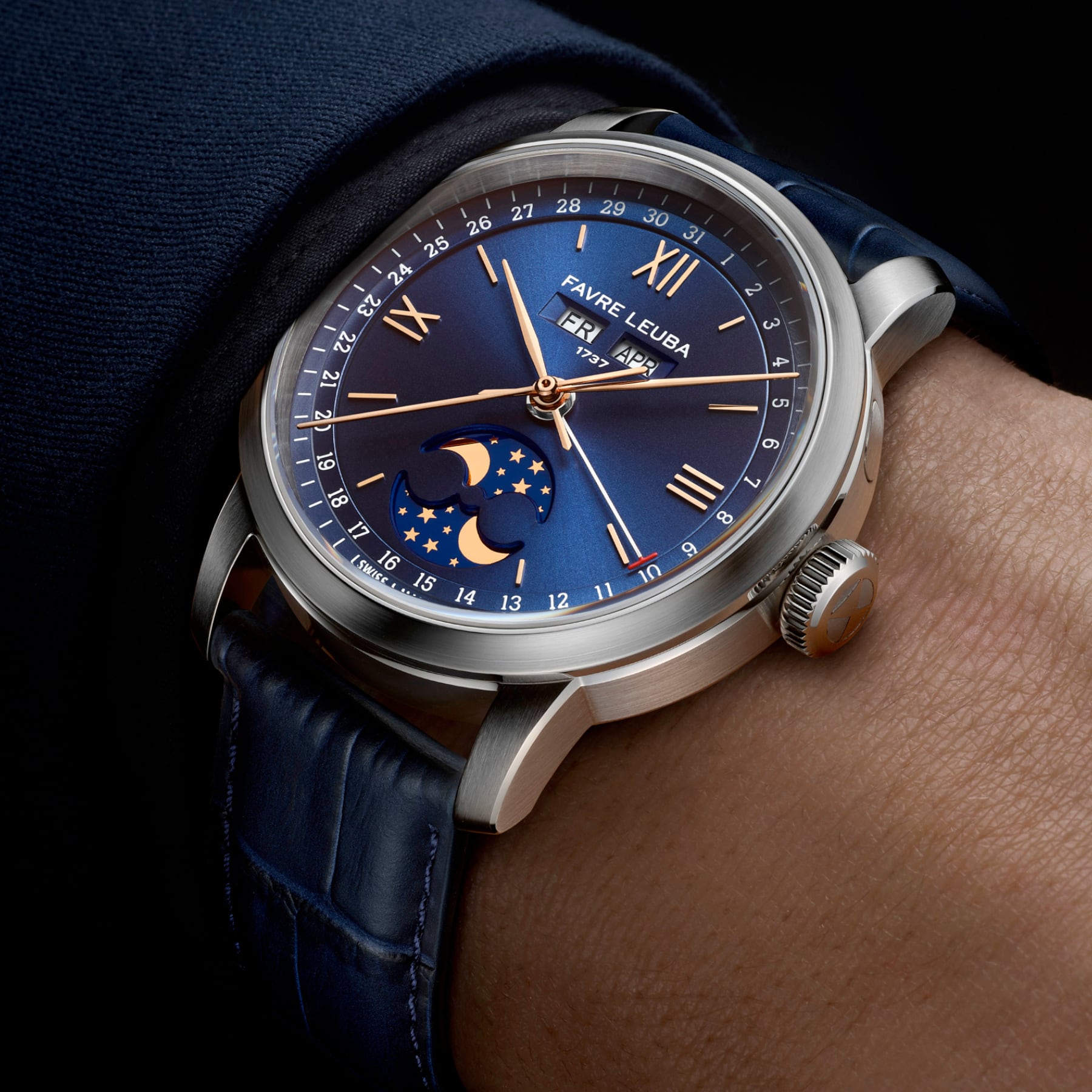 The 1737 revisits one of Favre Leuba’s most revered complications, drawing direct inspiration from the brand’s triple calendar and moon phase watches produced during the 1950s. Its name references the year Abraham Favre began the family’s watchmaking lineage, anchoring the watch within nearly three centuries of uninterrupted heritage. The 1737 presents a classical complication in a form that feels relevant, refined, and purposefully modern.