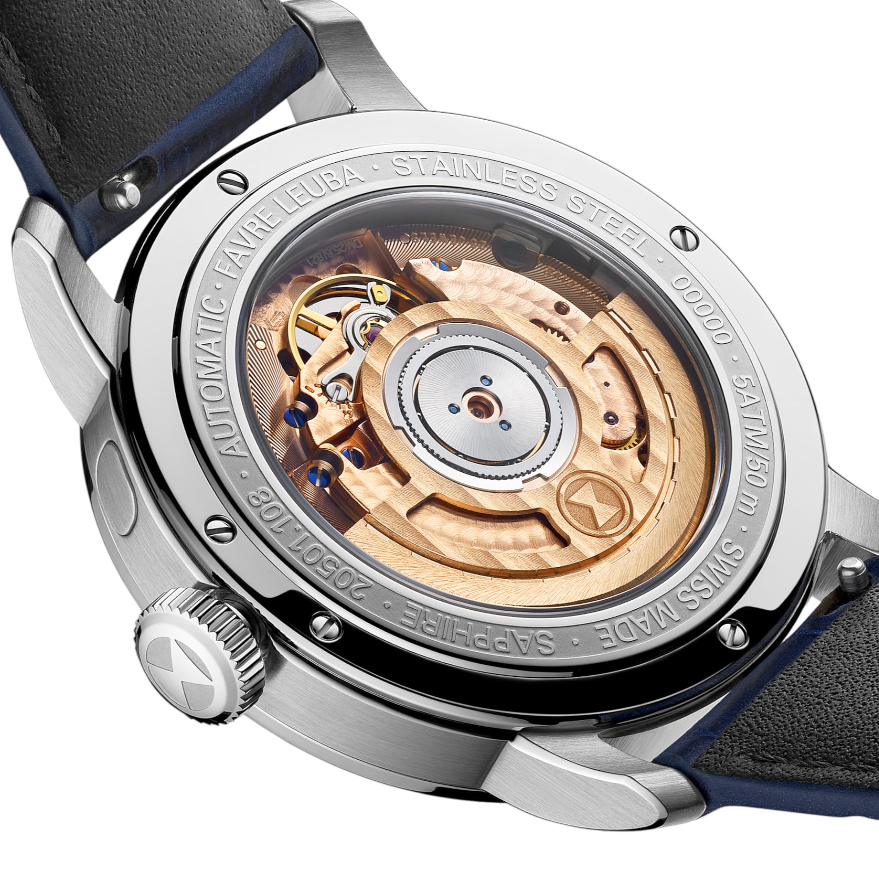 The 4N PVD rotor features a skeletonized construction and a bespoke design adorned with Colimaçon and Soleillage finishes. The Favre Leuba monogram is engraved as a medallion on the custom-skeletonized oscillating weight. The precision required in skeletonizing the rotor extends beyond aesthetics, reflecting both engineering rigor and refined craftsmanship.