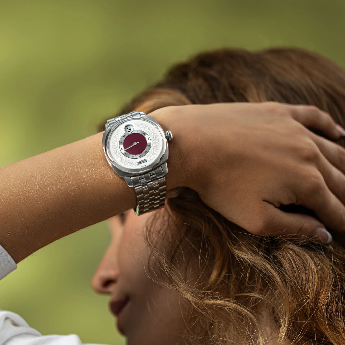 - Inner Dial – a rich plum matte lacquer that offers a bold yet sophisticated contrast