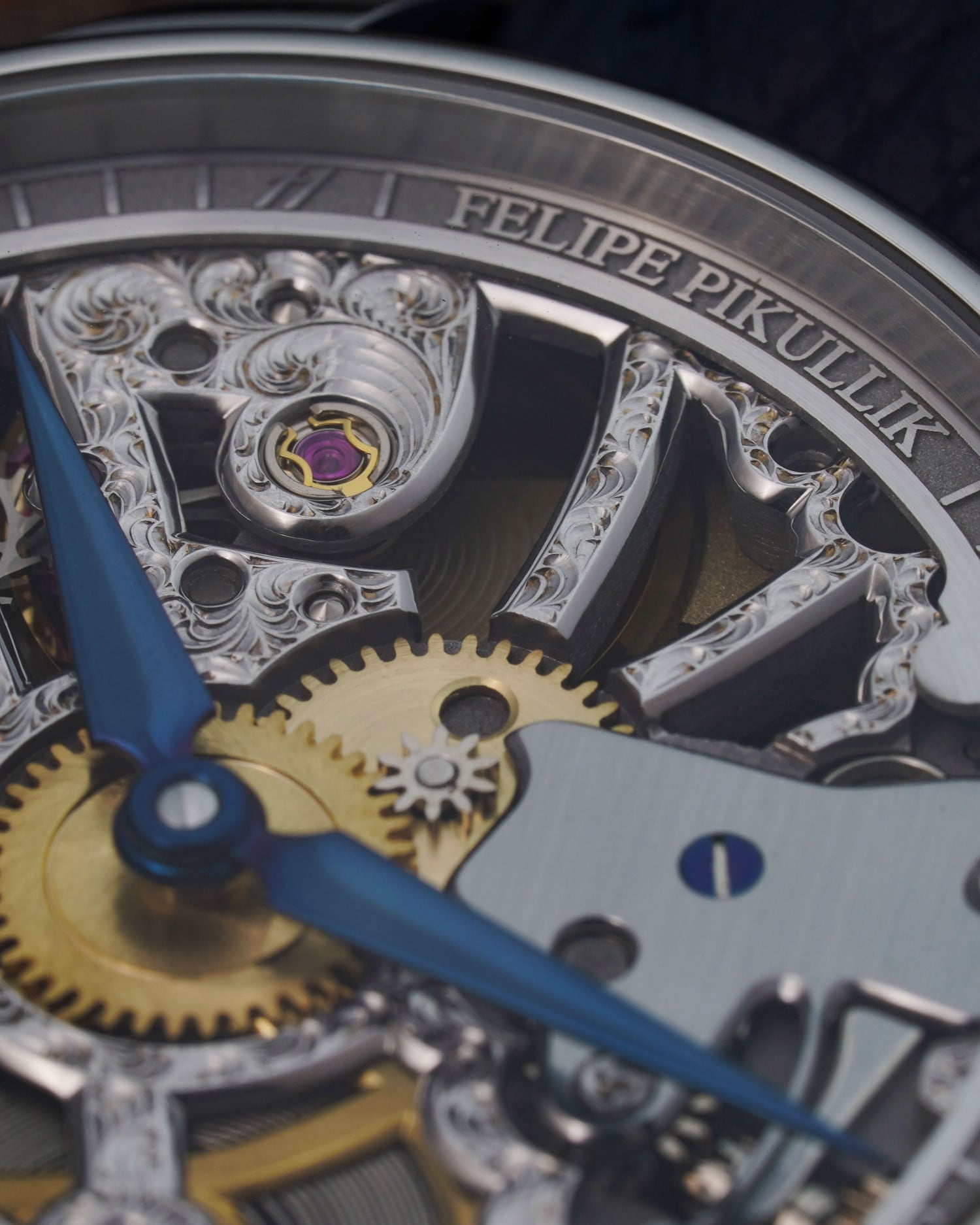 Artistic engravings grace the bridges and plates, showcasing Felipe’s dedication to perfection and his ability to elevate functional components into works of art. The heat-blued screws and gold-plated accents further highlight the movement’s refined aesthetic, creating a harmonious contrast that draws the eye to every detail.