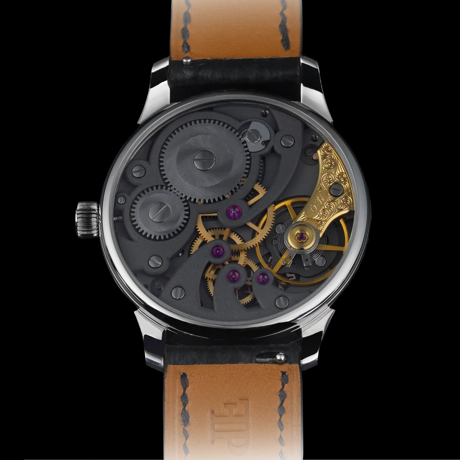 The movement of the FP Klassik embodies Felipe Pikullik’s unwavering commitment to craftsmanship and technical innovation. Every detail has been meticulously considered, from the precisely hand-skeletonized bridges to the sharp, refined interior angles achieved through expert hand beveling. The sandblasted movement plates, adorned with a rich black rhodium-plated finish, create a striking contrast that enhances the overall depth and texture of the design.