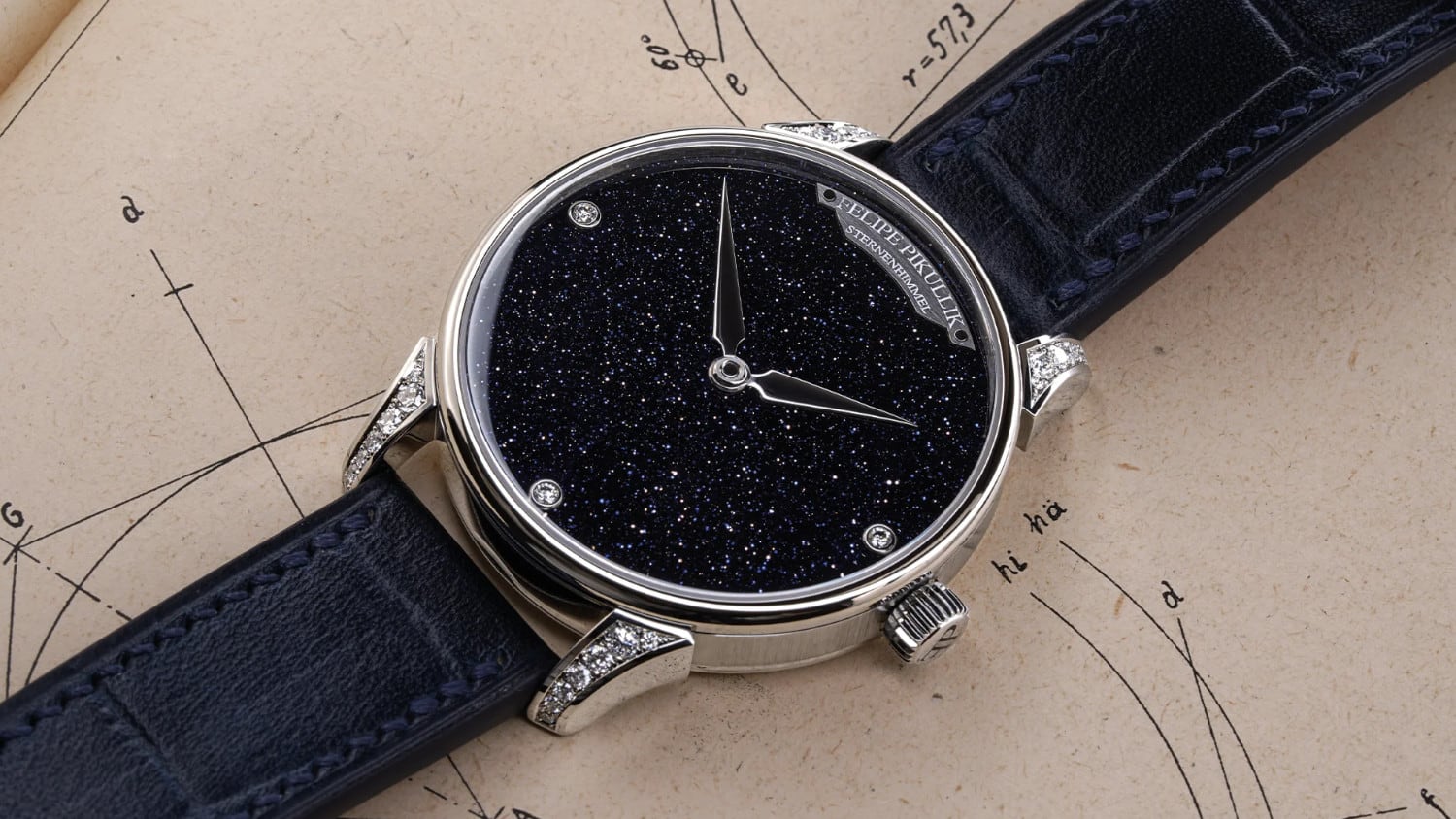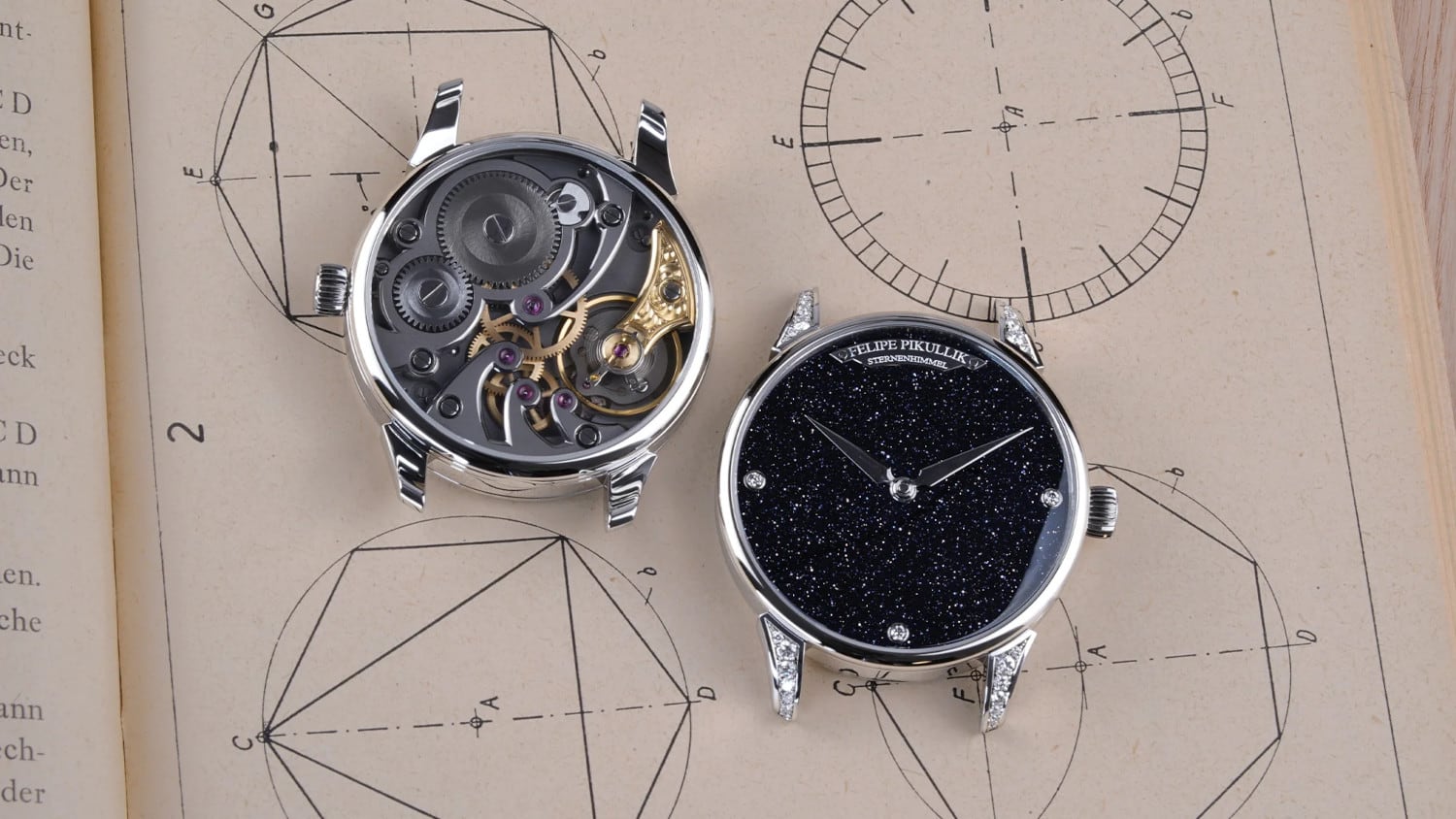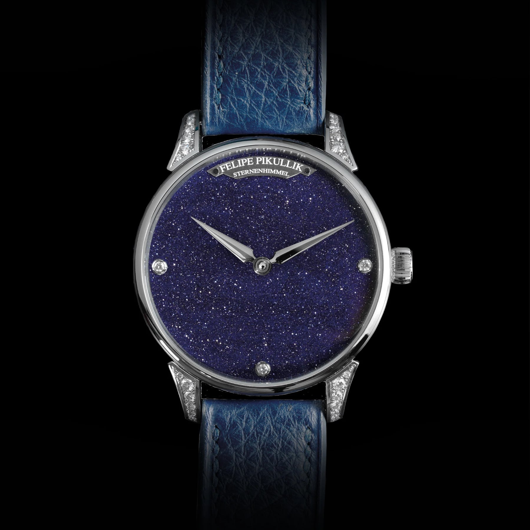 The Sternenhimmel is a masterpiece of watchmaking that reflects Felipe Pikullik’s passion for astronomy and precision. This extraordinary timepiece captivates with its mesmerizing dial made of deep blue aventurine glass/green aventurin stone, adorned with sparkling crystals that create a realistic starry sky effect. The combination of technical sophistication and aesthetic elegance makes the Sternenhimmel a truly unique work of art. Every detail, from the meticulously crafted finishes to the hand-made components, showcases exceptional craftsmanship and Felipe Pikullik’s vision of bringing the magic of the cosmos into the art of watchmaking.