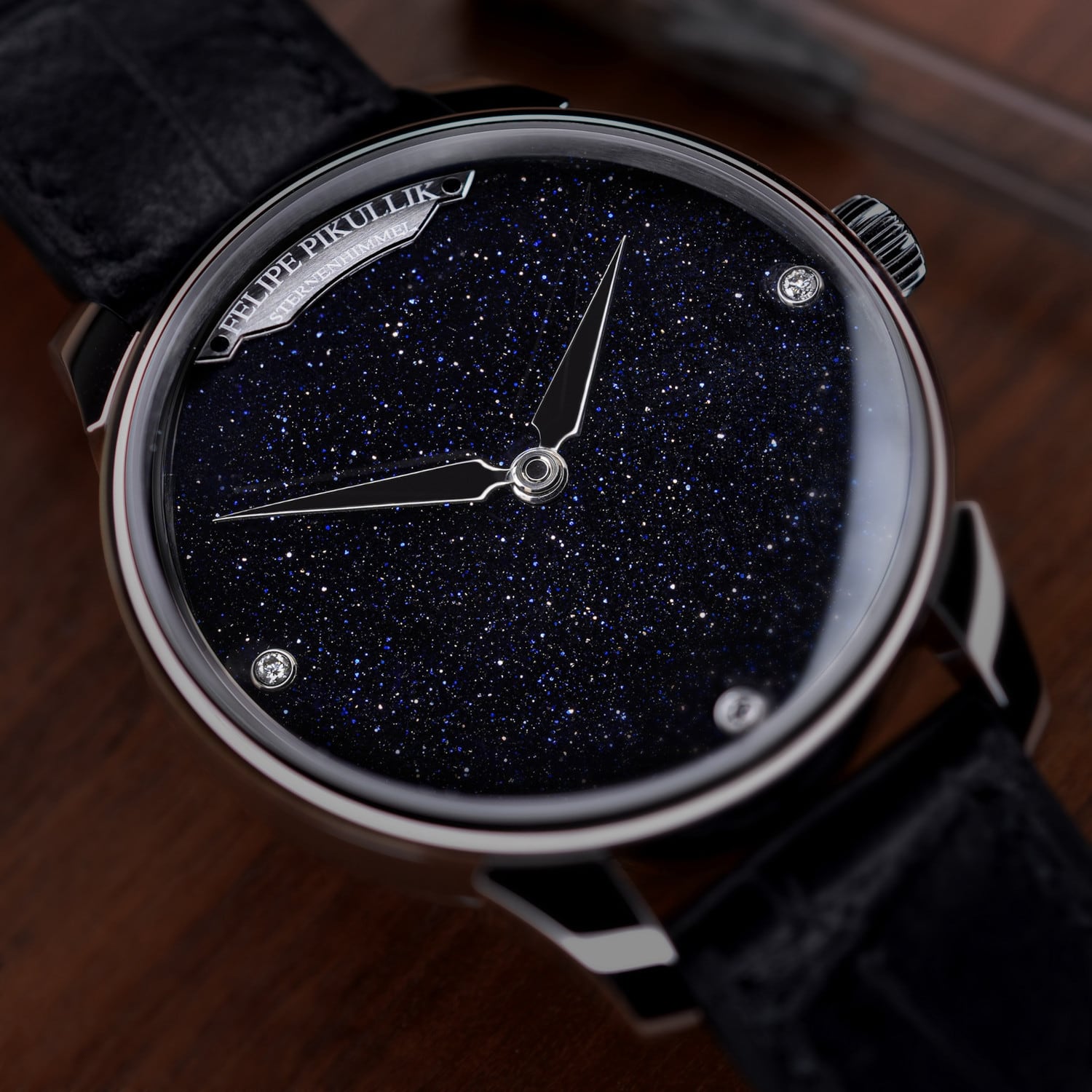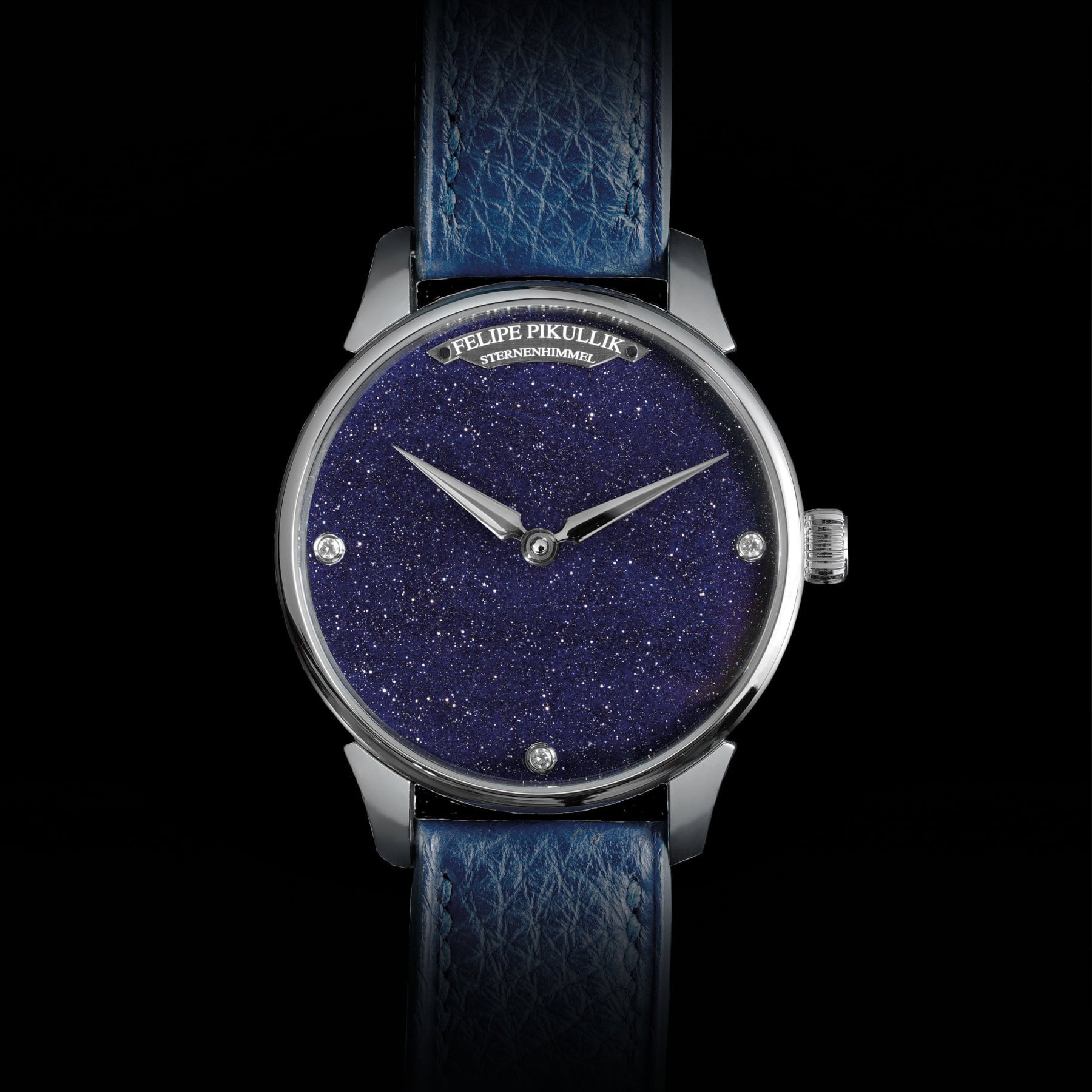 The Sternenhimmel is a masterpiece of watchmaking that reflects Felipe Pikullik’s passion for astronomy and precision. This extraordinary timepiece captivates with its mesmerizing dial made of deep blue aventurine glass/green aventurin stone, adorned with sparkling crystals that create a realistic starry sky effect. The combination of technical sophistication and aesthetic elegance makes the Sternenhimmel a truly unique work of art. Every detail, from the meticulously crafted finishes to the hand-made components, showcases exceptional craftsmanship and Felipe Pikullik’s vision of bringing the magic of the cosmos into the art of watchmaking.