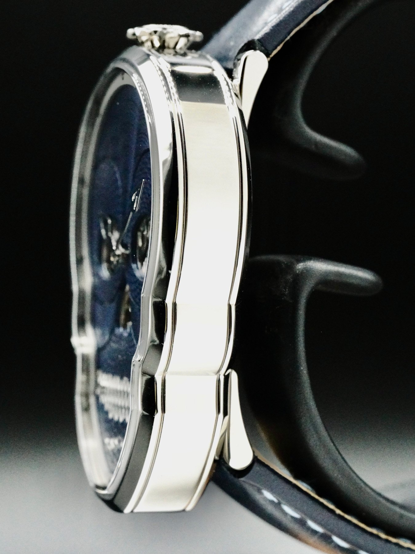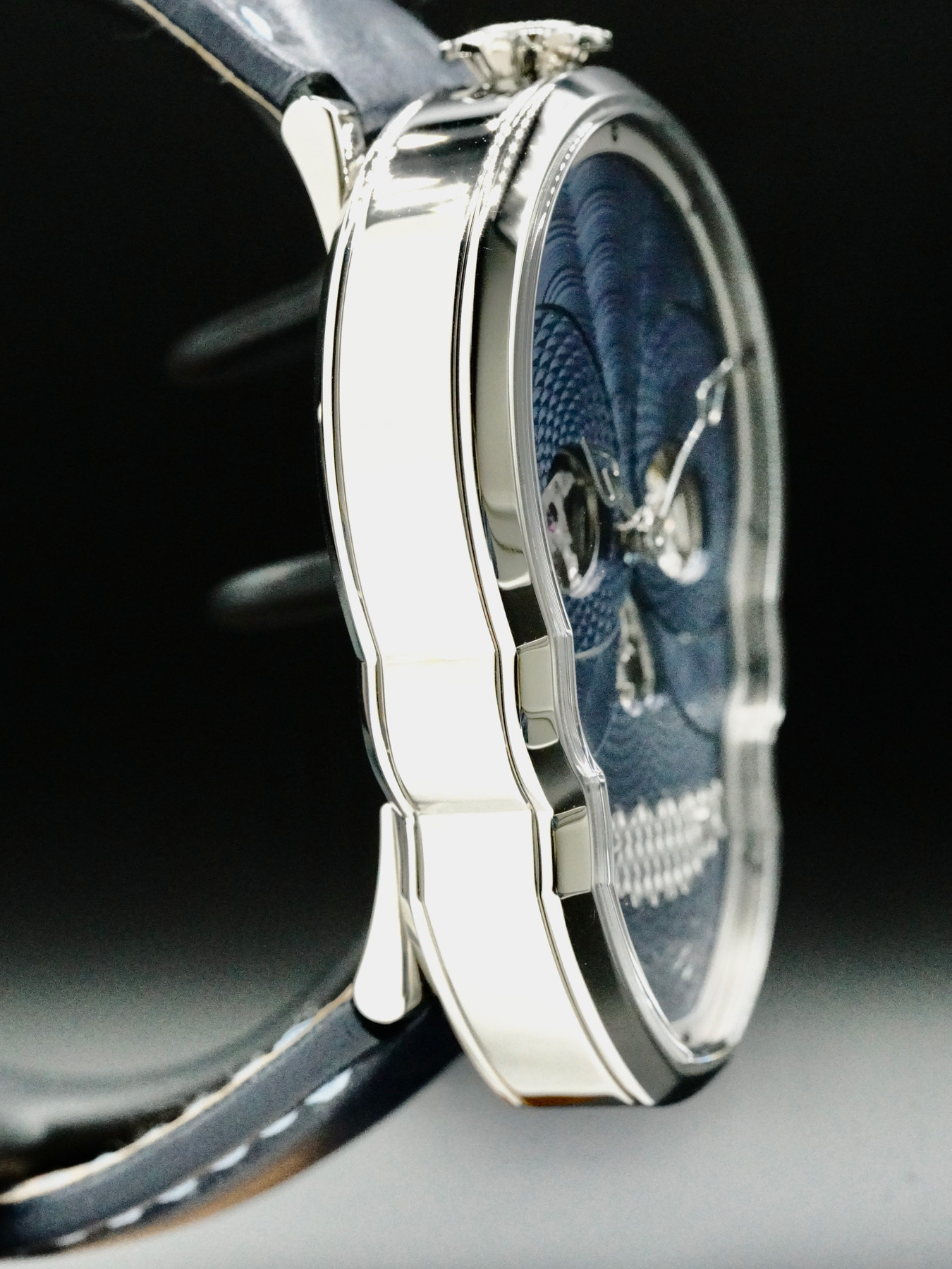 This watch is produced as a limited edition of 18 pieces; each one hand-made in Switzerland and powered by a Swiss mechanical automatic movement, fully skeletonised with a custom guilloche oscillating mass.