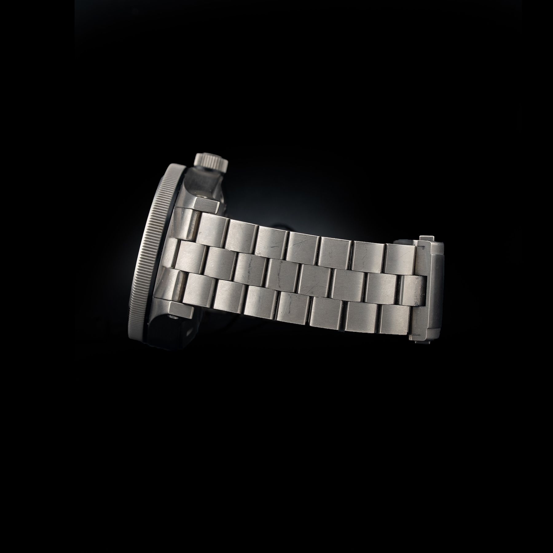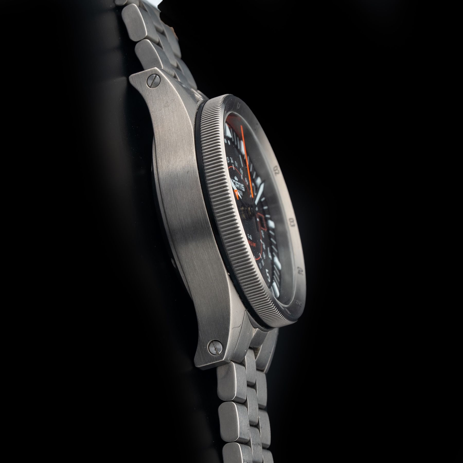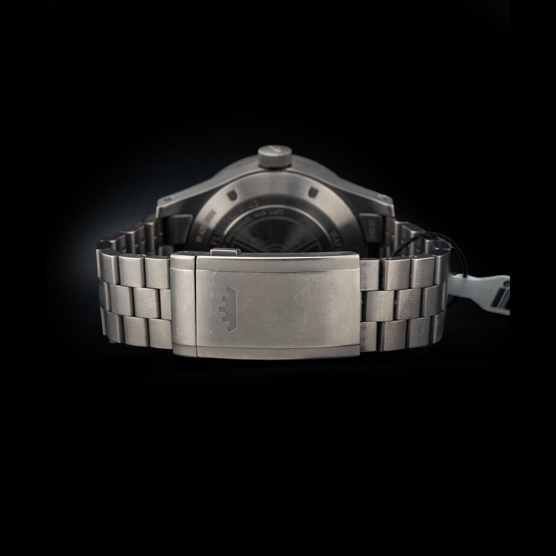 This watch features a 43mm titanium case on titanium bracelet. This watch also sports a black dial. Powered by an automatic movement. Water resistance up to 200 meters.