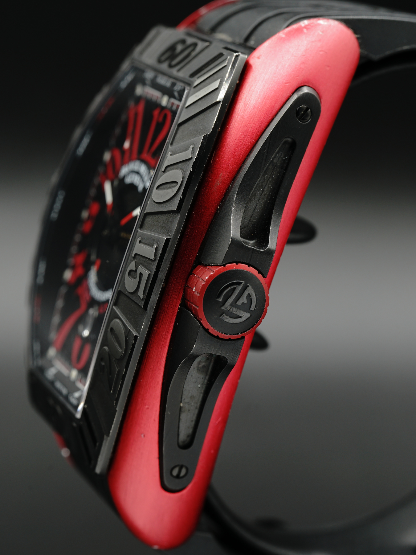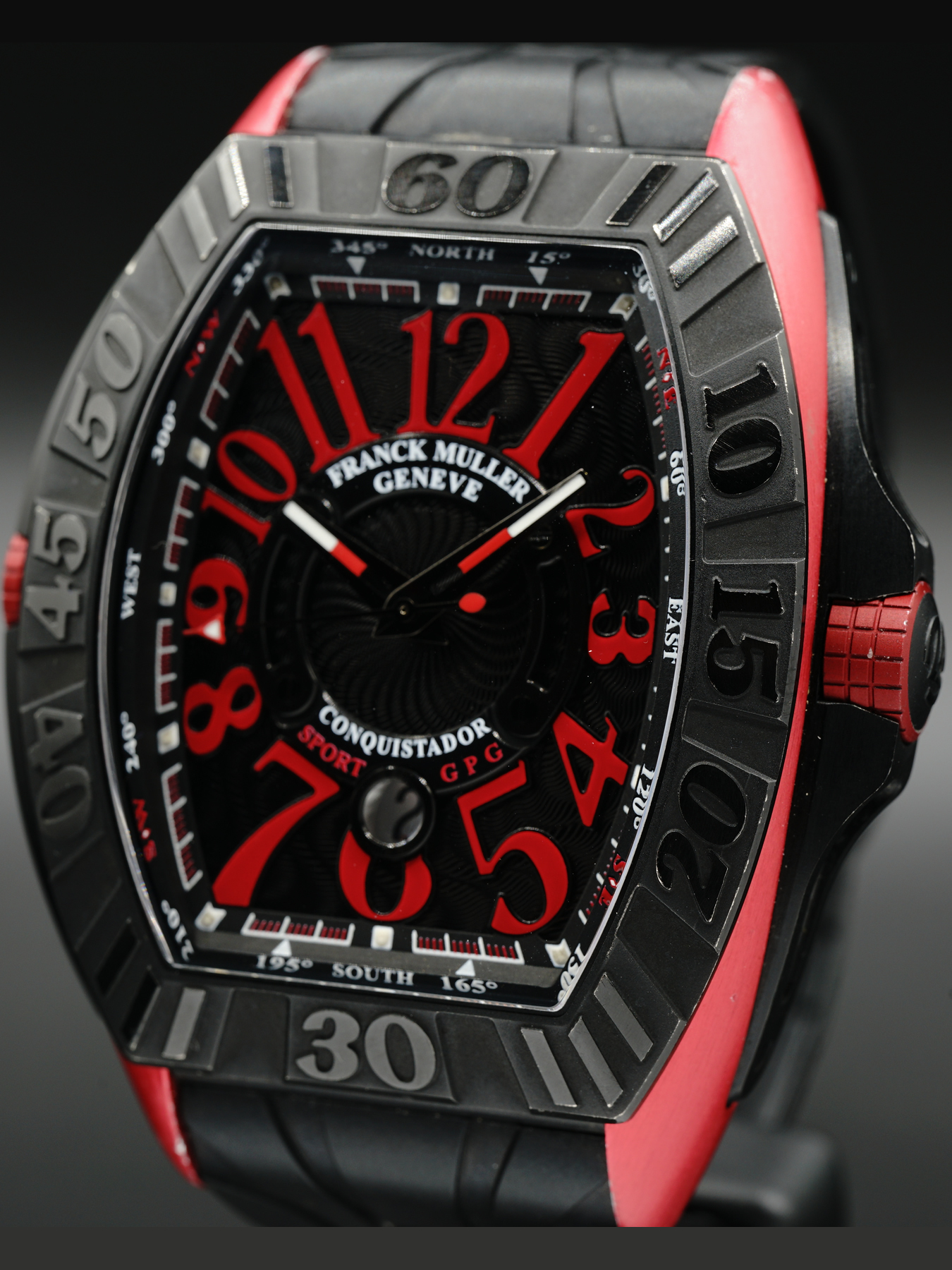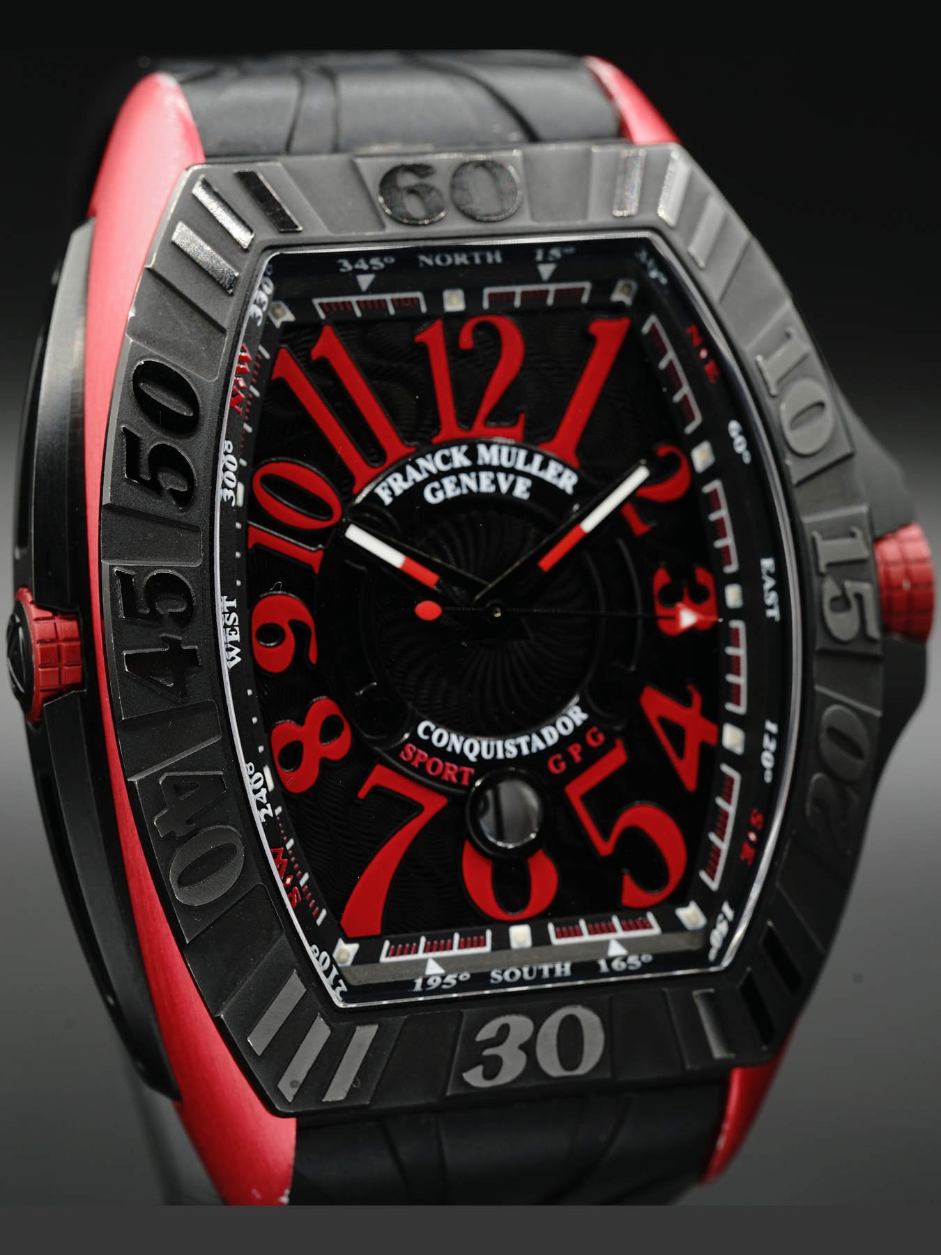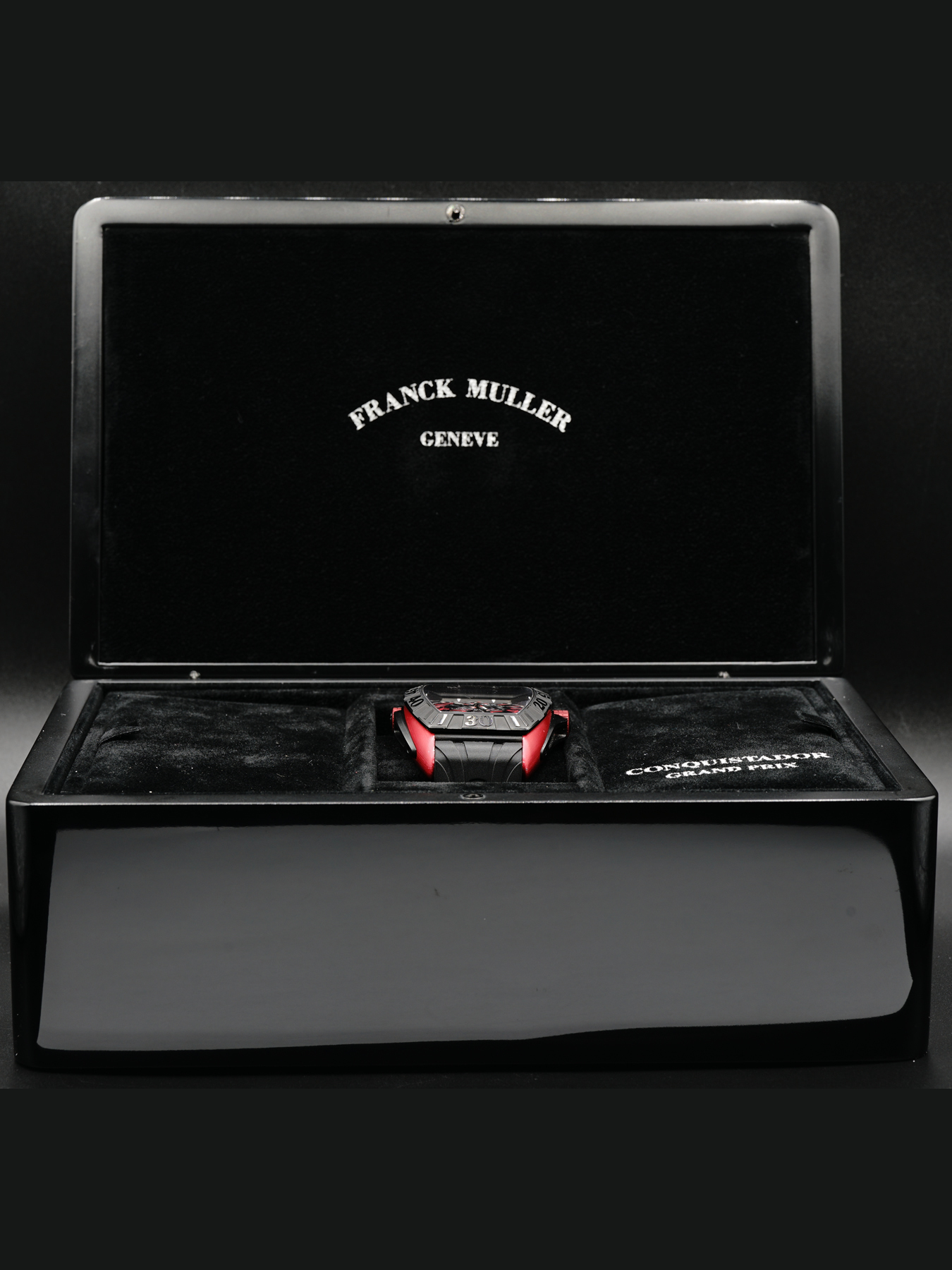 This Franck Muller Conquistador Grand Prix is in good condition with just a few small signs of normal wear and tear. This watch features a black aluminum case with a black leather strap. Fixed black aluminum bezel. This specific watch includes its original box, papers, and certificate of origin dated for July 2015.