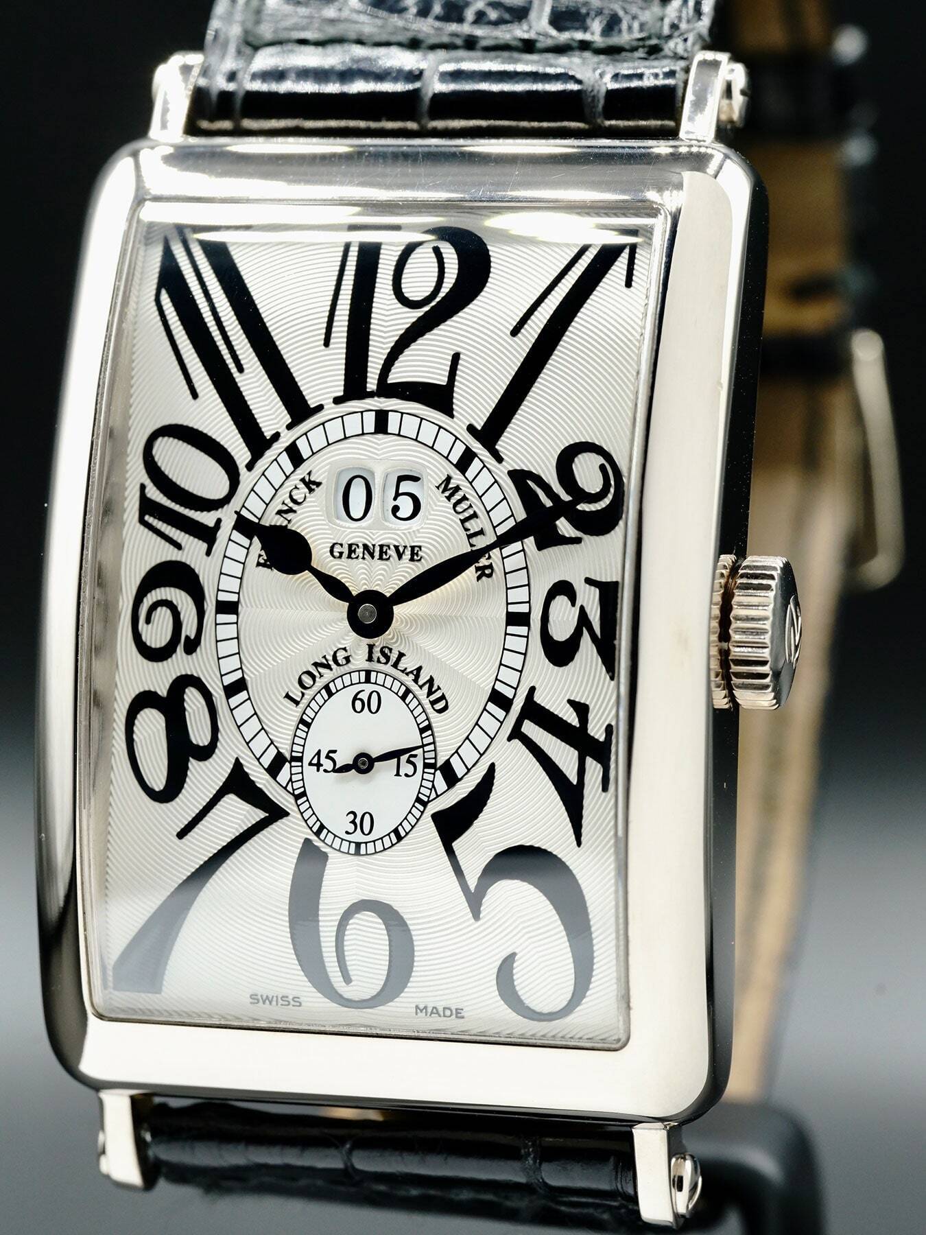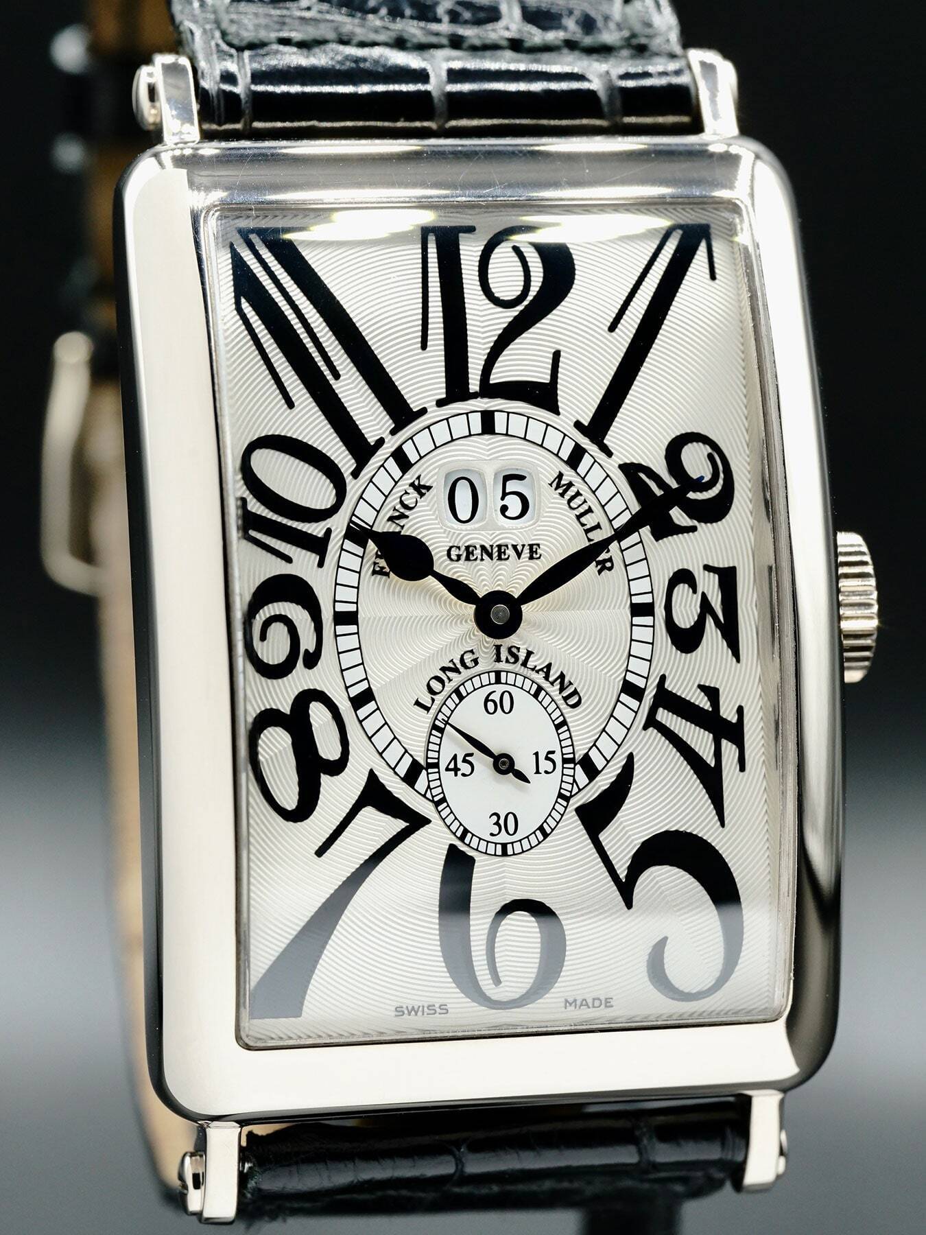 This Franck Muller Long Island Big Date features a 32mm x 55mm 18k white gold case with a solid case back on a black leather strap. This watch also showcases a silver dial with blued-steel hands, Arabic numerals, small seconds sub dial, and big date display covered by scratch resistant sapphire crystal.