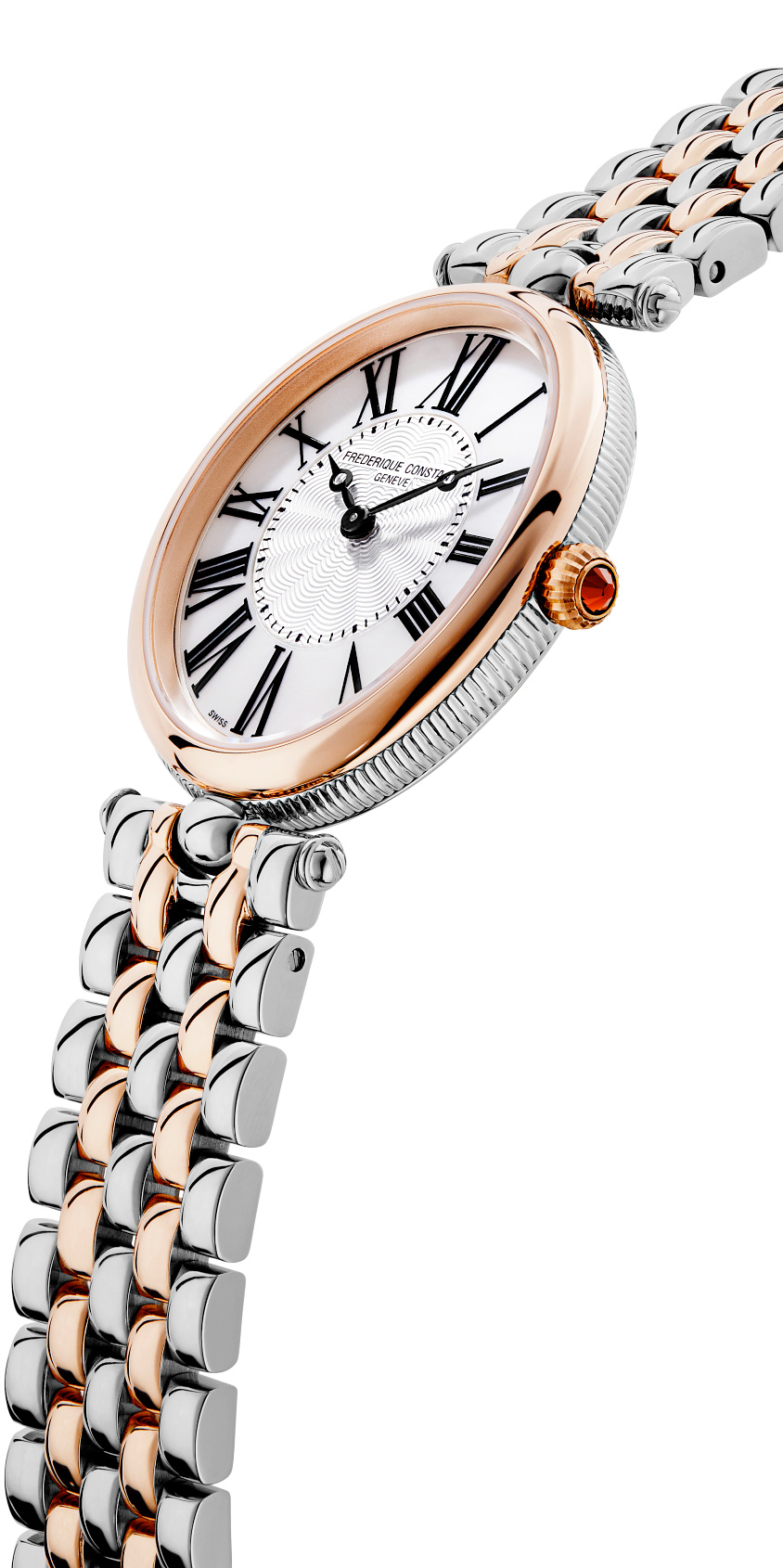 The delicate oval shape of the case emphasizes the intense details of the guilloché decoration. The intricate fluted case band, along with its refined crown embellished with a cabochon, makes this watch the perfect daily companion. Art Deco celebrates femininity