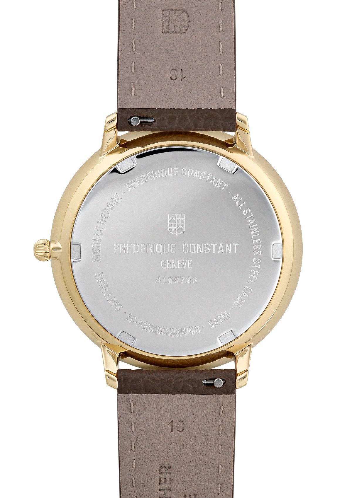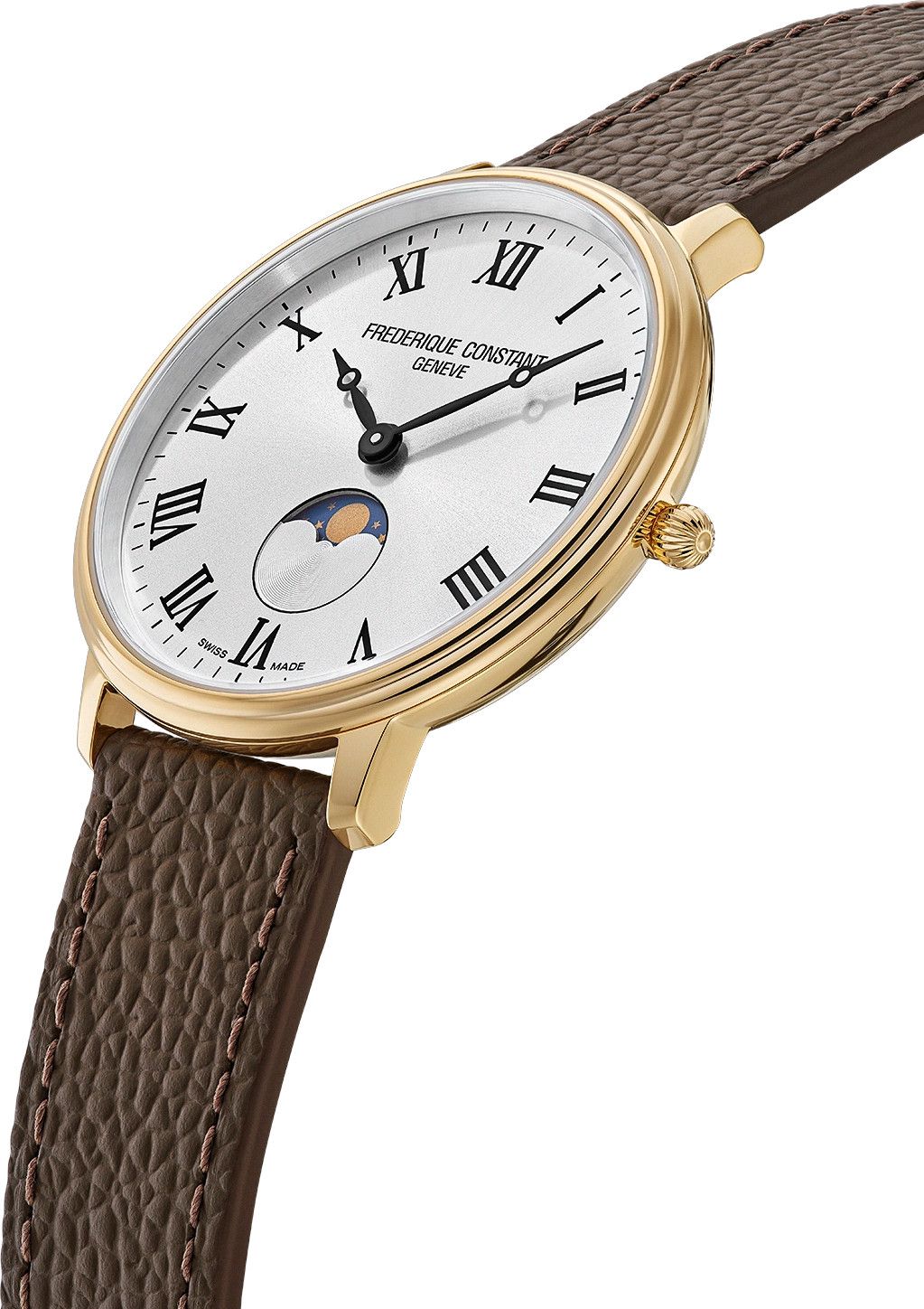 Discover the Classics Quartz Moonphase watch, a timepiece that combines classic sophistication with poetic functionality. Its three-part case, polished yellow gold-plated and 39 mm in diameter, houses the FC-206 quartz movement, equipped with 5 jewels and offering an impressive battery life of 60 months. The silver dial, enhanced by a sunray finish, is adorned with printed black Roman numerals and elegant black hour and minute hands. The moon phase complication, positioned at 6 o’clock, adds a celestial touch to the design. Protected by a convex anti-reflective sapphire crystal and water-resistant to 5 ATM (50m/165ft), this watch is completed by a dark brown calfskin leather strap embossed with a grained pattern, fastened with a pin buckle, ensuring distinctive comfort and style for all occasions.