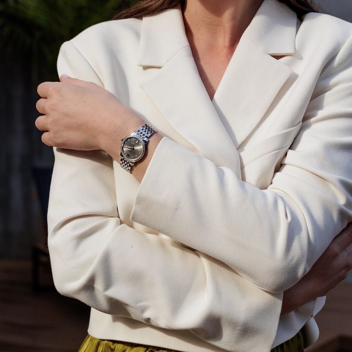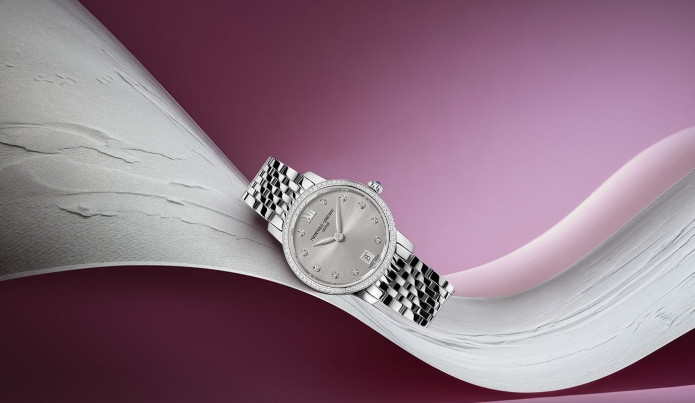 With a delicate 30mm diameter, the Classics Slimline Ladies has been designed to emphasize the soft curves of the wrist with harmony and sensitivity. Polished stainless steel 3-part case with 68 diamonds on the bezel and 10 diamond indexes (0.59 total carat). The light brown dial with sunray finishing make this timepiece stand out with grace and elegance.