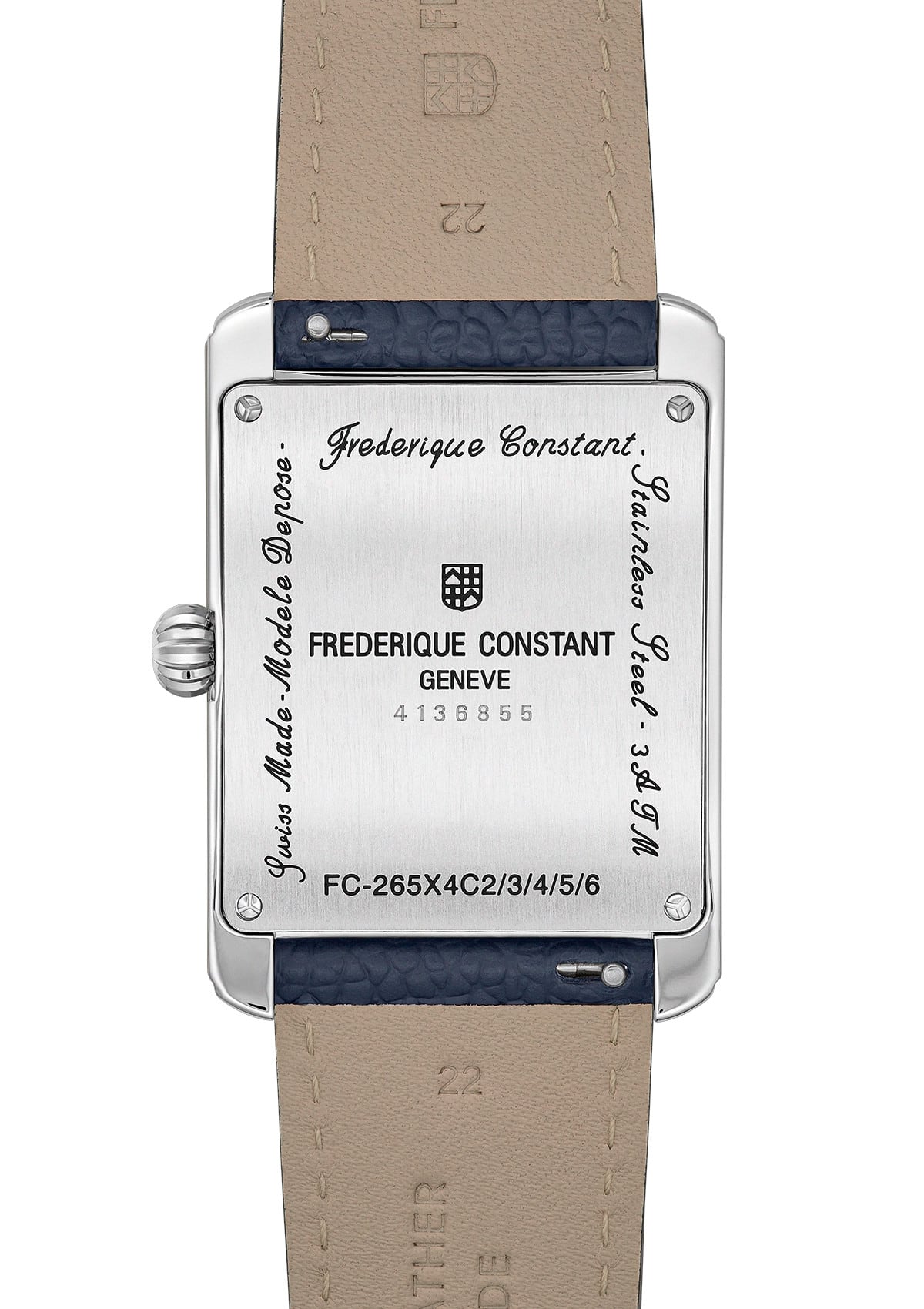 Discover the Classics Carrée Moonphase watch, a timepiece that combines distinctive square aesthetics with remarkable functionality. Its polished stainless steel case, measuring 42.30 x 30 mm, houses the FC-265 quartz movement, offering hours, minutes, seconds, date, day, month and a poetic moon phase, all with an impressive battery life of 60 months. The silver dial, enhanced by a sunray finish and an embossed central motif, is complemented by silver hour markers and hands, ensuring clear readability of the various complications. Protected by a convex anti-reflective sapphire crystal and water-resistant to 3 ATM (30m/100ft), this watch is completed by a blue calfskin leather strap with a grained pattern, fastened by a pin buckle, offering refined comfort and style for all occasions.