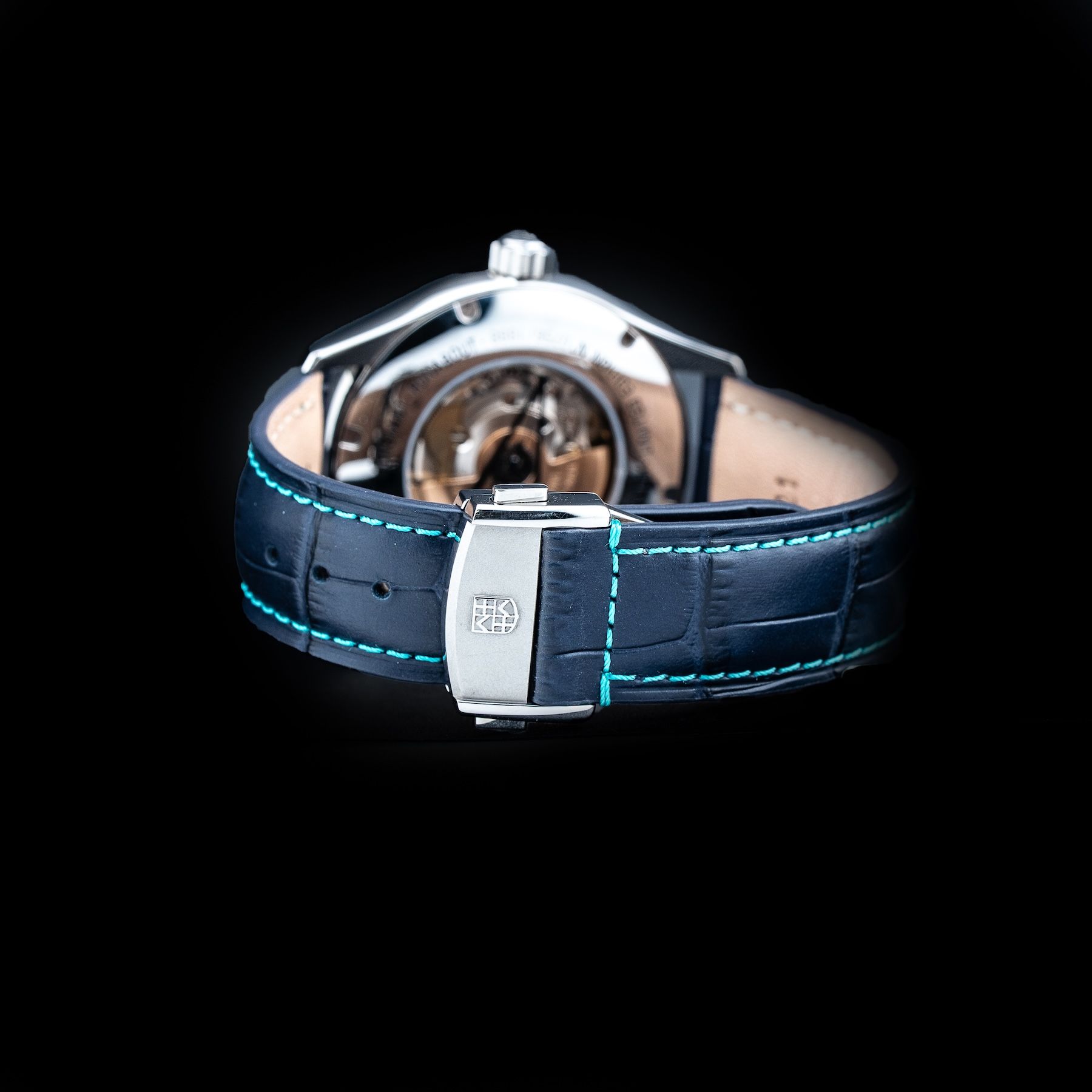 This watch features a 42mm stainless steel case on leather strap. This watch also sports a silver-tone dial. Powered by a mechanical automatic movement. Water resistance up to 100 meters.