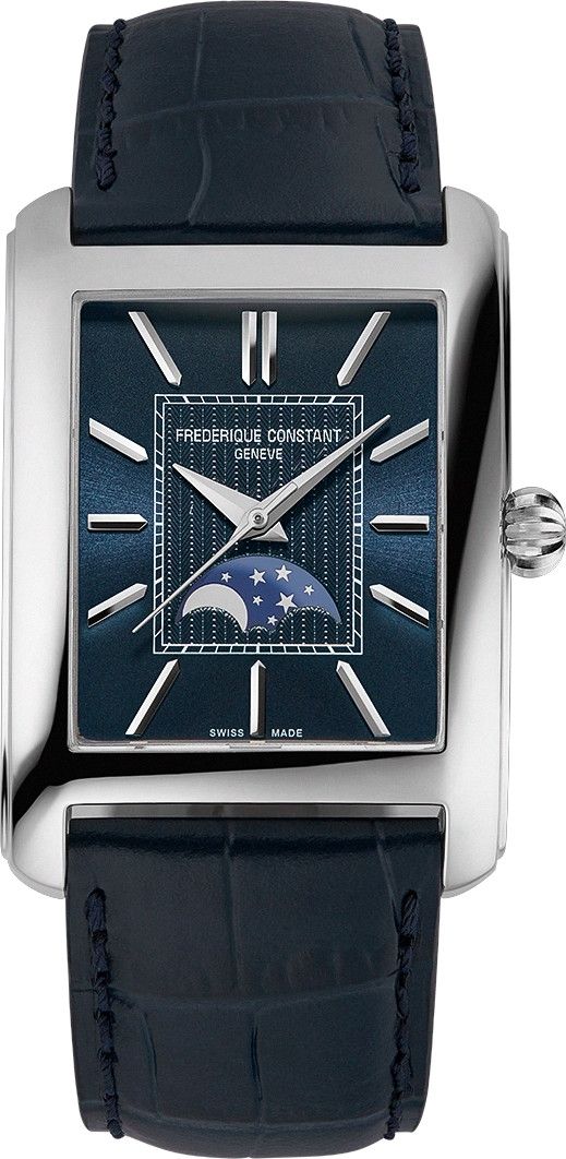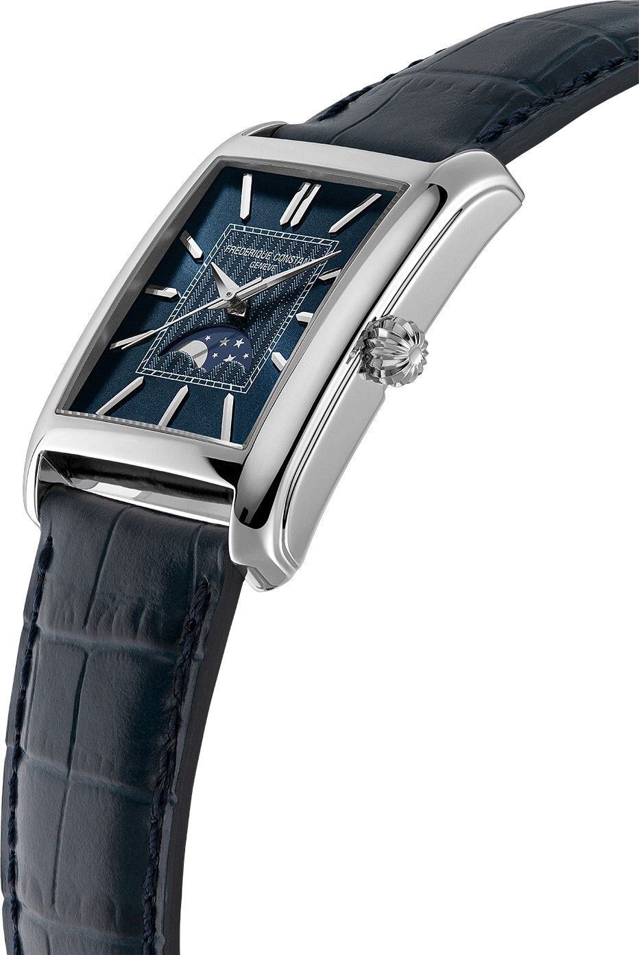 Immerse yourself in the Art Deco design of the 1920s and 1930s with the Classics Carrée Moonphase Automatic. For the first time, this iconic model reveals the poetic complication of the moon phase alone at 6 o’clock. Its rectangular polished steel case frames a hypnotic navy blue sunray dial enhanced with a delicate chevron guilloché pattern. In the centre, the moon and stars are displayed against a mesmerising astral blue background. Powered by the FC-333 automatic calibre, it is the embodiment of timeless elegance.